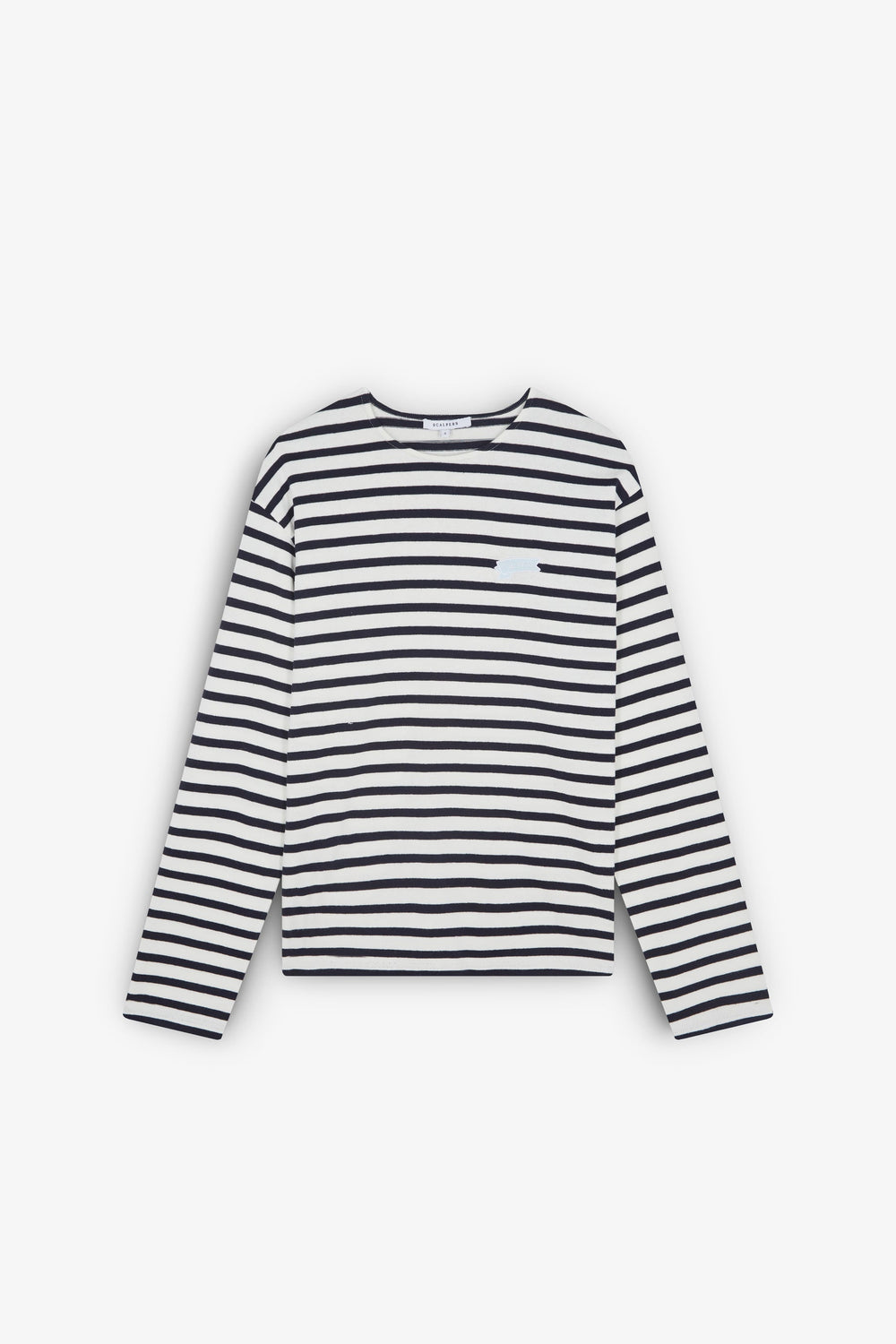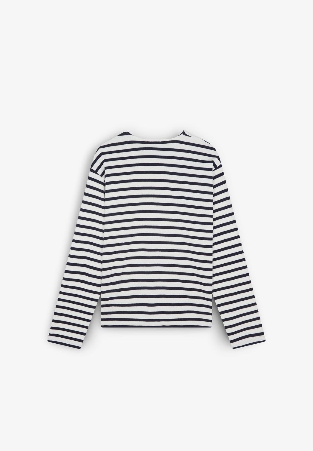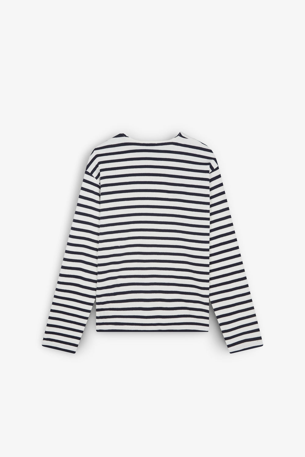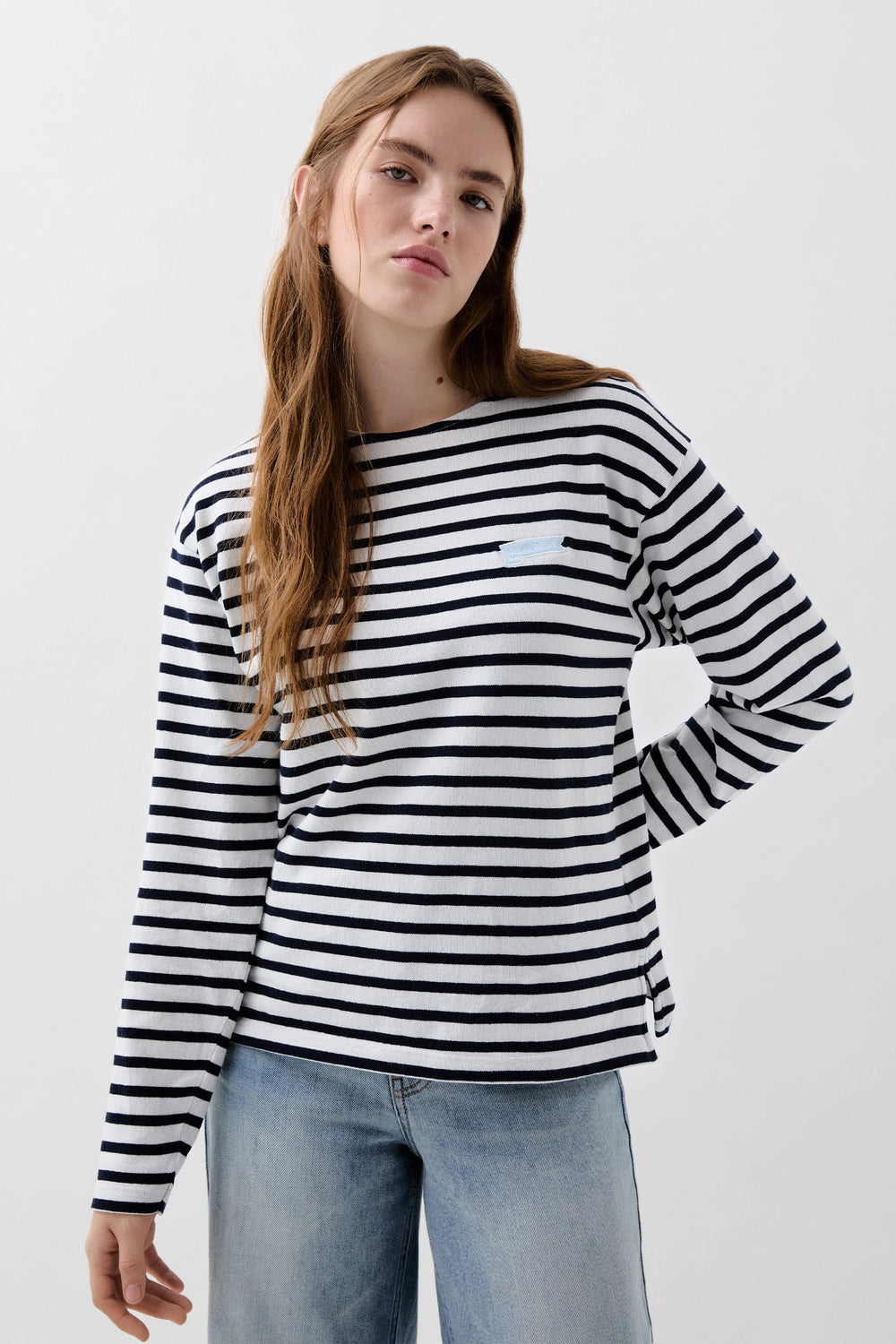 Camiseta de rayas confeccionada en 100% algodón BCI. Regular fit, cuello redondo y manga larga.