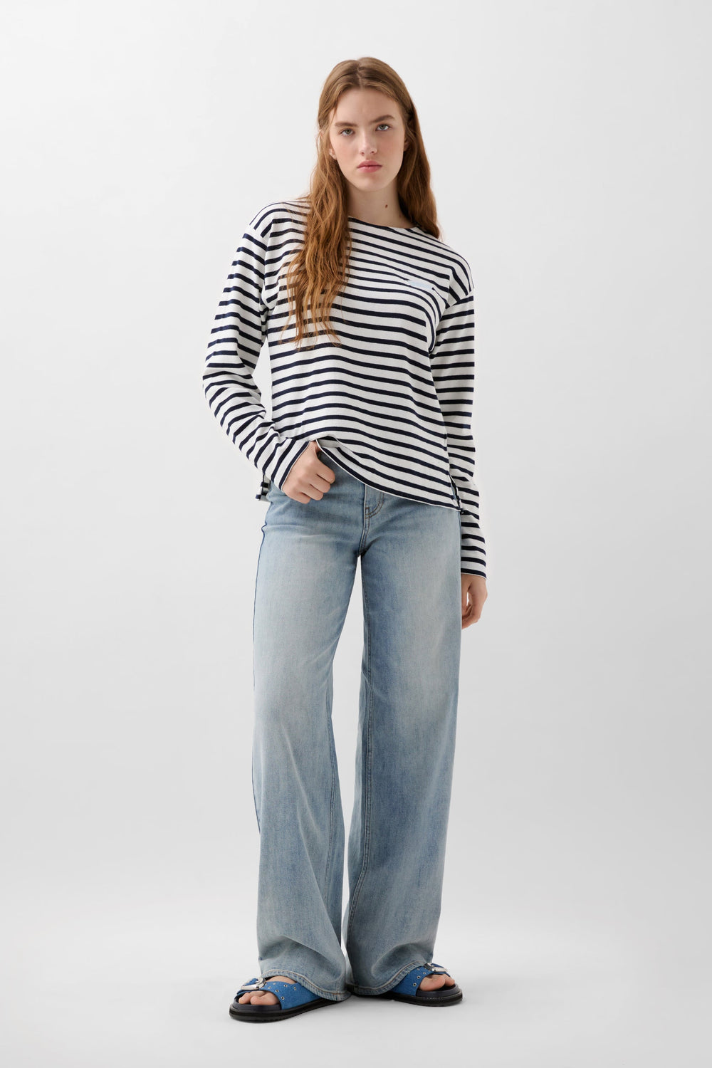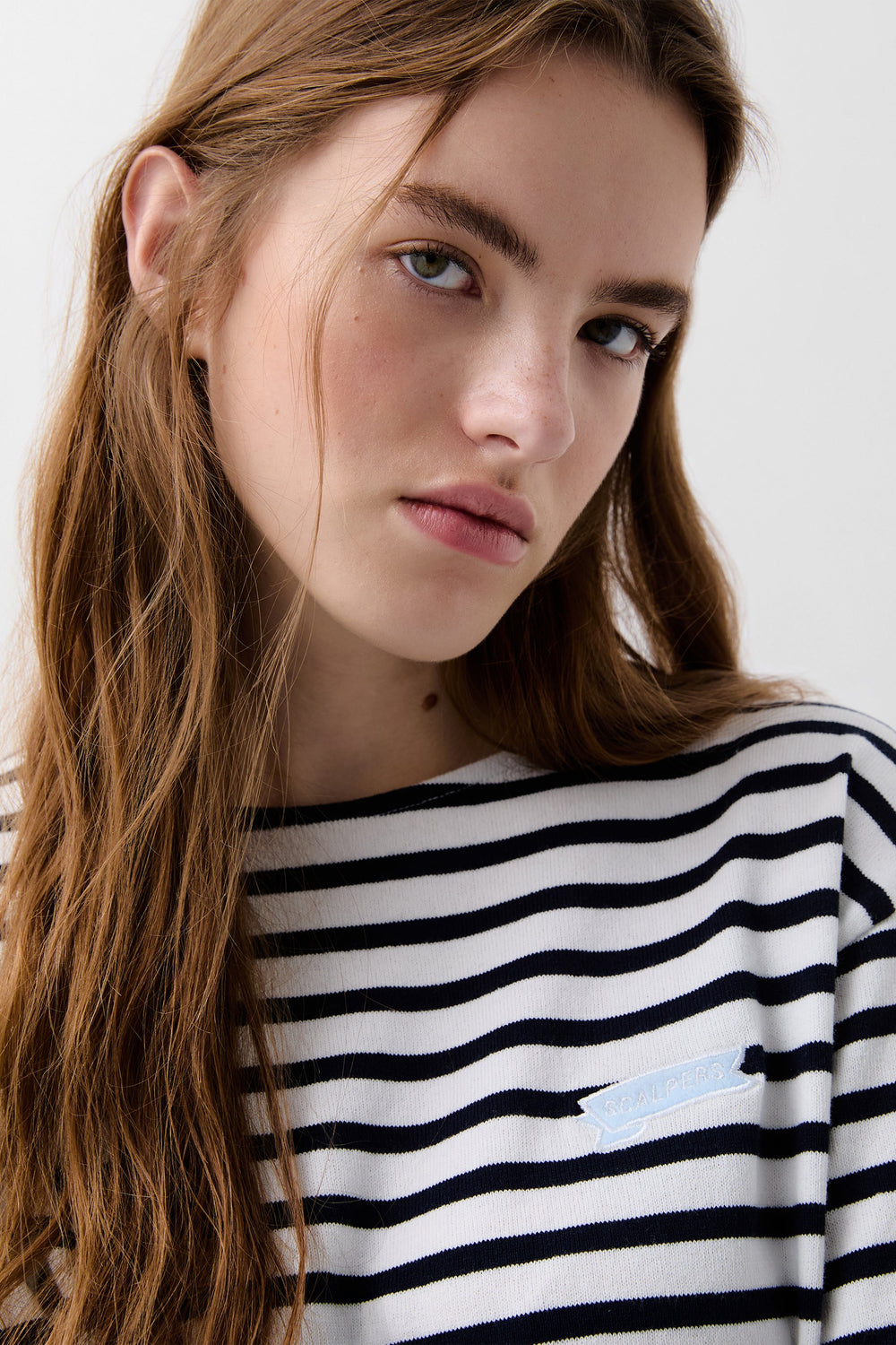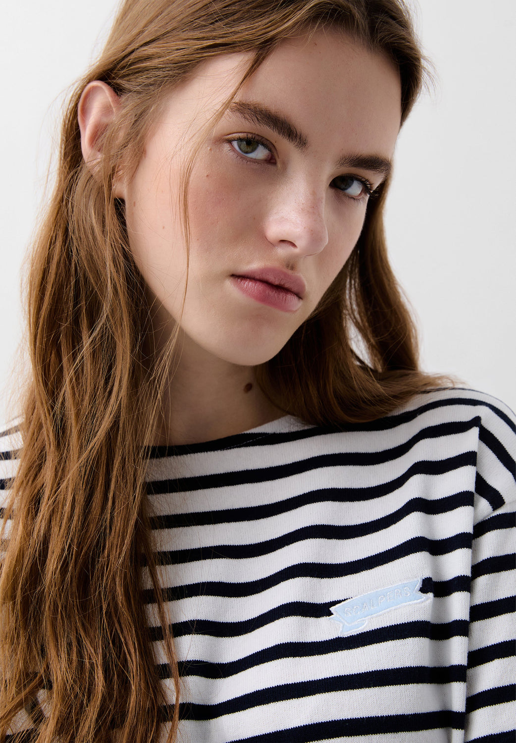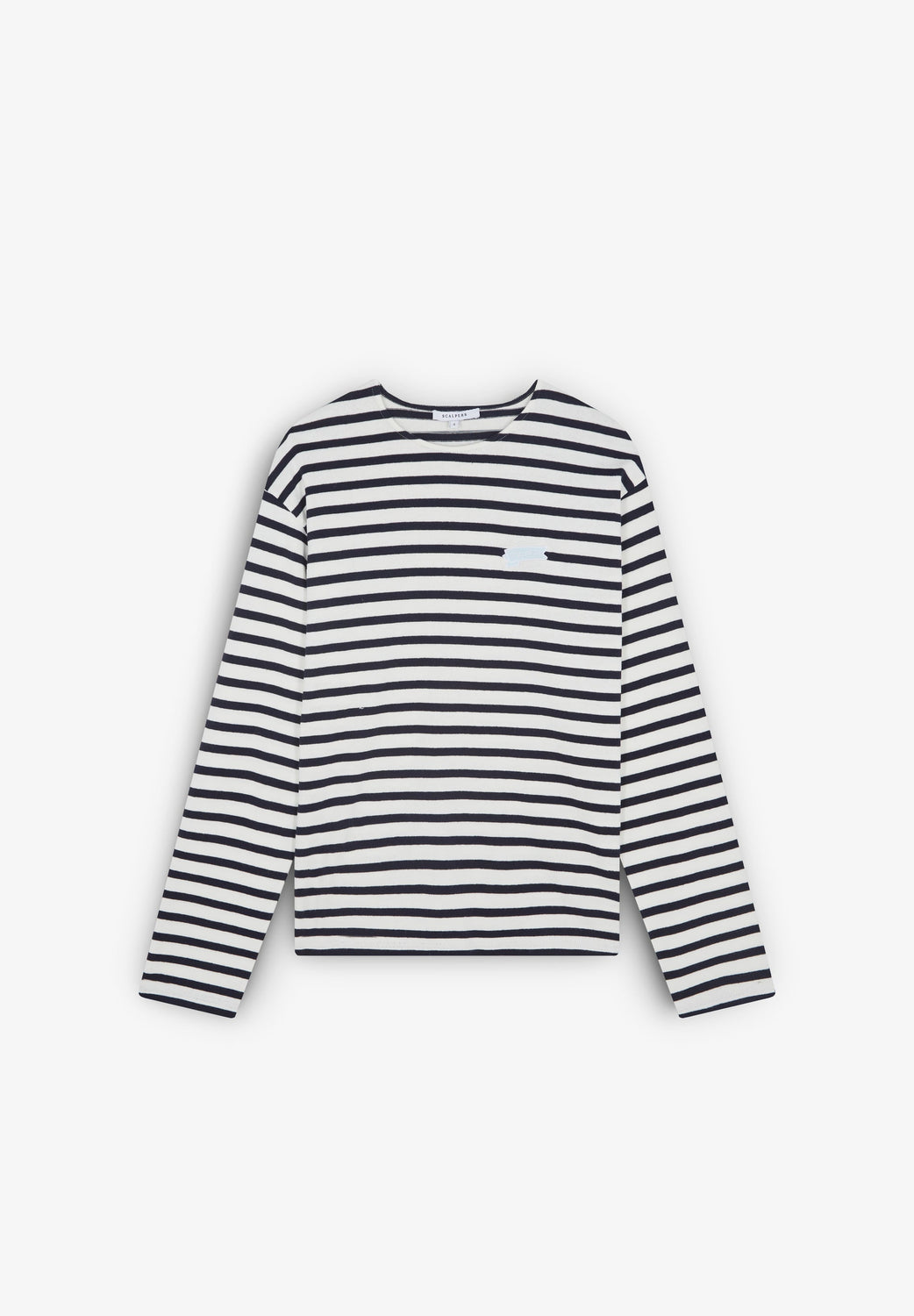 Camiseta de rayas confeccionada en 100% algodón BCI. Regular fit, cuello redondo y manga larga.