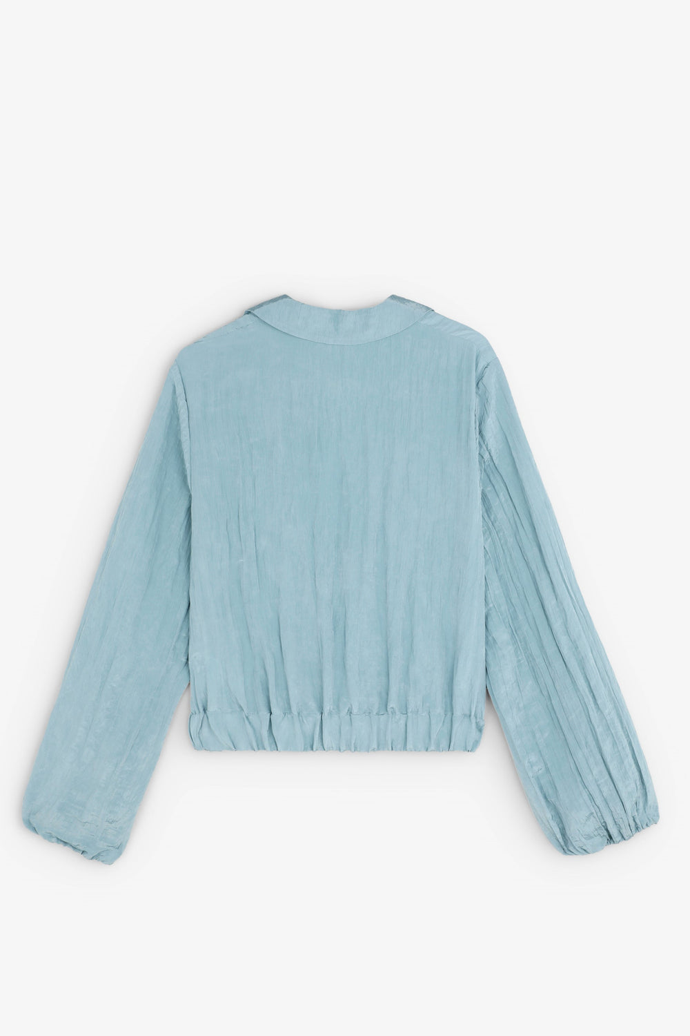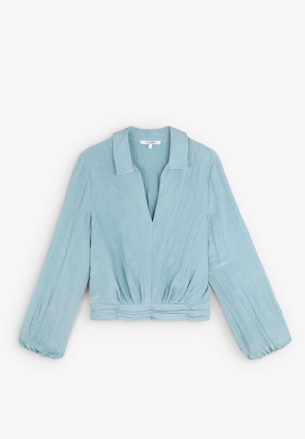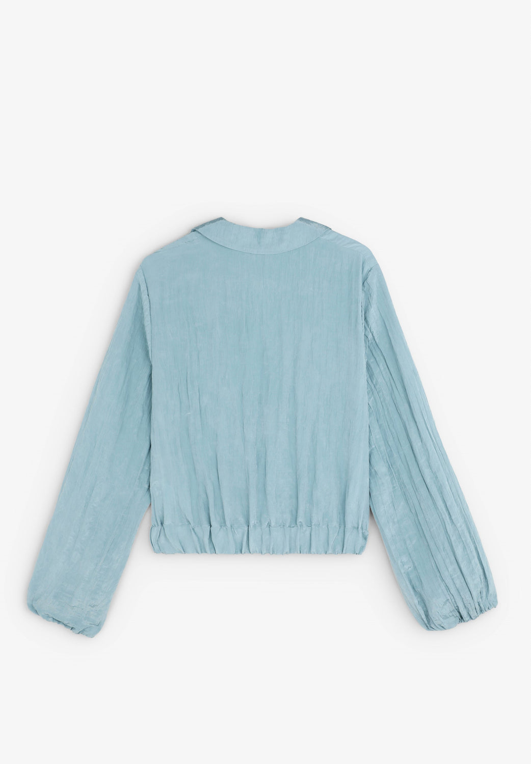 Blusa confeccionada en tejido fluido con textura. Corte regular fit, cuello camisero con abertura en escote. Manga larga ligeramente abullonada y frunce en cintura con elástico trasero.