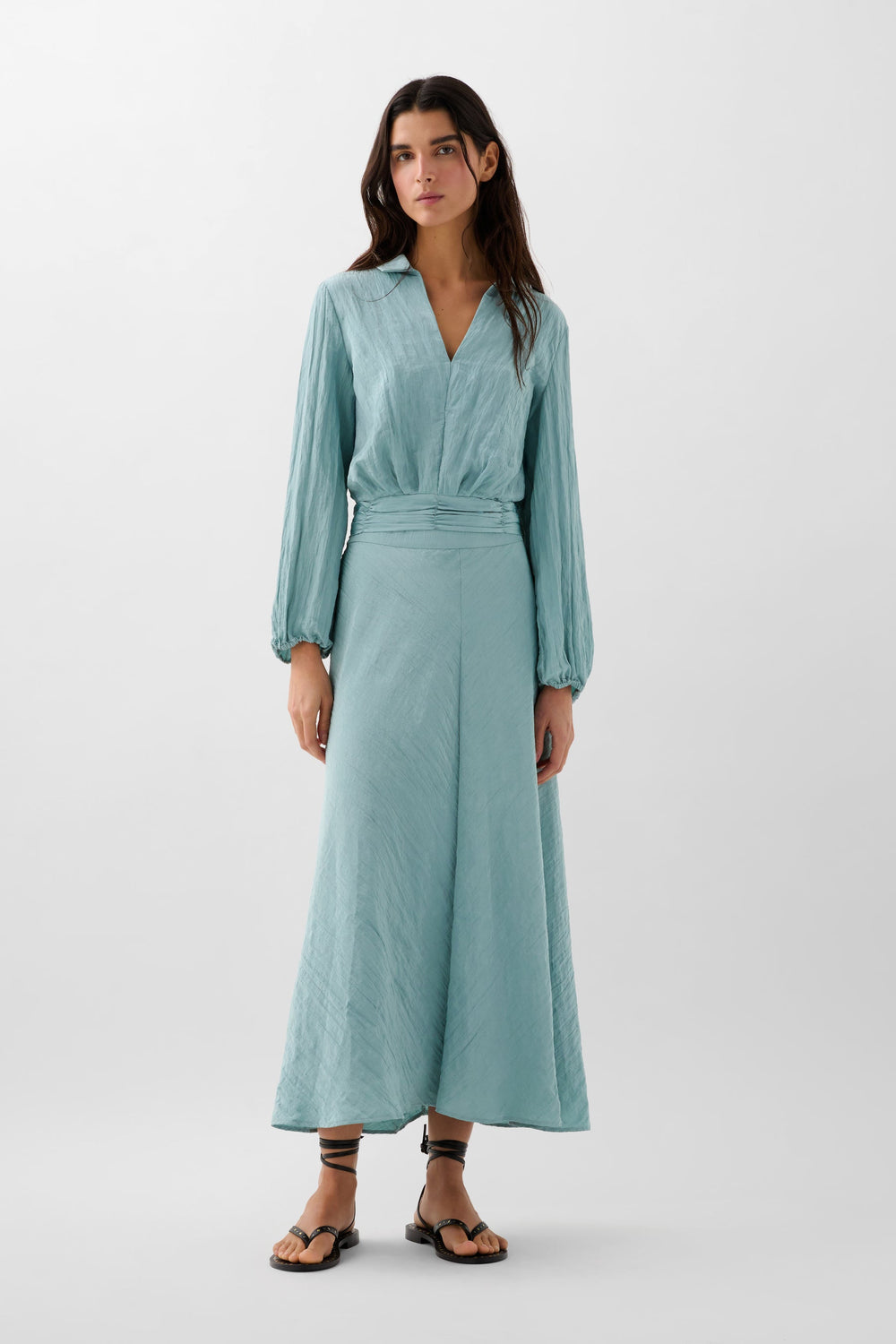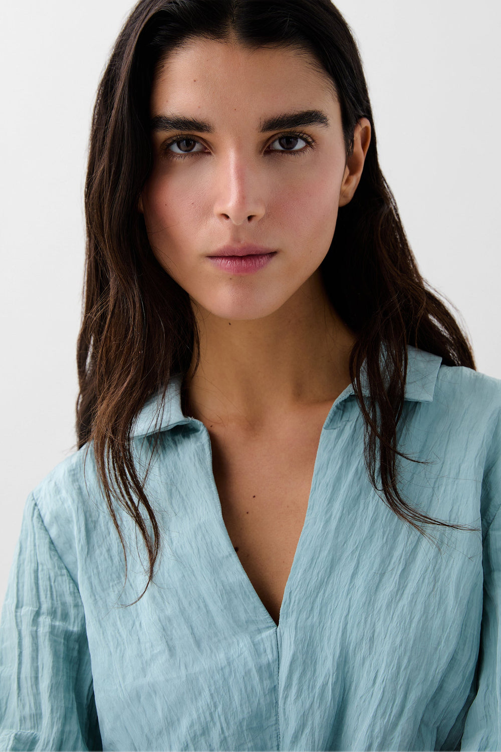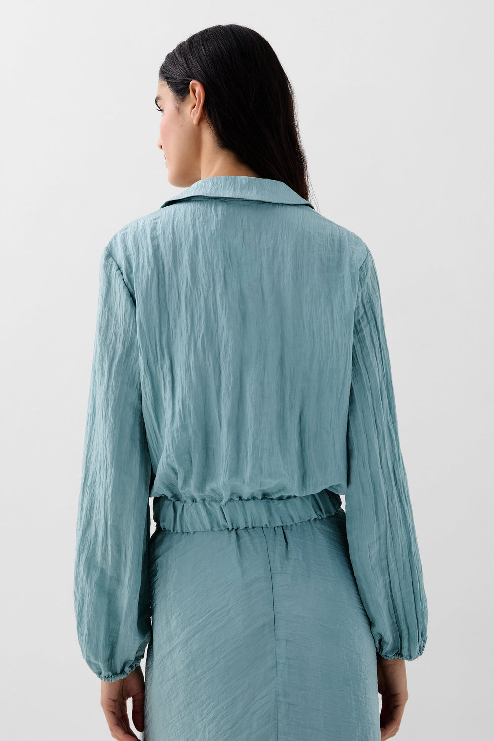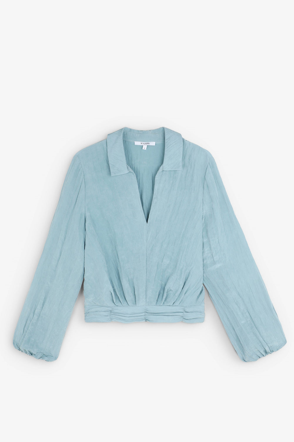 Blusa confeccionada en tejido fluido con textura. Corte regular fit, cuello camisero con abertura en escote. Manga larga ligeramente abullonada y frunce en cintura con elástico trasero.
