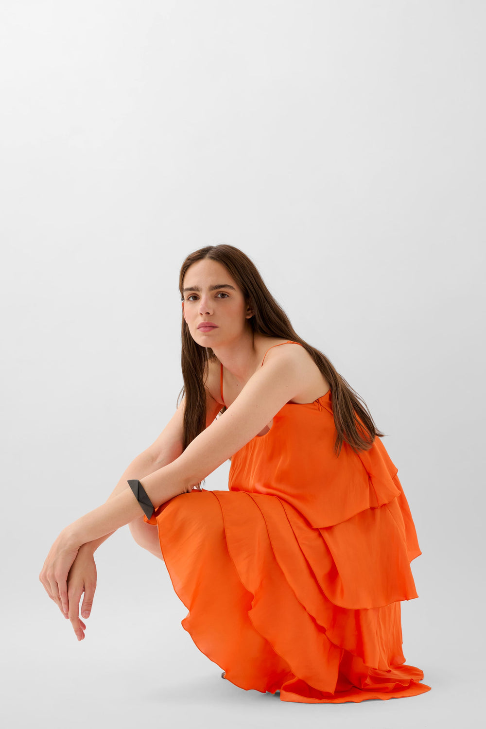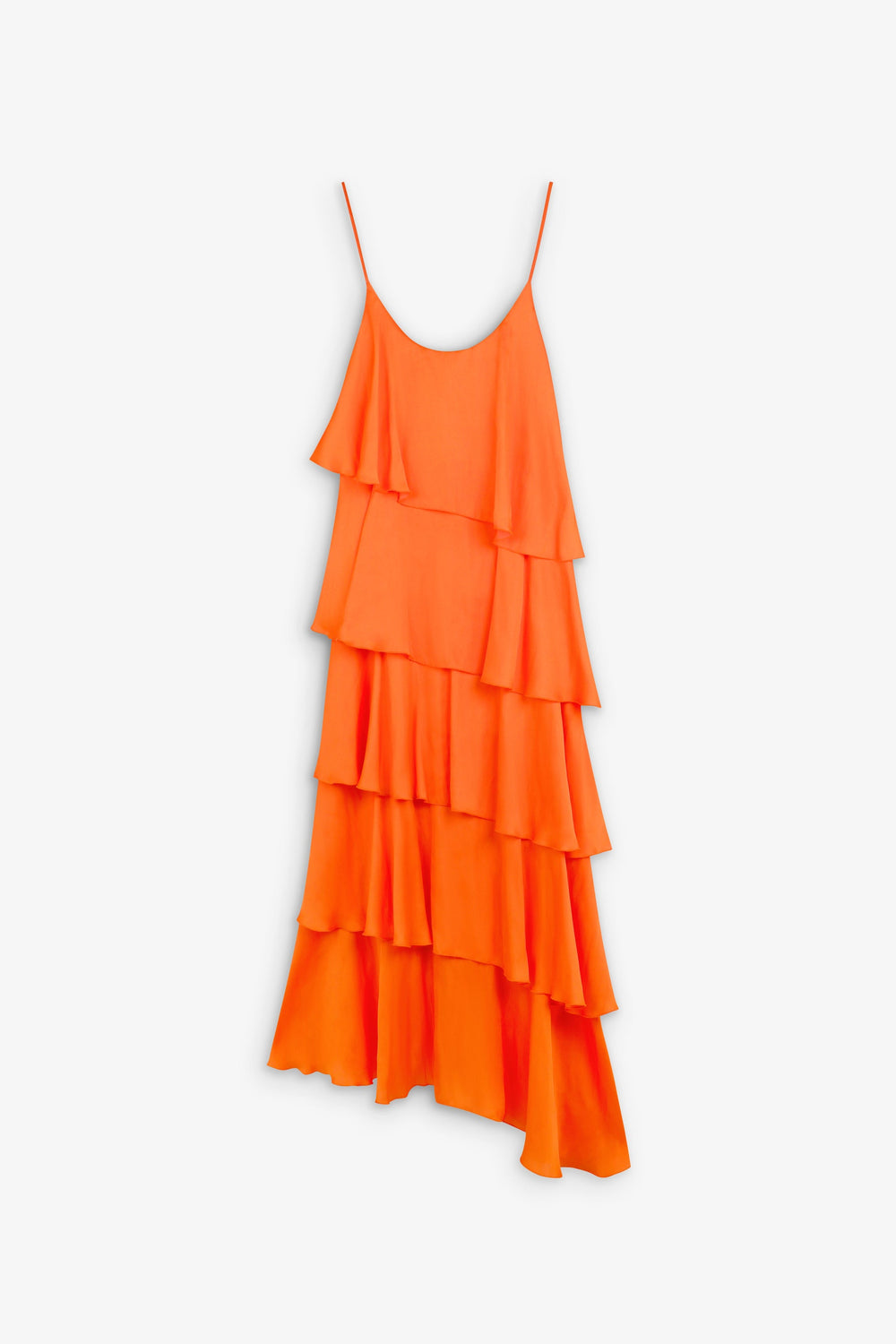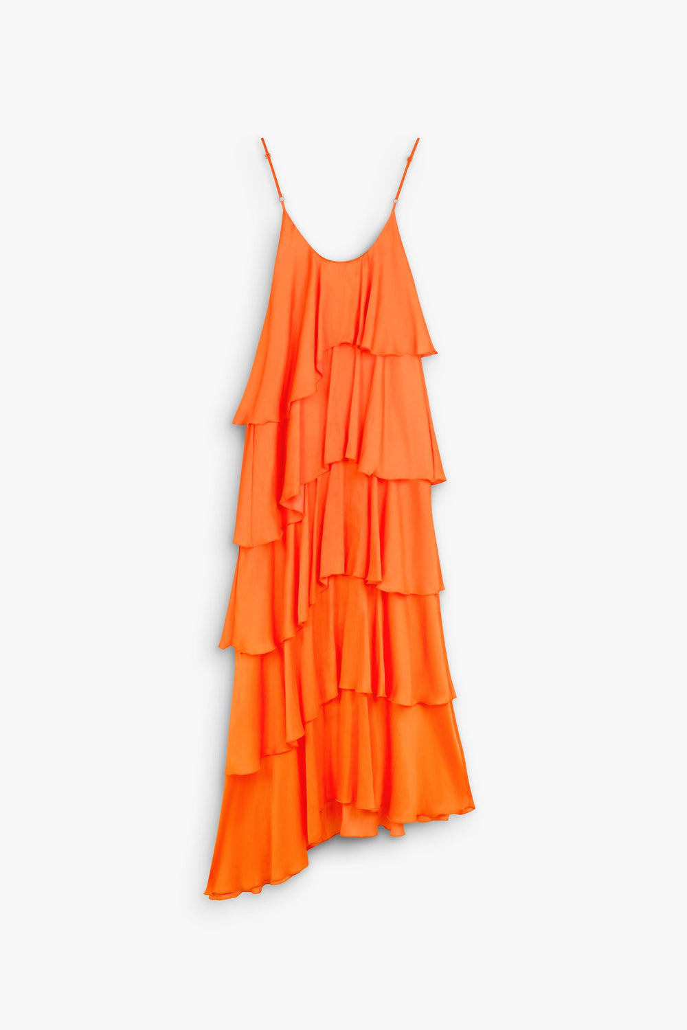 Vestido confeccionado en tejido fluido con volantes y bajo asimétrico. Tirantes finos, corte midi y escote redondo.
