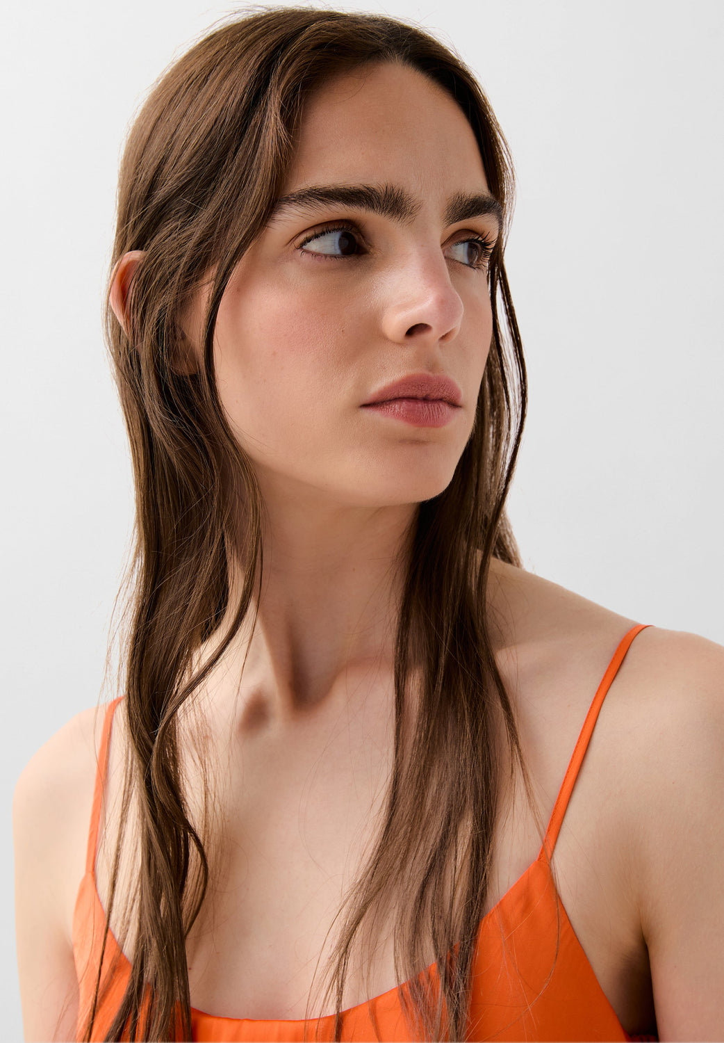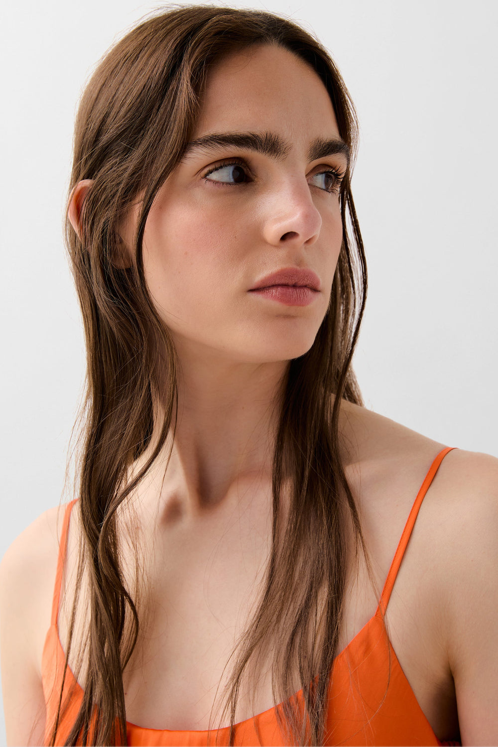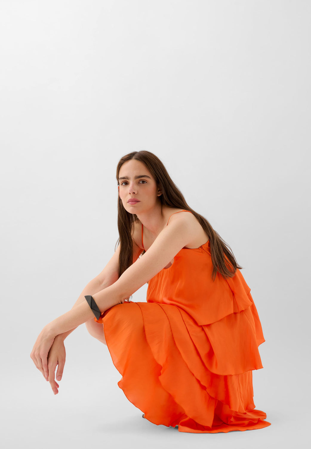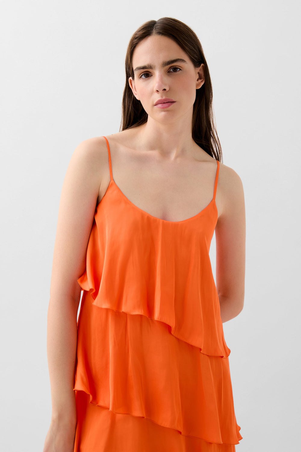 Vestido confeccionado en tejido fluido con volantes y bajo asimétrico. Tirantes finos, corte midi y escote redondo.