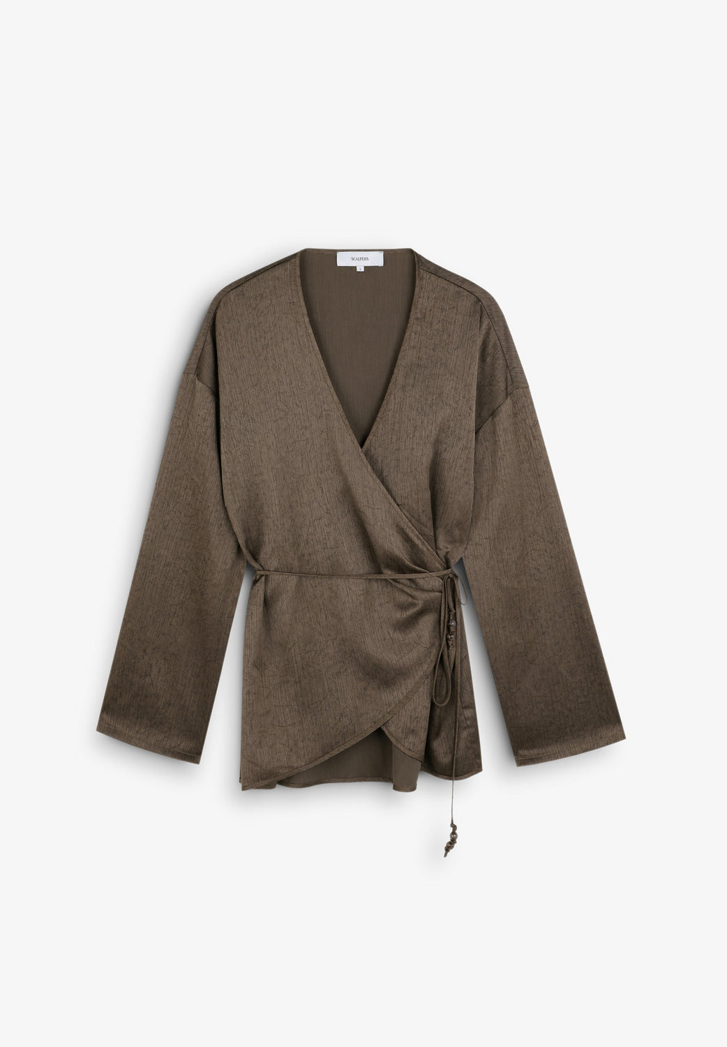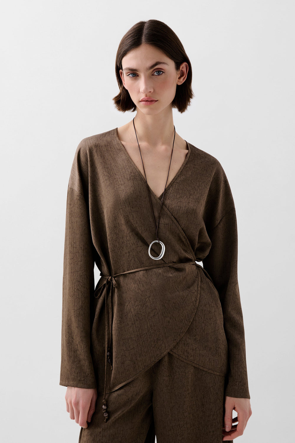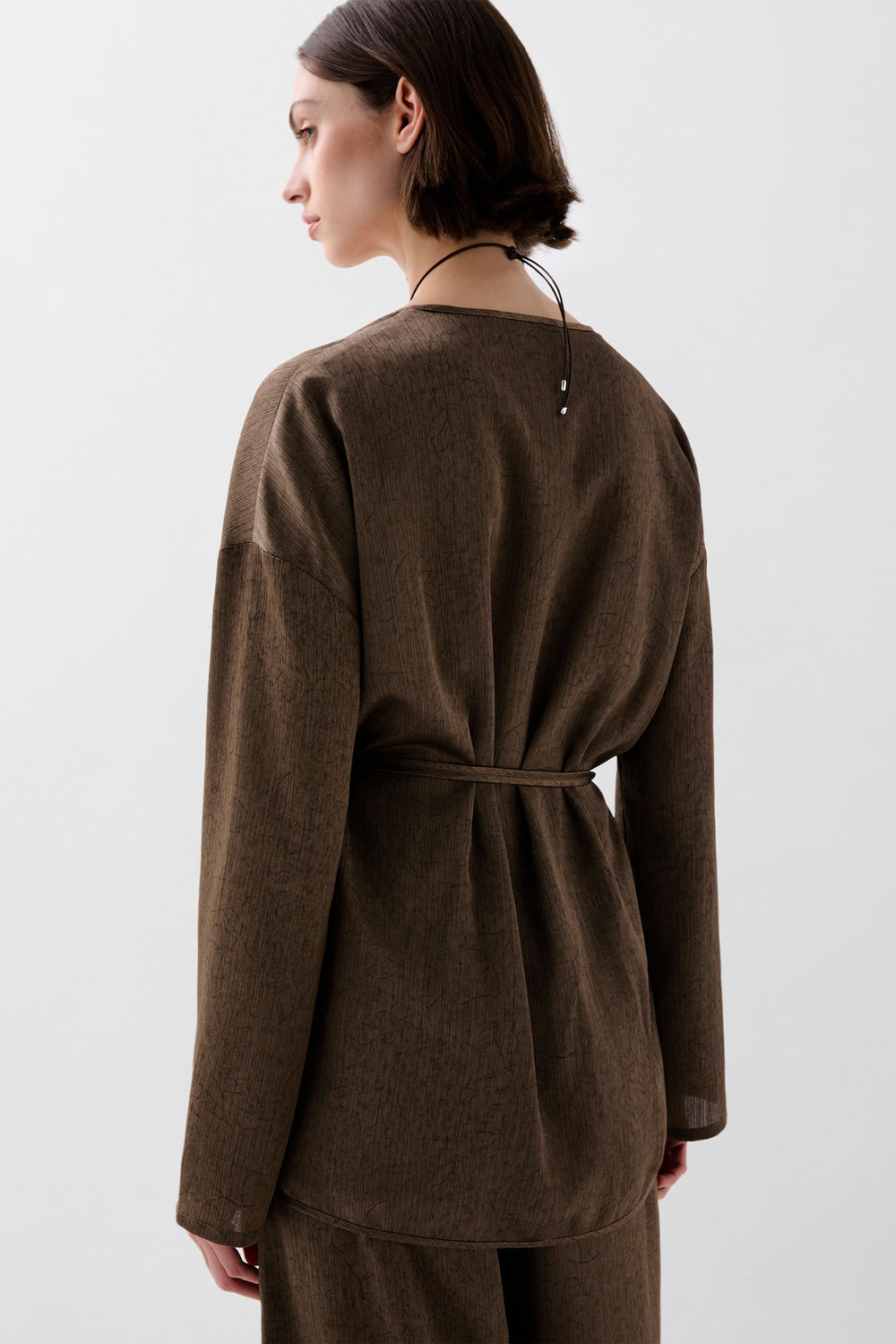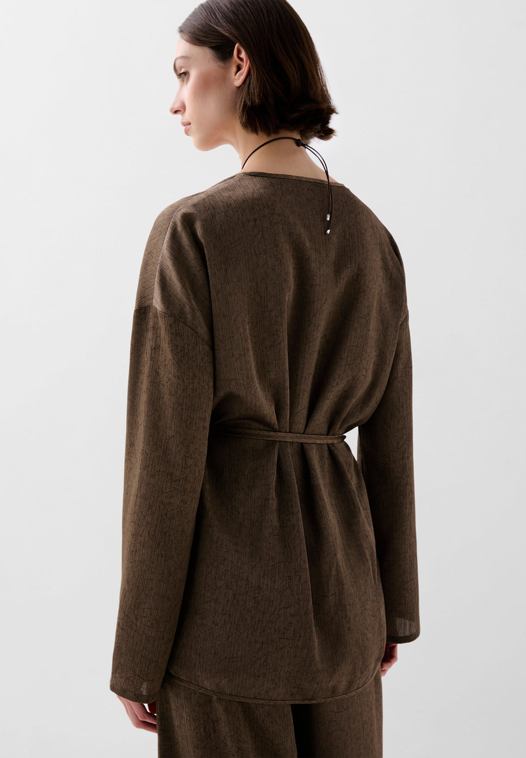 Kaftan asimétrico fluido de manga larga. Escote abertura en pico. Ajustable en cintura mediante cordón.