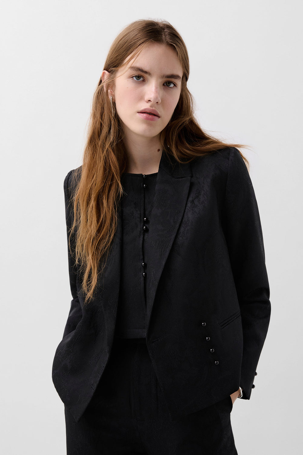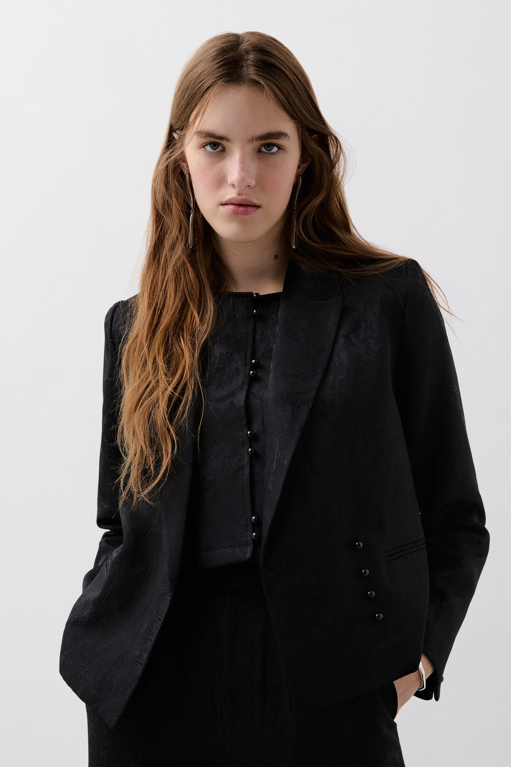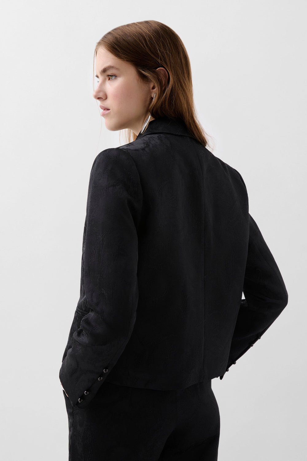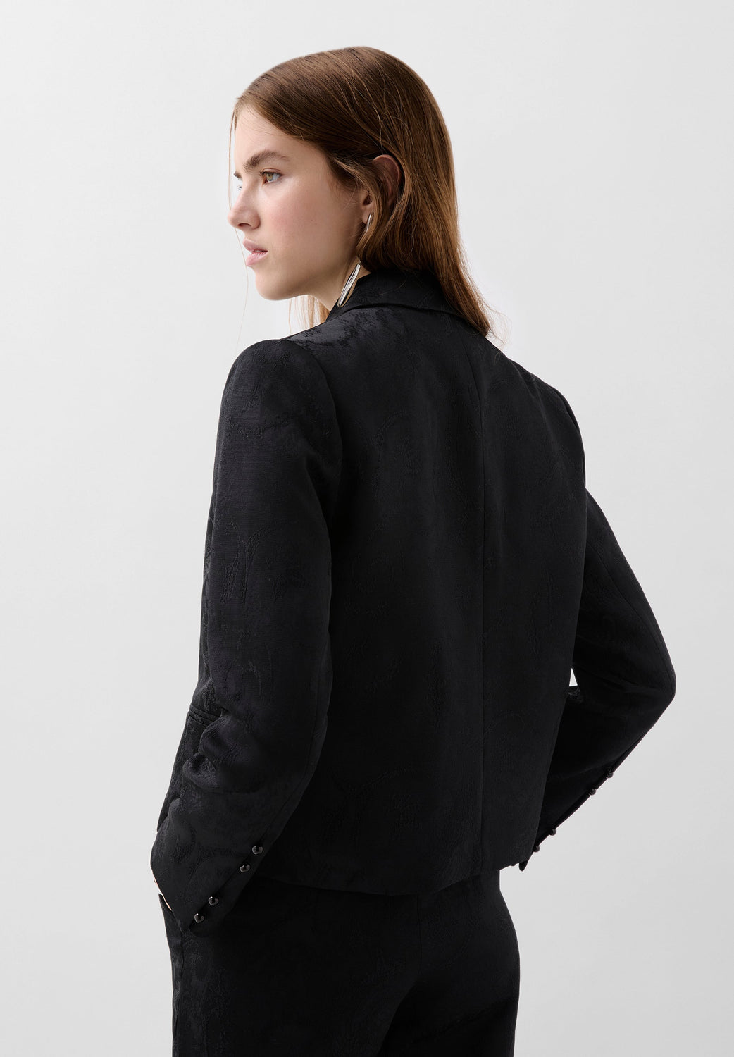 Blazer cropped confeccionada en tejido de jacquard. Regular fit, cuello con solapa punta de lanza y cierre con botones . Manga larga.