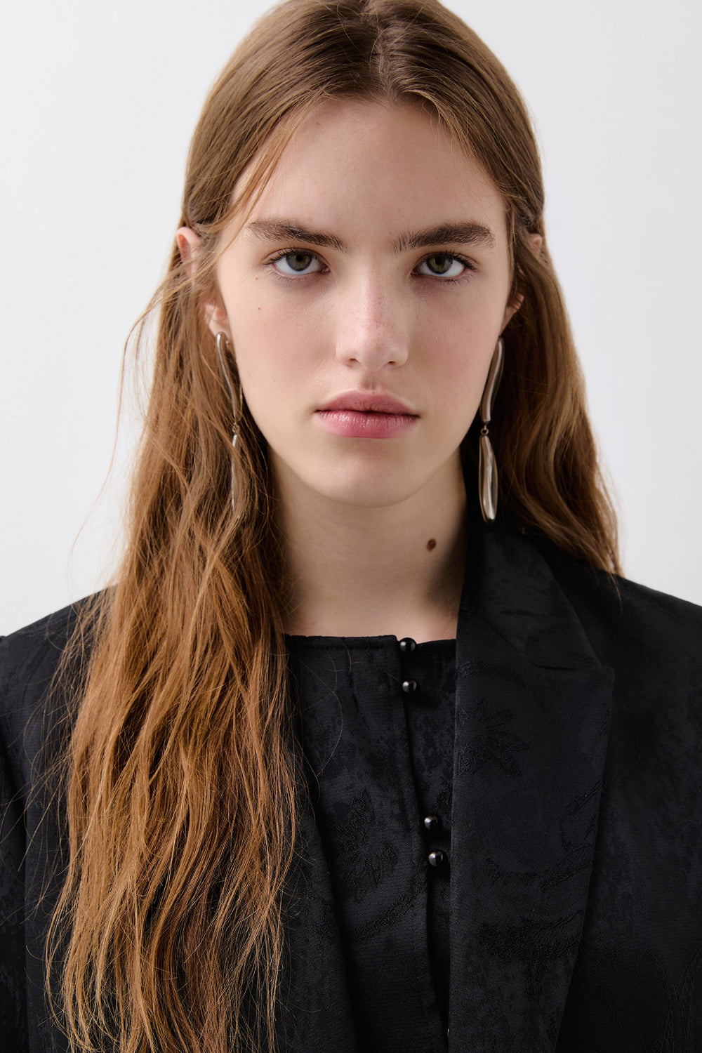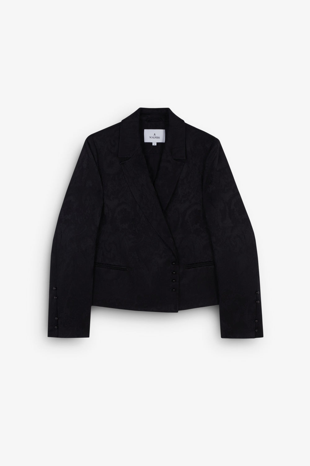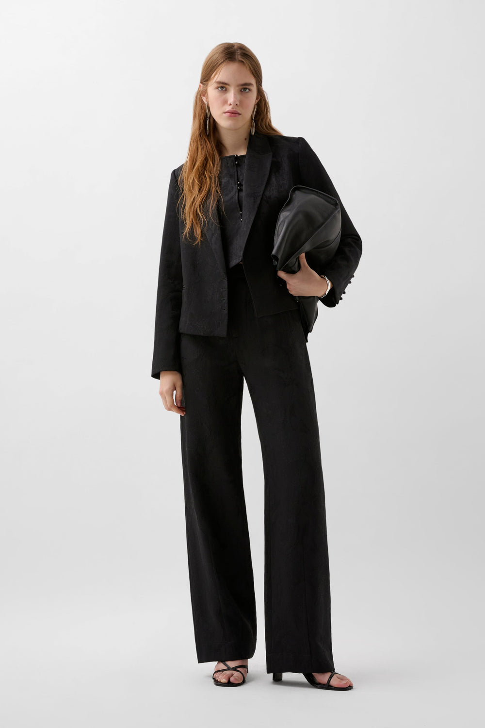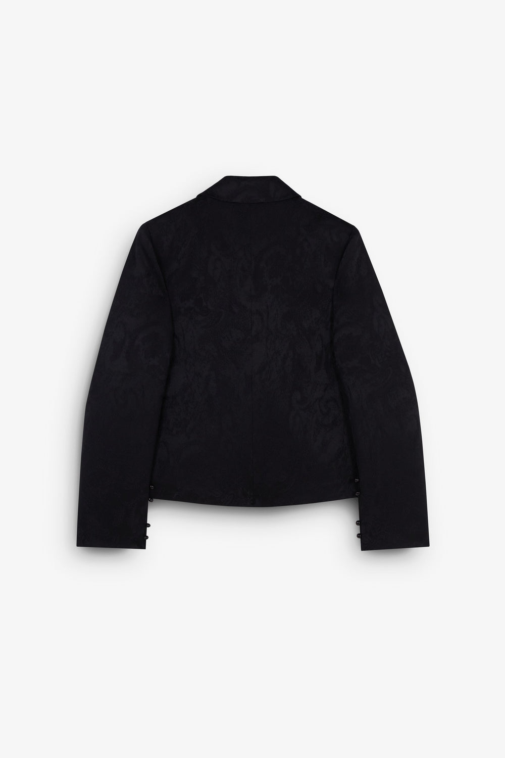 Blazer cropped confeccionada en tejido de jacquard. Regular fit, cuello con solapa punta de lanza y cierre con botones . Manga larga.