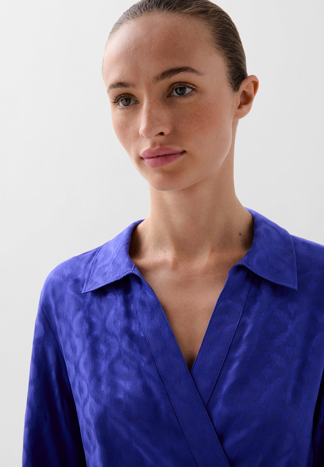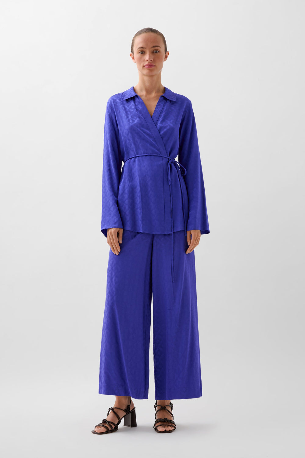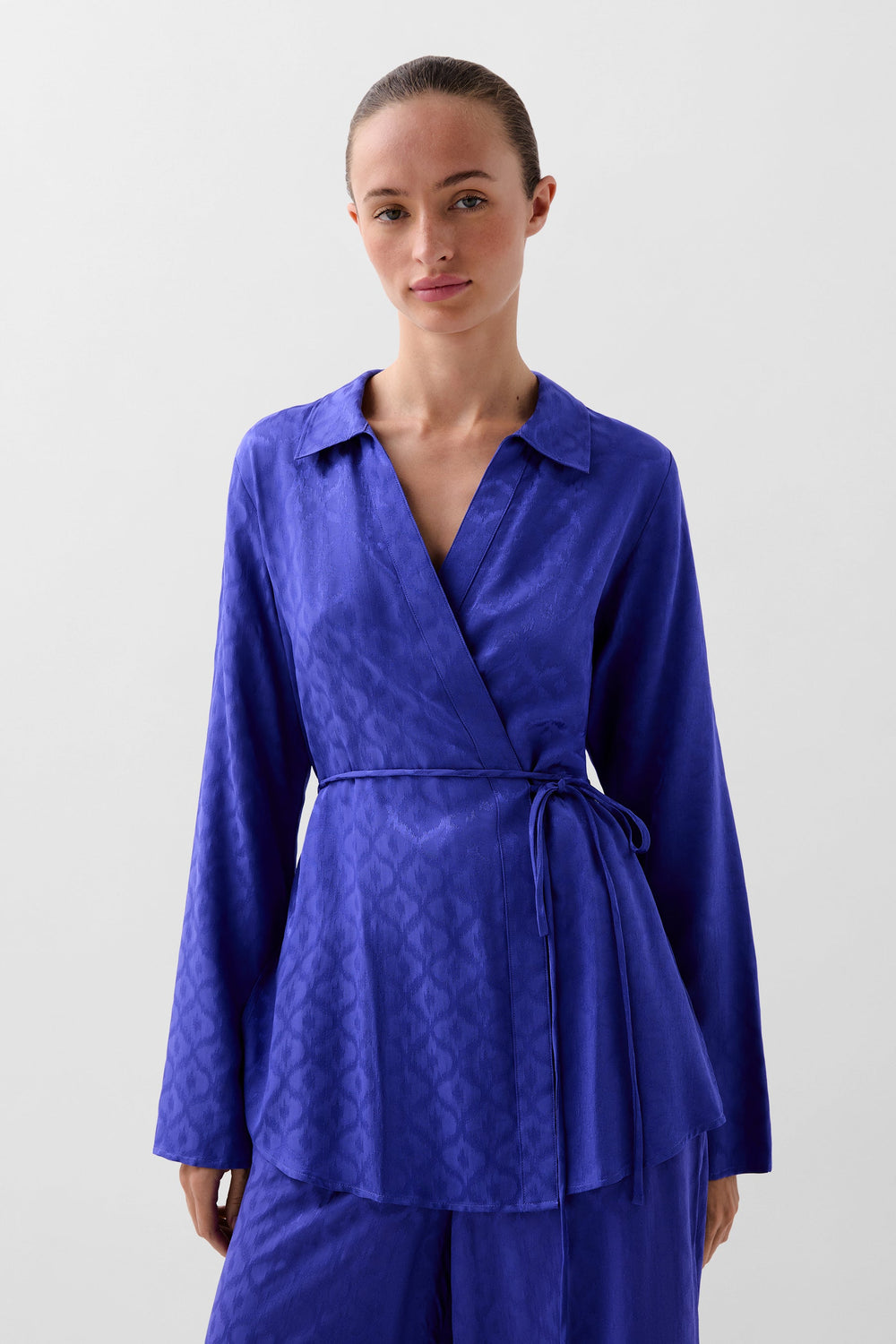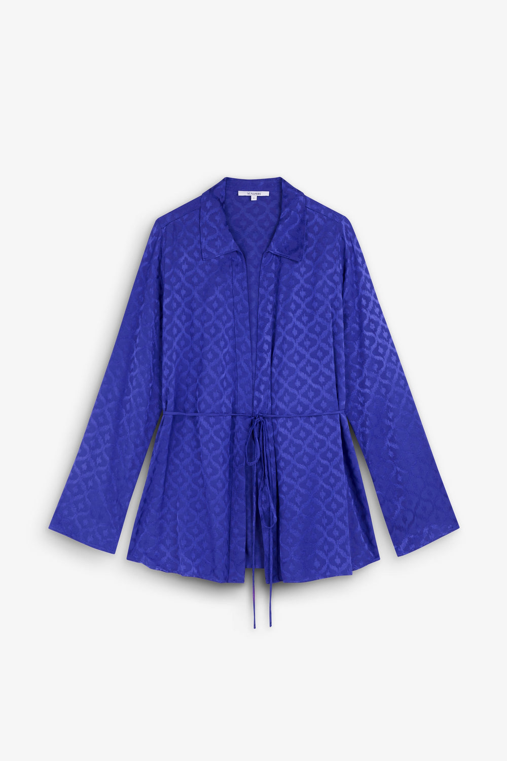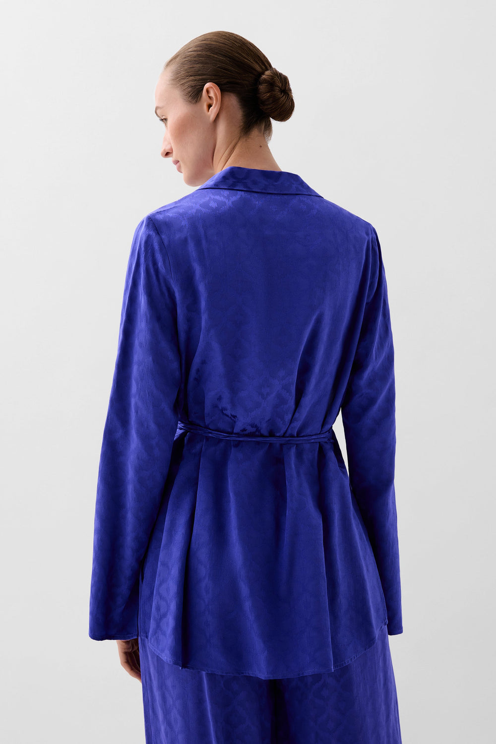 Kaftan confeccionado en tejido fluido con estampado de jacquard. Corte regular fit, cuello camisero, manga larga ligeramente acampanada y cierre con lazada en cintura.