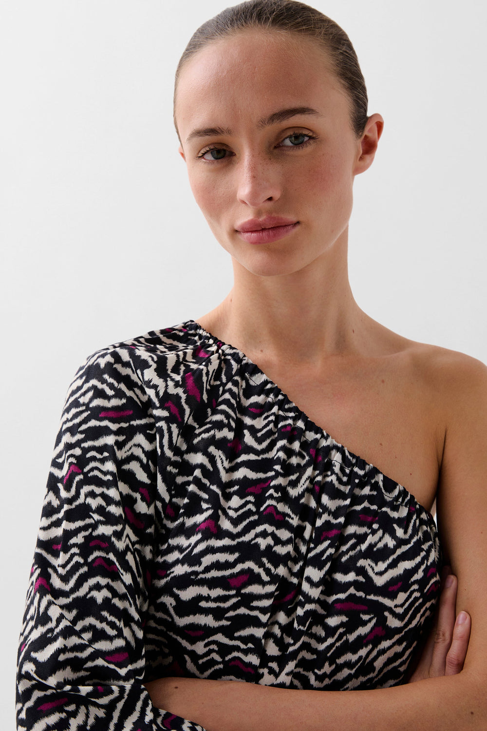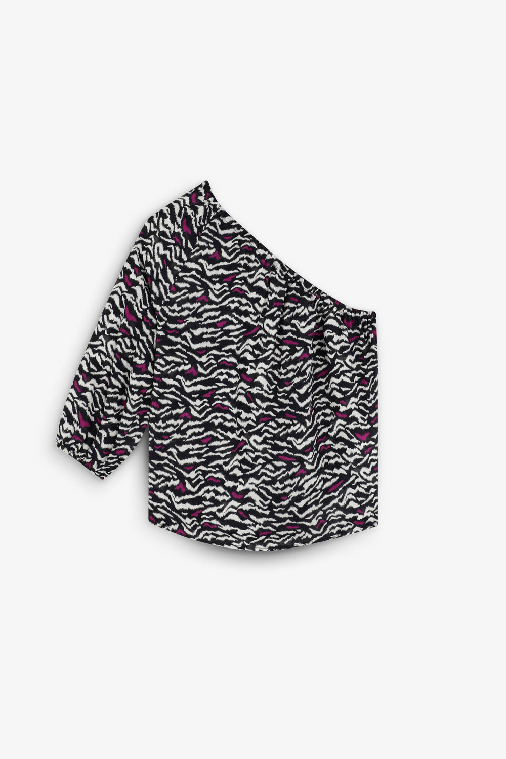 Blusa confeccionada en 100% viscosa con estampado de animal print. Corte regular fit, cuello asimétrico con manga ligeramente abullonada acabada en puño elástico.