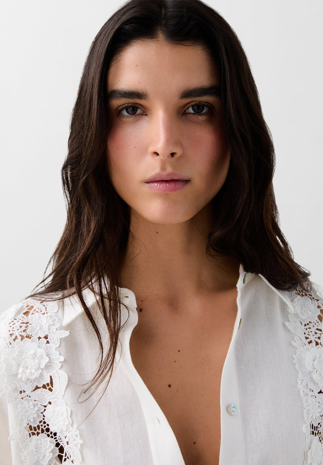 Camisa confeccionada en mezcla de lino con detalles de encaje frontales y en mangas. Corte regular fit, cuello clásico y cierre con botones. Manga larga terminada n puño con botones.