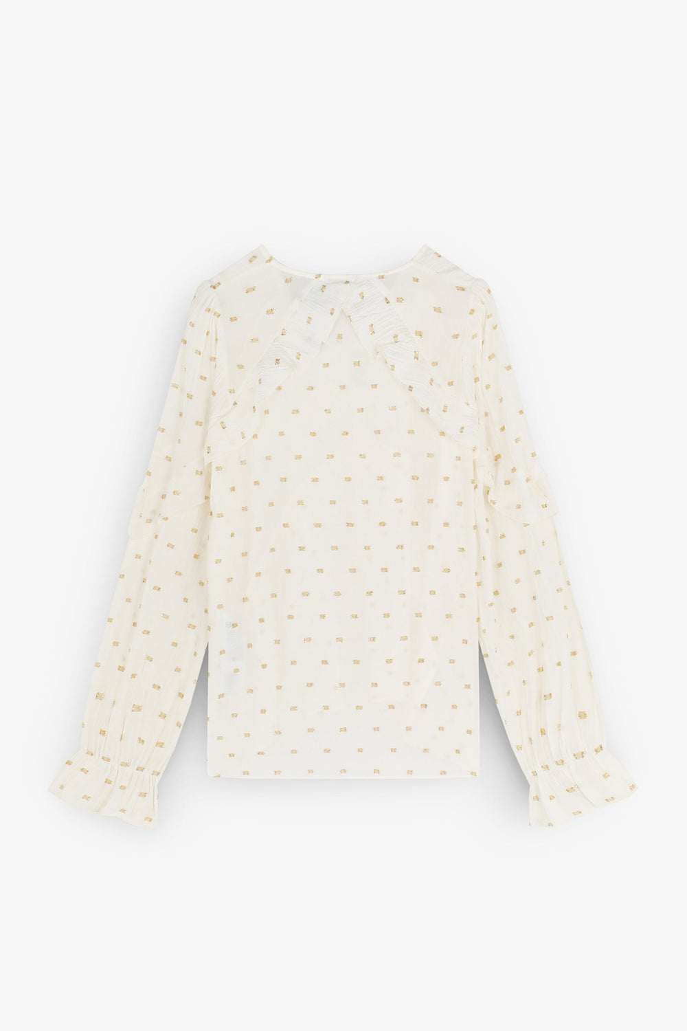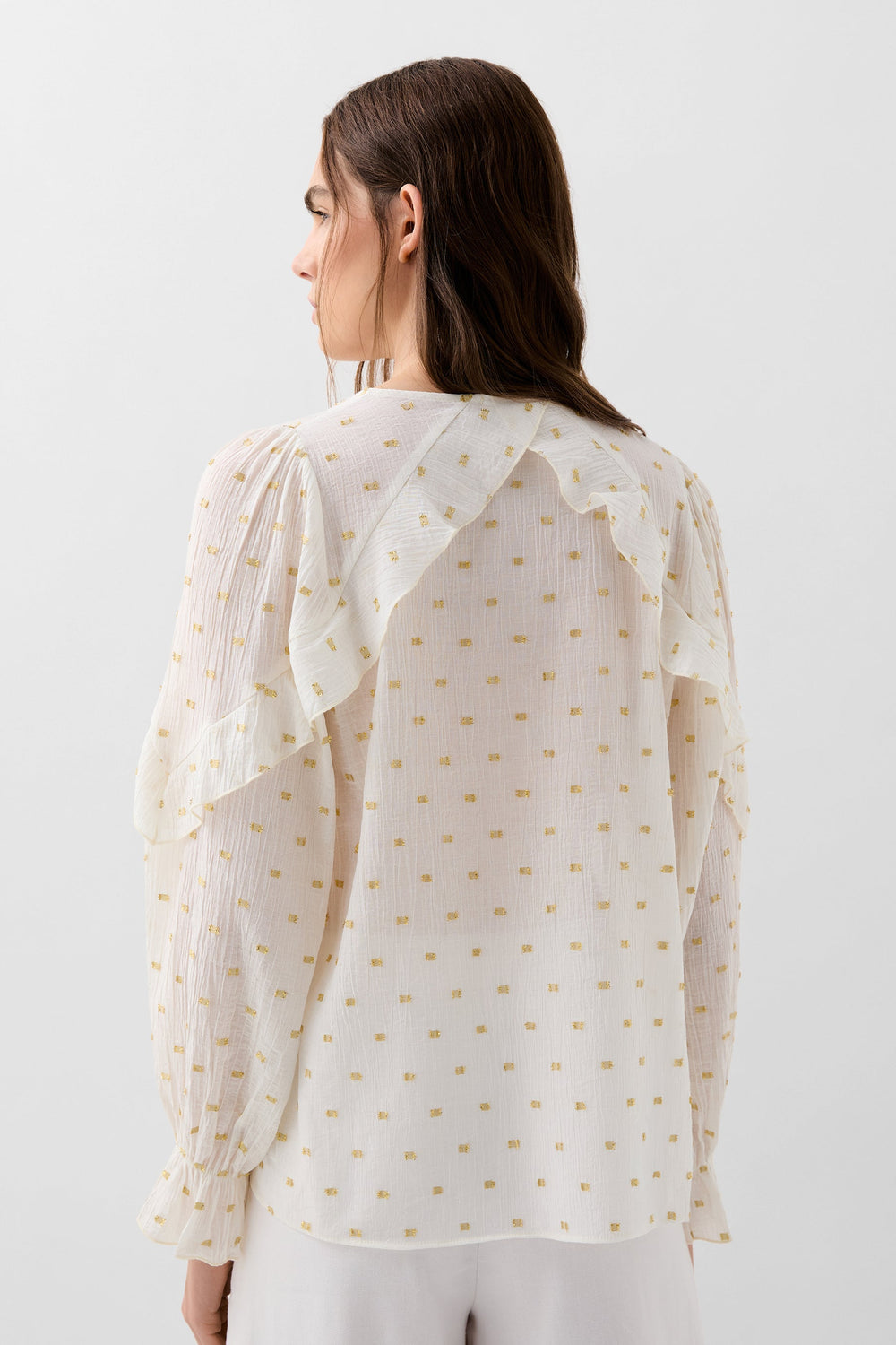 Blusa confeccionada en mezcla de viscosa con detalles de volantes e hilo metalizado. Corte regular fit, escote en V con manga larga terminada en puño con ligero volante.