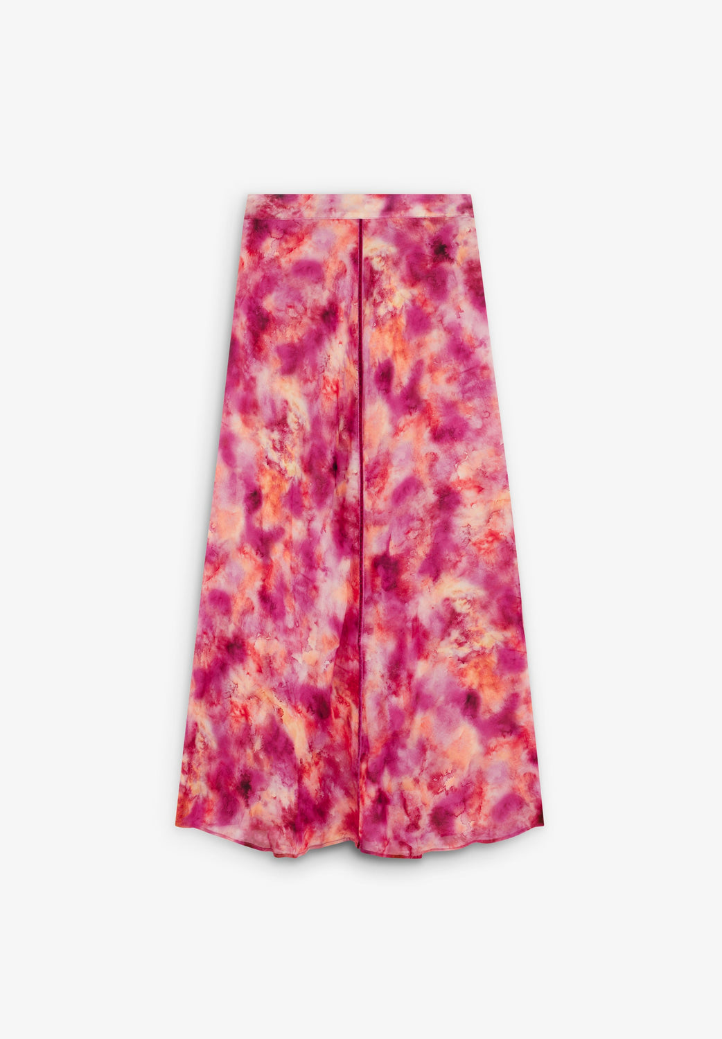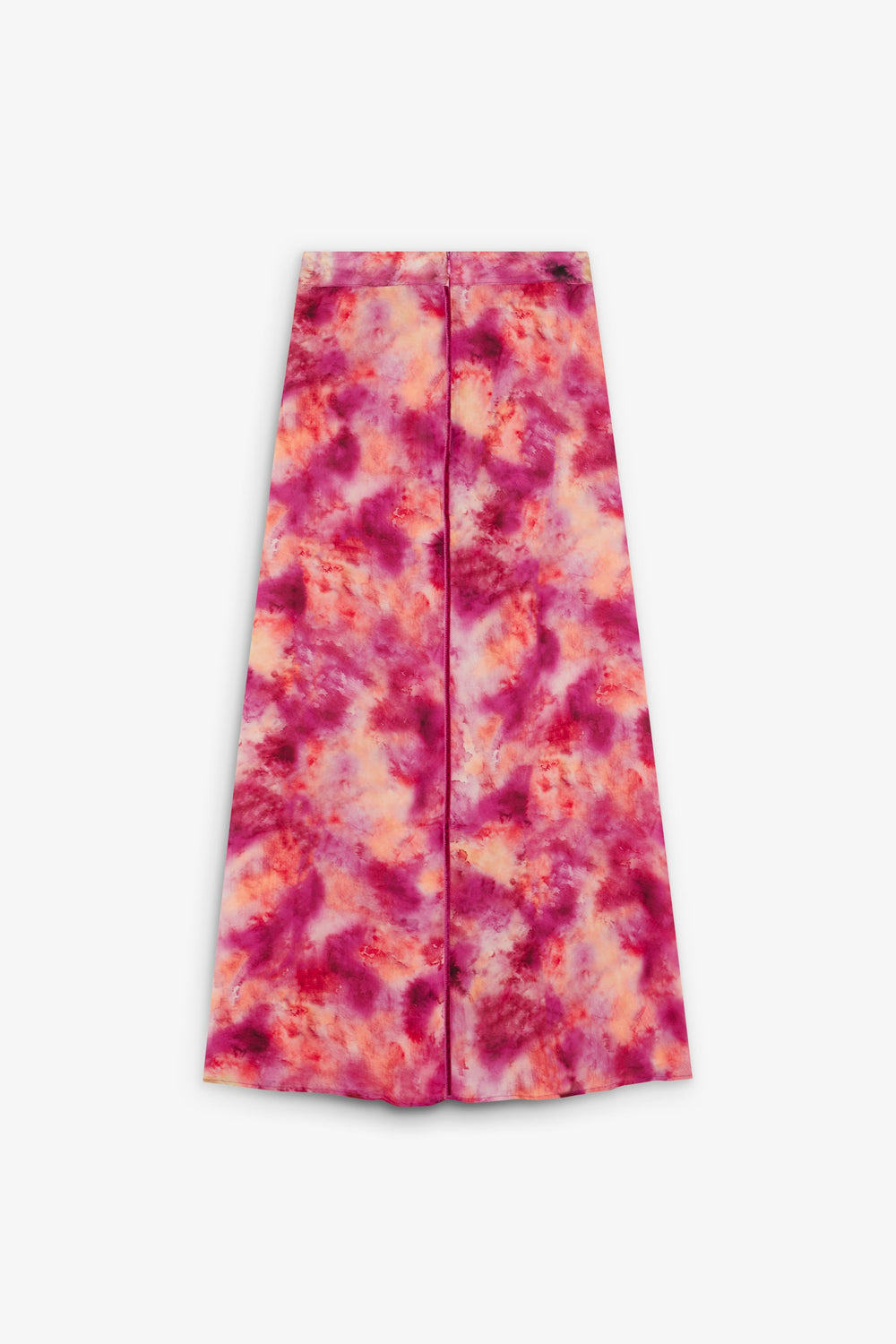 Falda larga confeccionada en tejido fluido con estampado de tie dye. Corte midi, silueta ligeramente A Line con detalle de ribete de terciopelo. Cierre con cremallera oculta trasera.