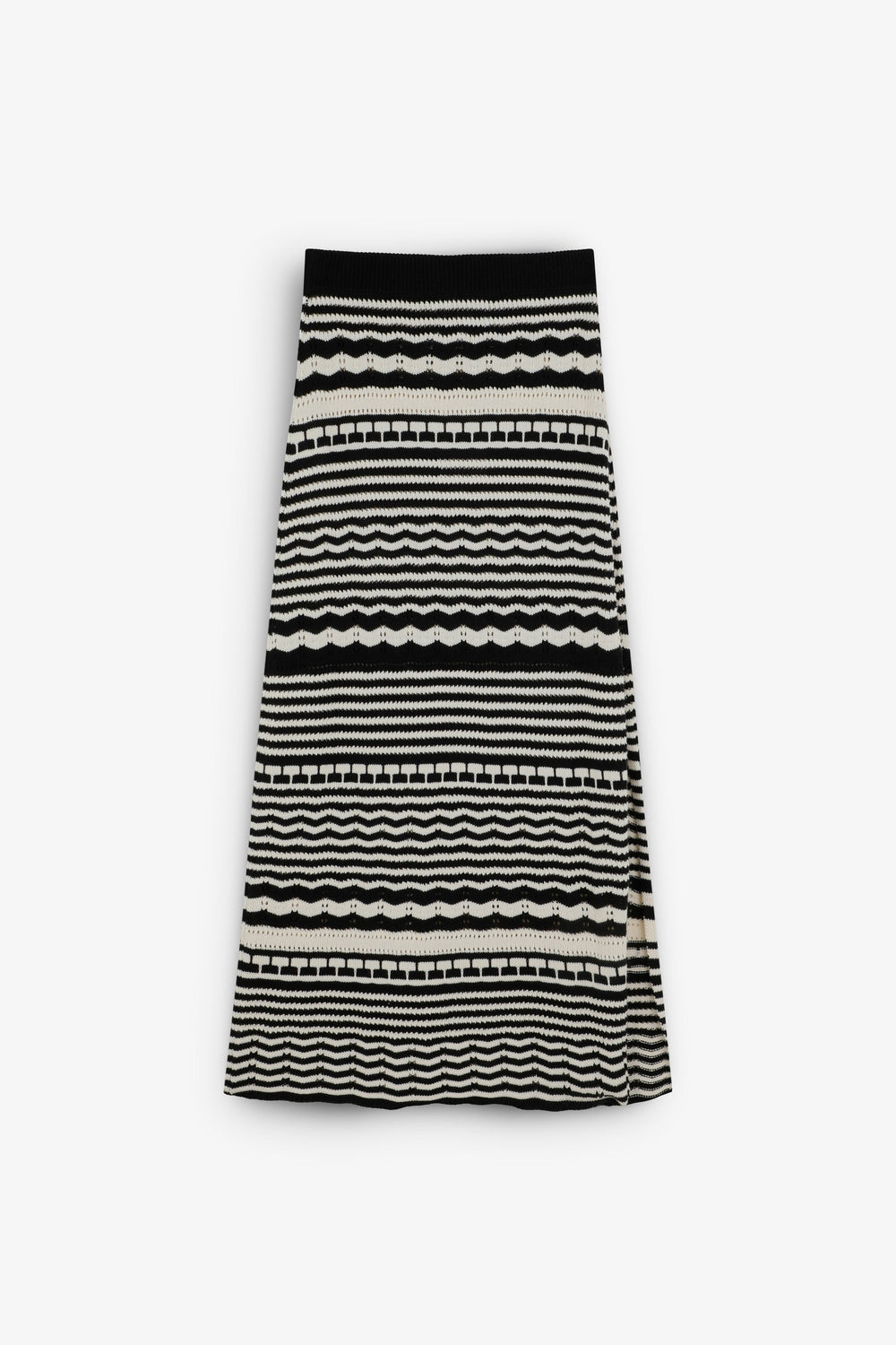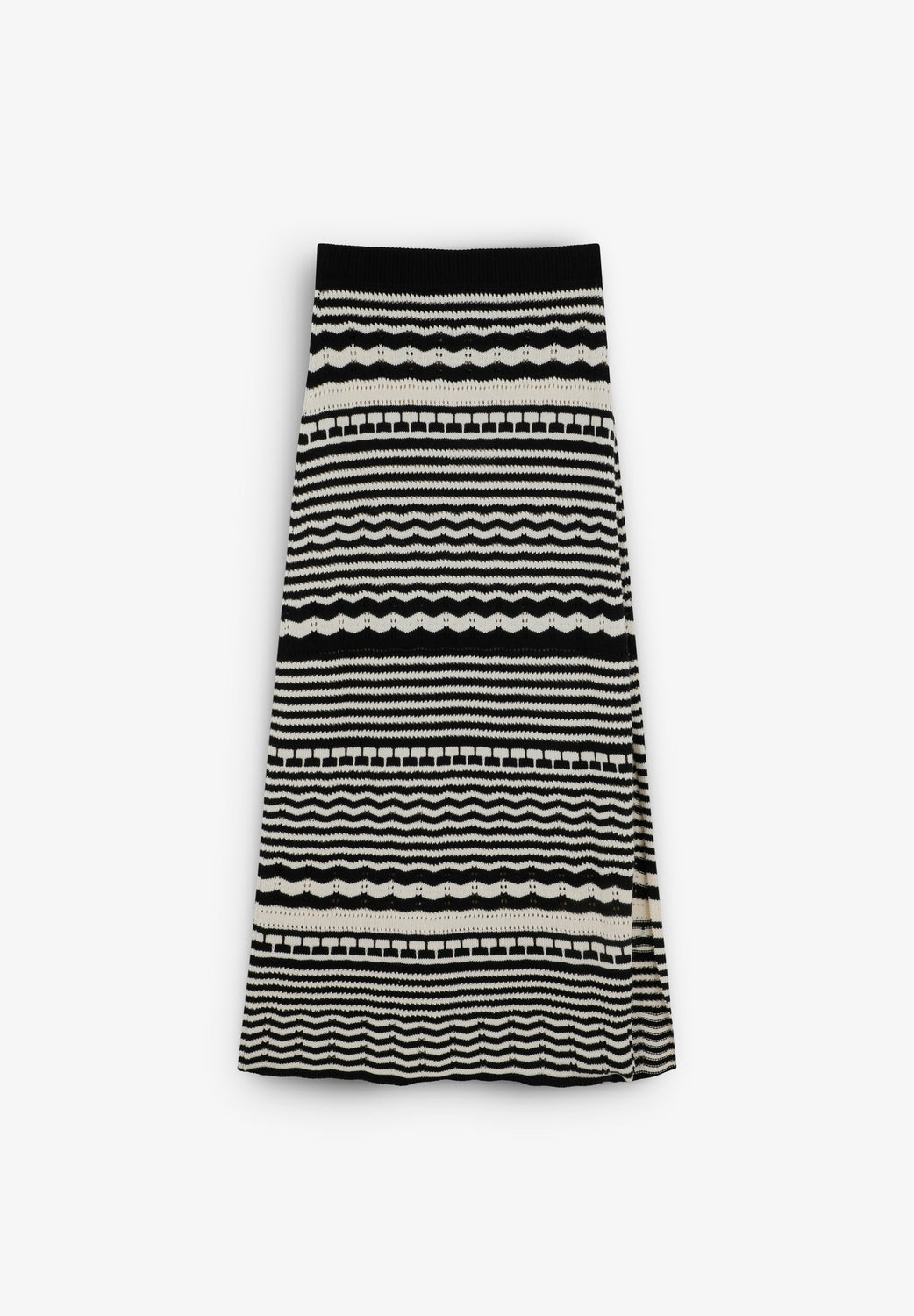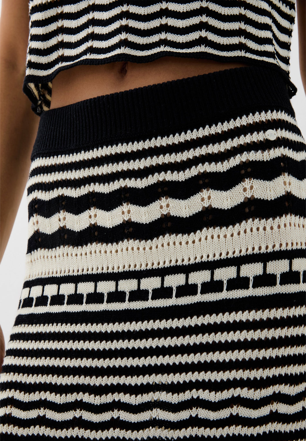 Falda de punto confeccionada en Algodón Orgánico BCI. Motivo rayas. Cinturilla elástica. Abertura lateral en bajo.