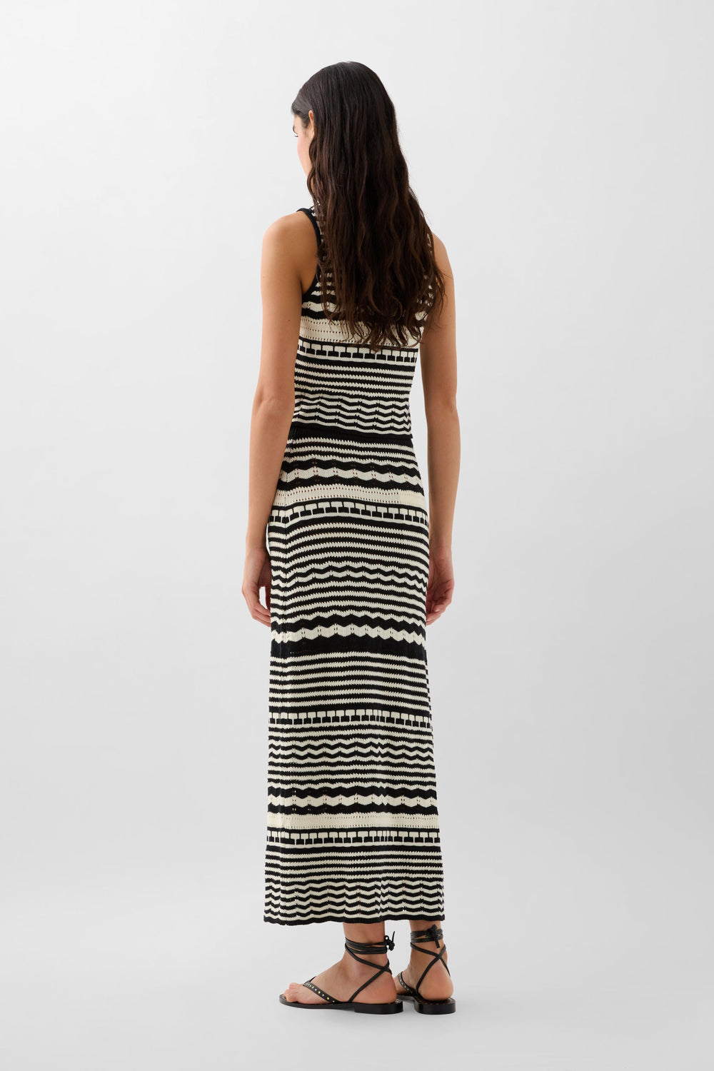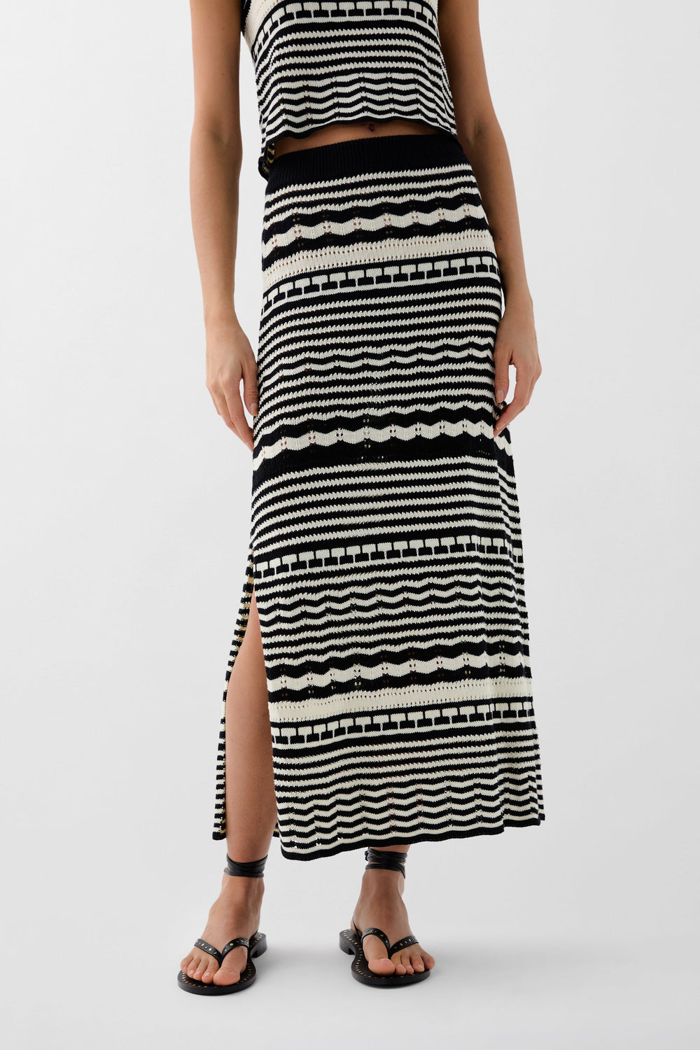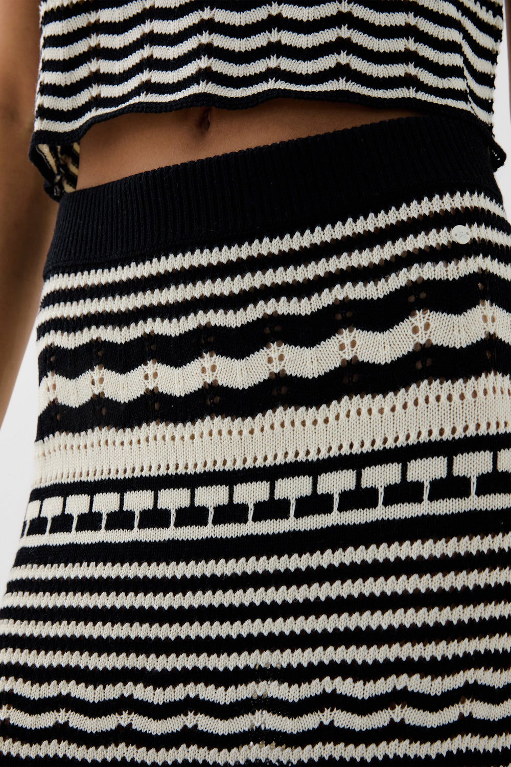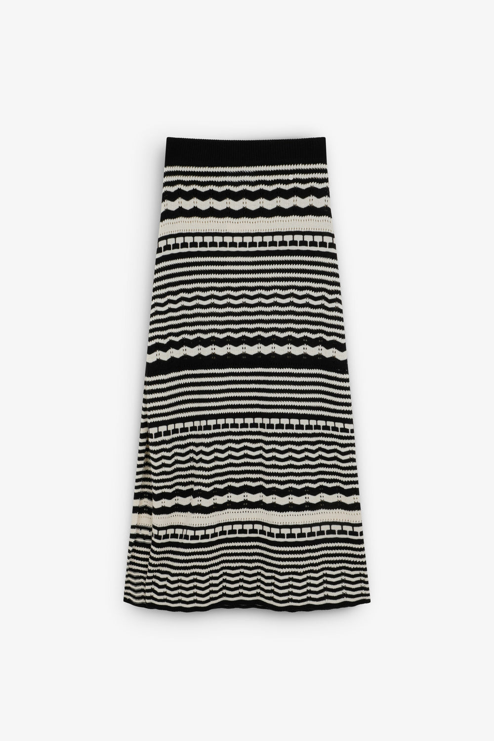 Falda de punto confeccionada en Algodón Orgánico BCI. Motivo rayas. Cinturilla elástica. Abertura lateral en bajo.