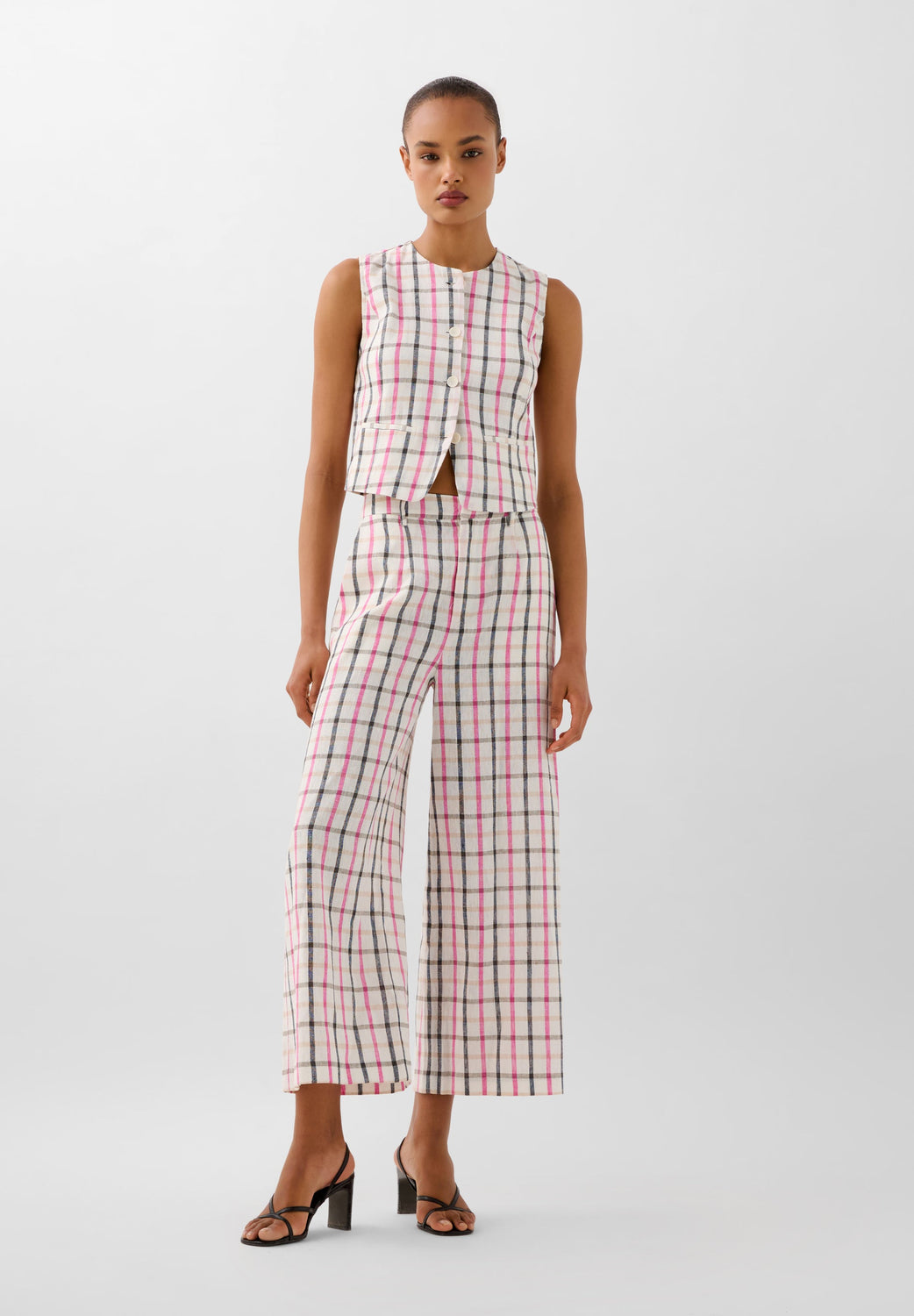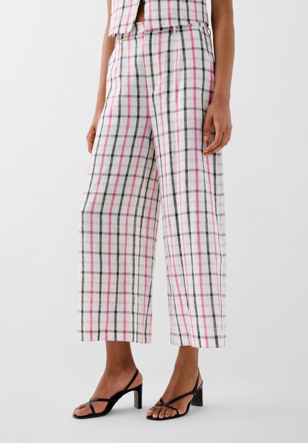 Pantalón confeccionado en Lino y Algodón Orgánico BCI. Culotte Fit. Forro interior 100% Algodón. Dos bolsillos laterales y dos posteriores. Estampado Vichy. Cierre mediante botón y cremallera ocultos en frontal.