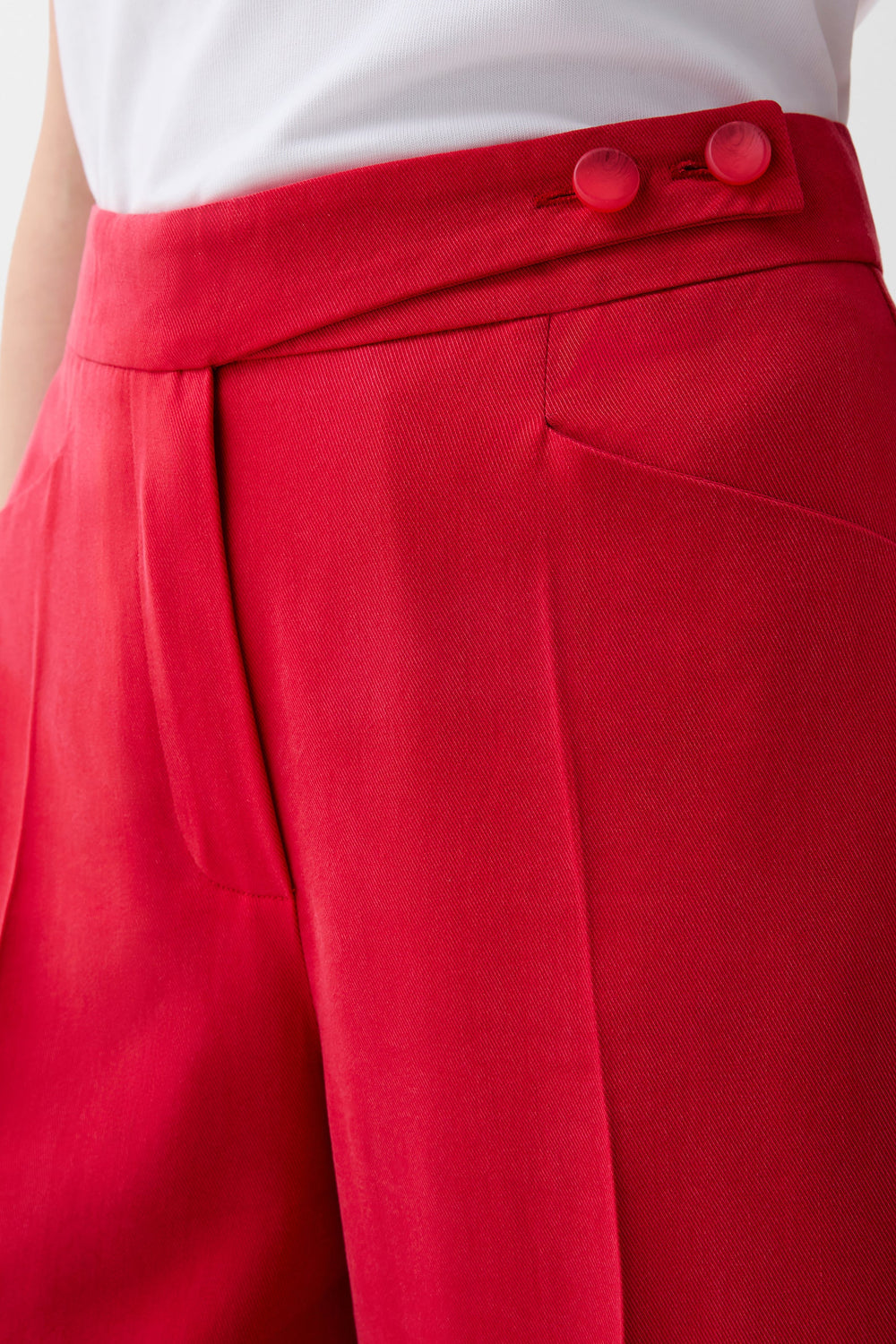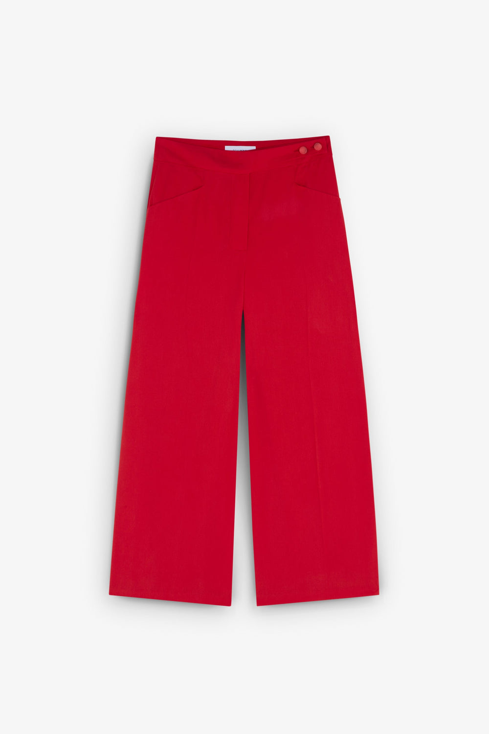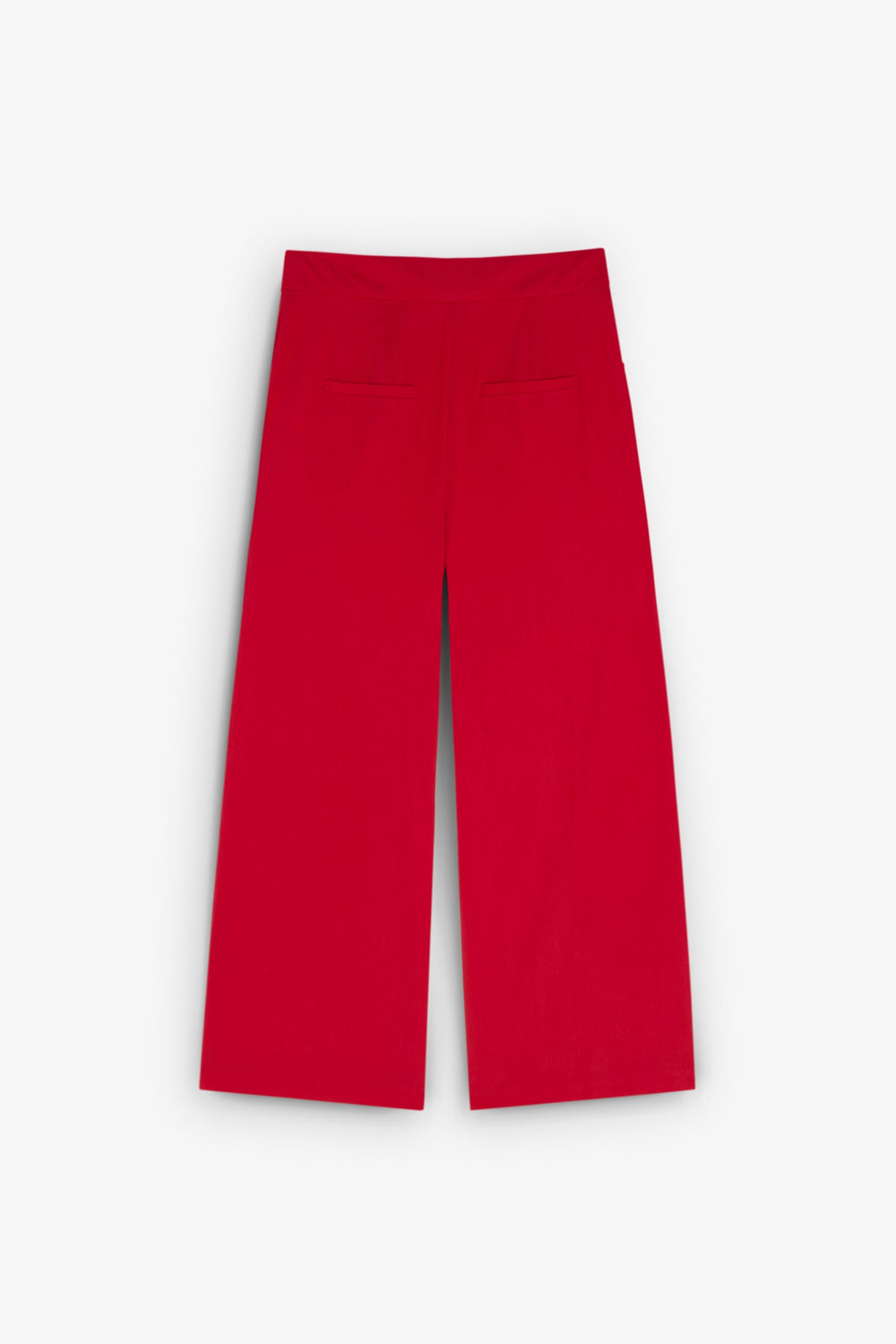 Pantalón confeccionado en material fluido en mezcla de algodón. Corte regular fit, recto con cierre de cremallera y botón prolongado en cinturilla. Pinzas frontales y bolsillos inclinados. Bolsillos de vivo traseros.