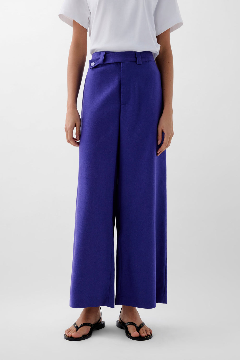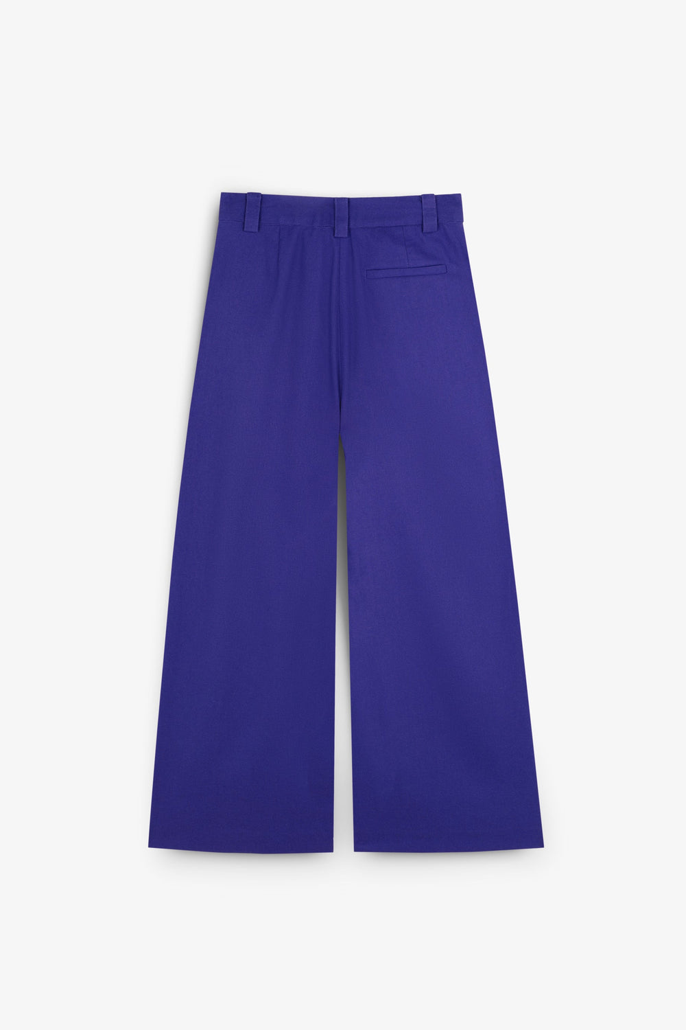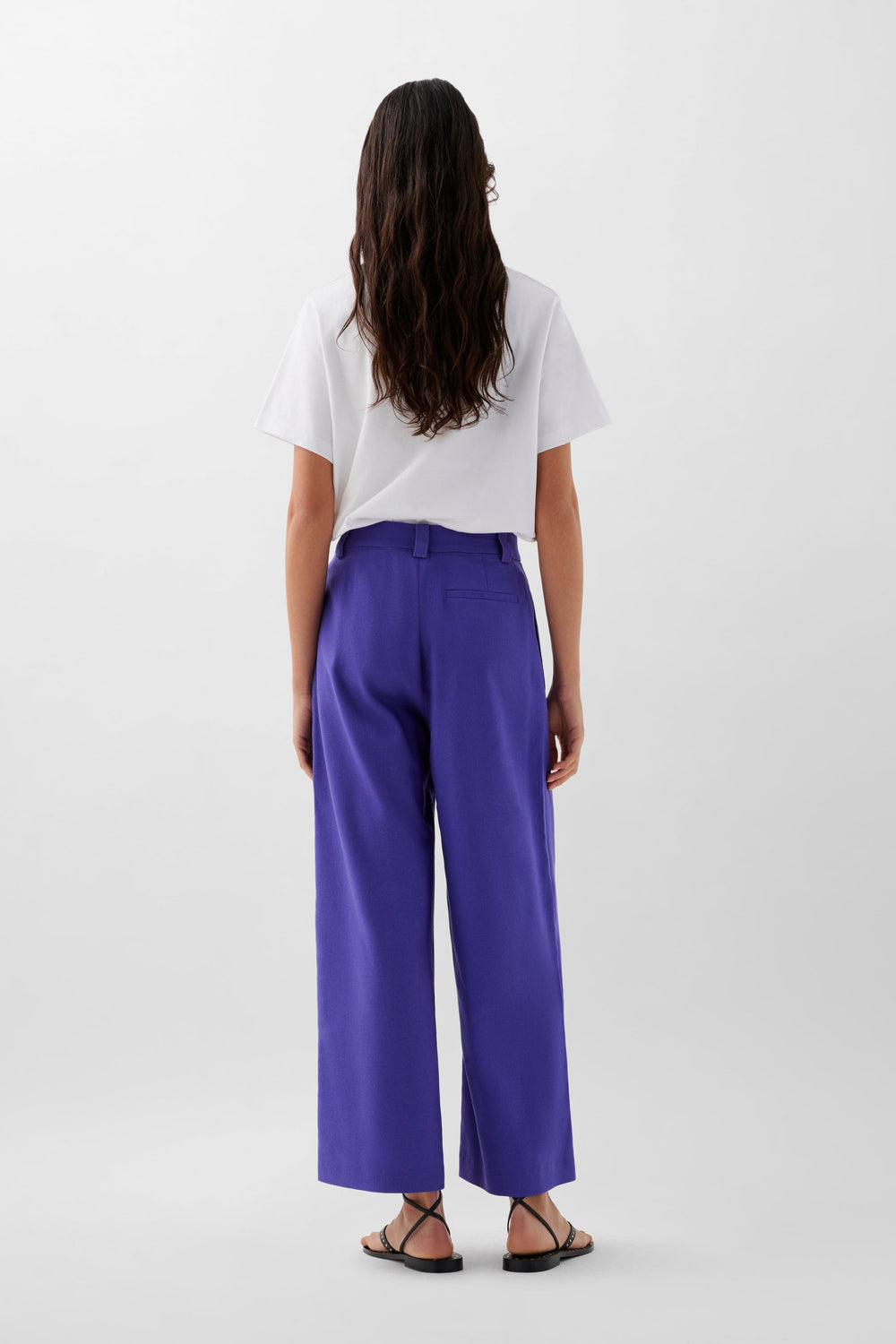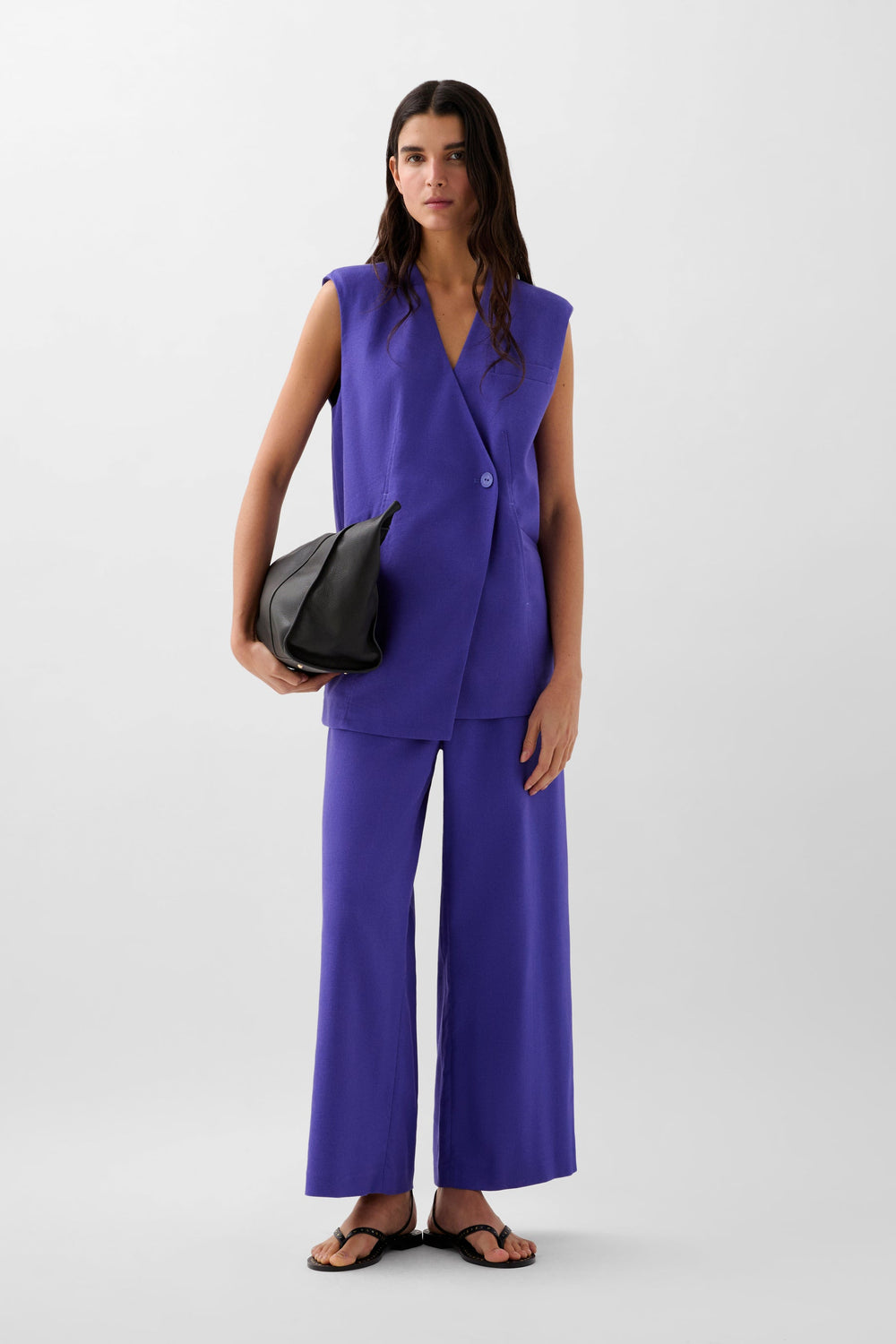 Pantalón confeccionado en Lino. Full Lenght. Dos bolsillos en laterales y dos posteriores. Cinturilla asimétrica. Cierre mediante botón y cremallera ocultos a tono.