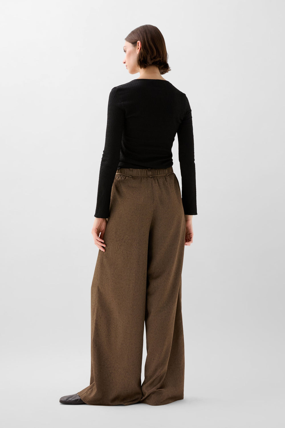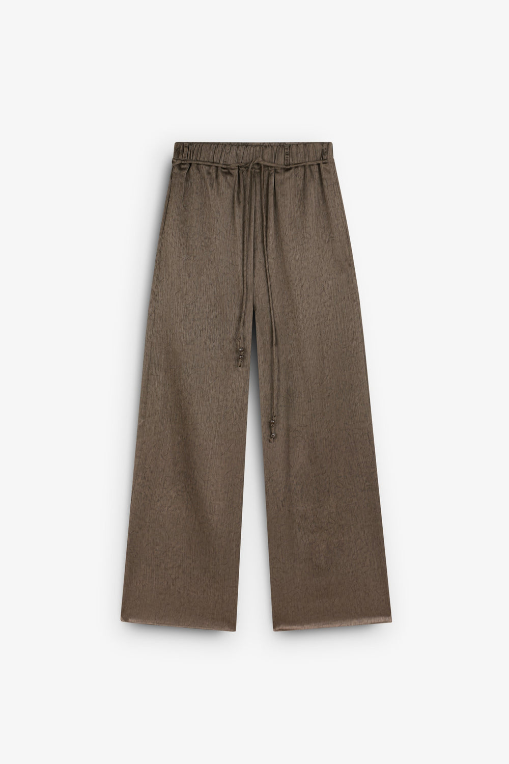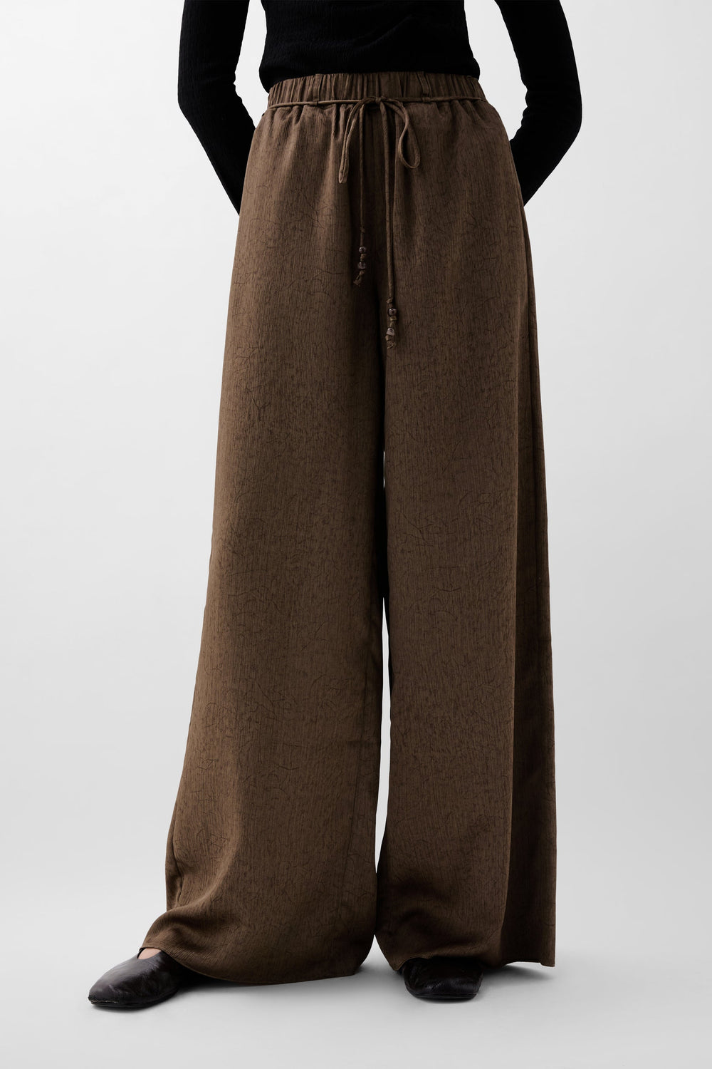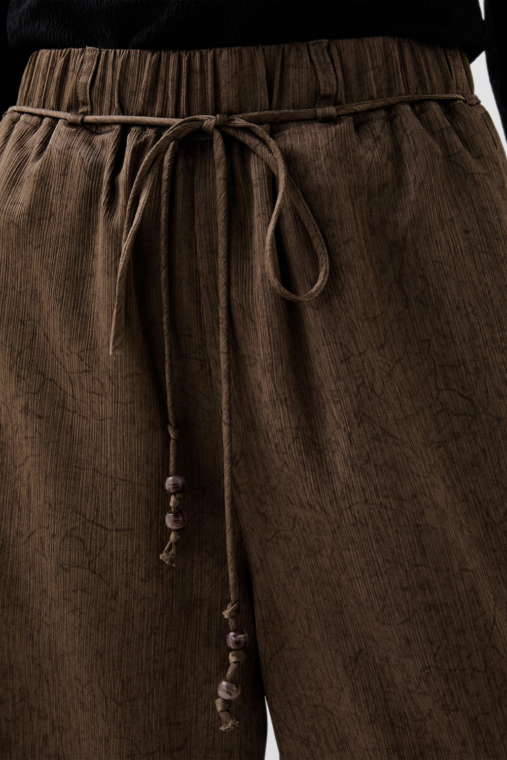 Pantalón fluido de tiro alto. Cinturilla ajustable. Detalle cordón.