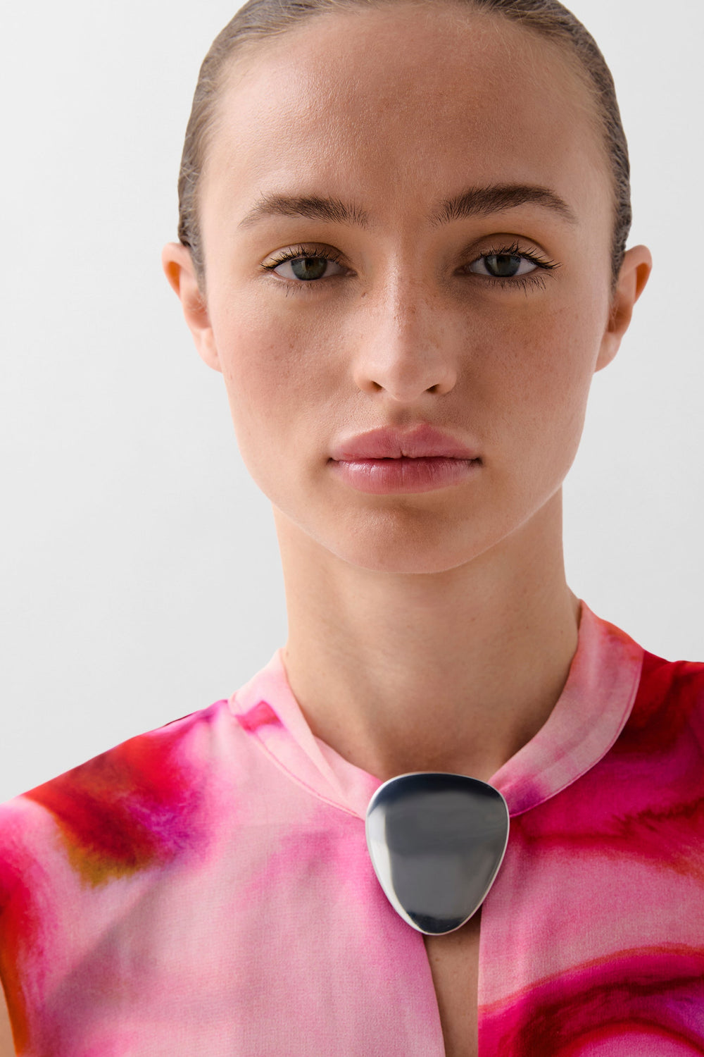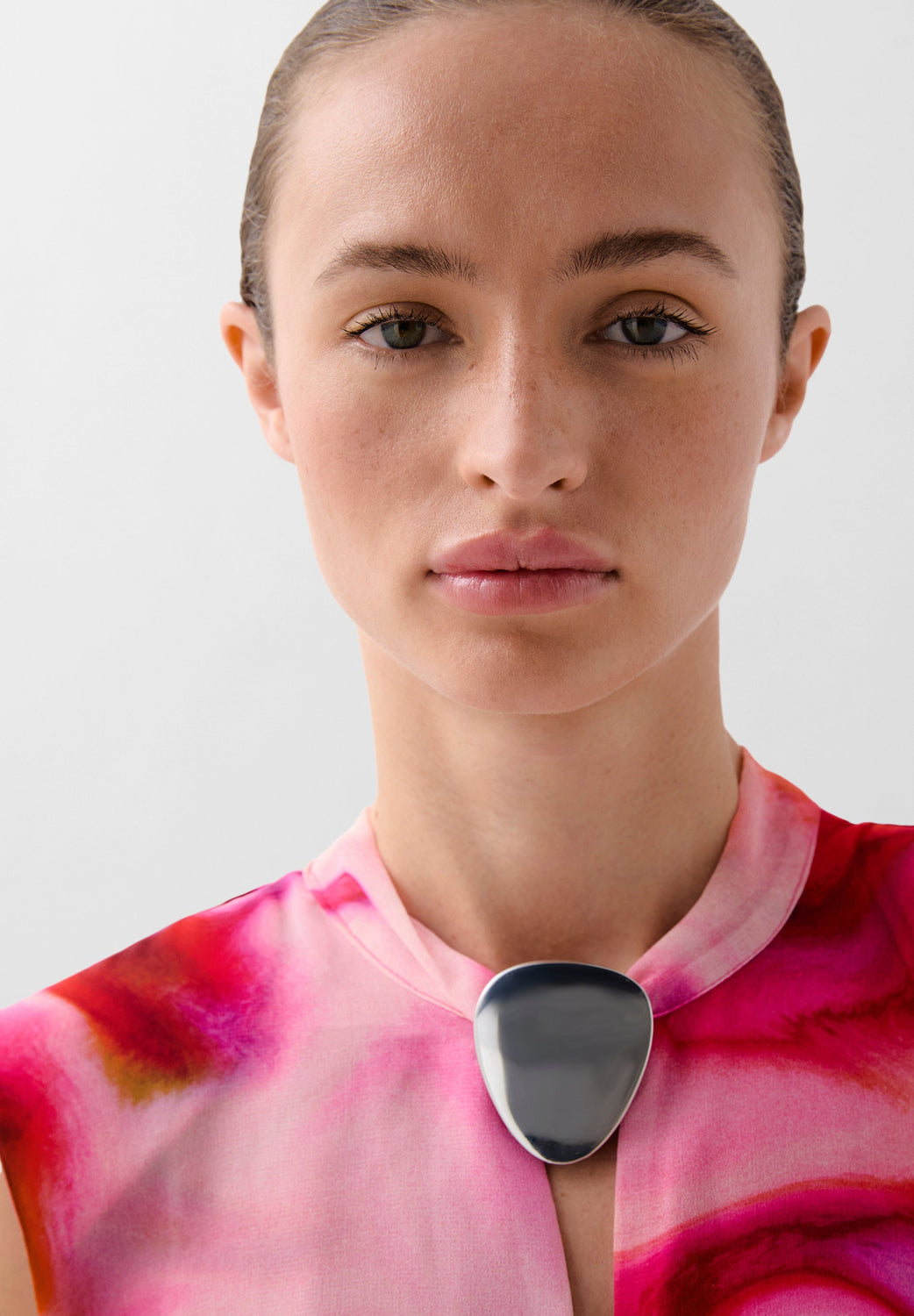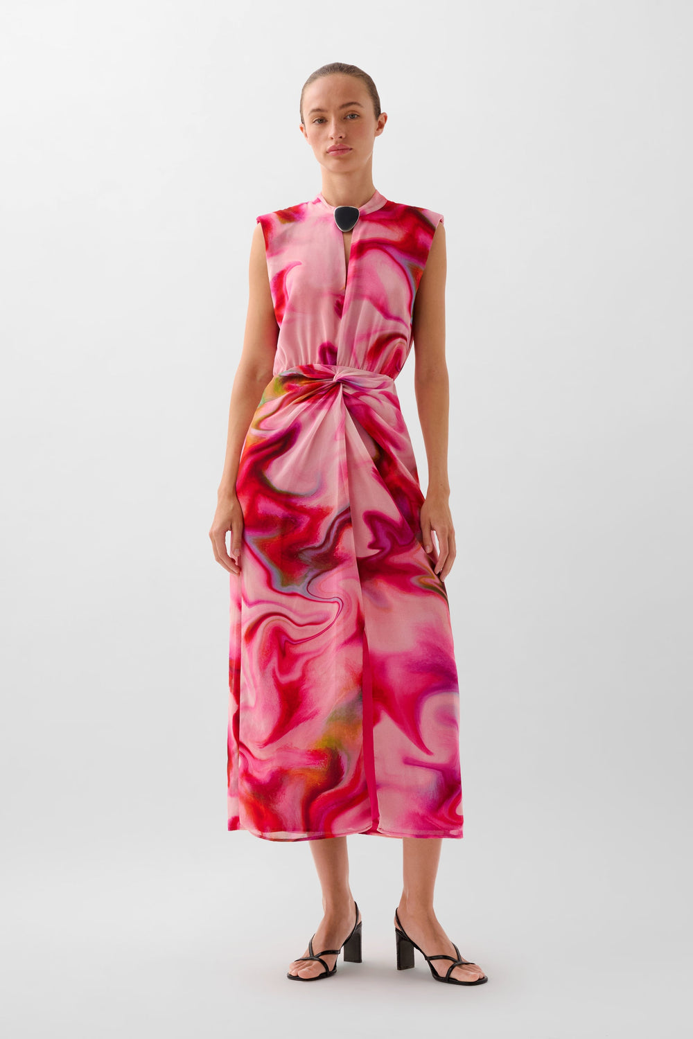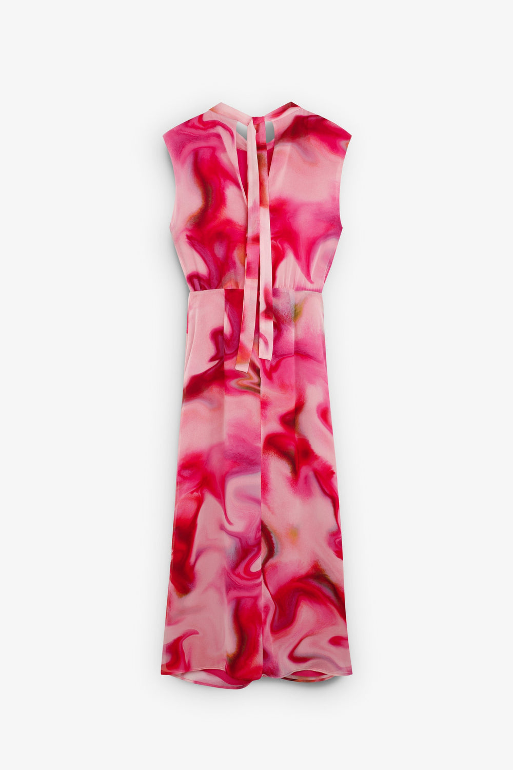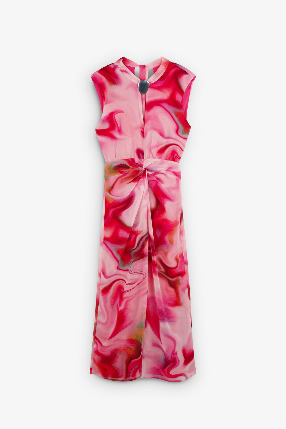 Vestido con print. Confeccionado en tejido fluido. Corte Slim Fit. Cuello redondo con detalle y abertura. Cierre con cremallera y lazada al cuello. Drapeado delantero en la falda con nudo en cintura.