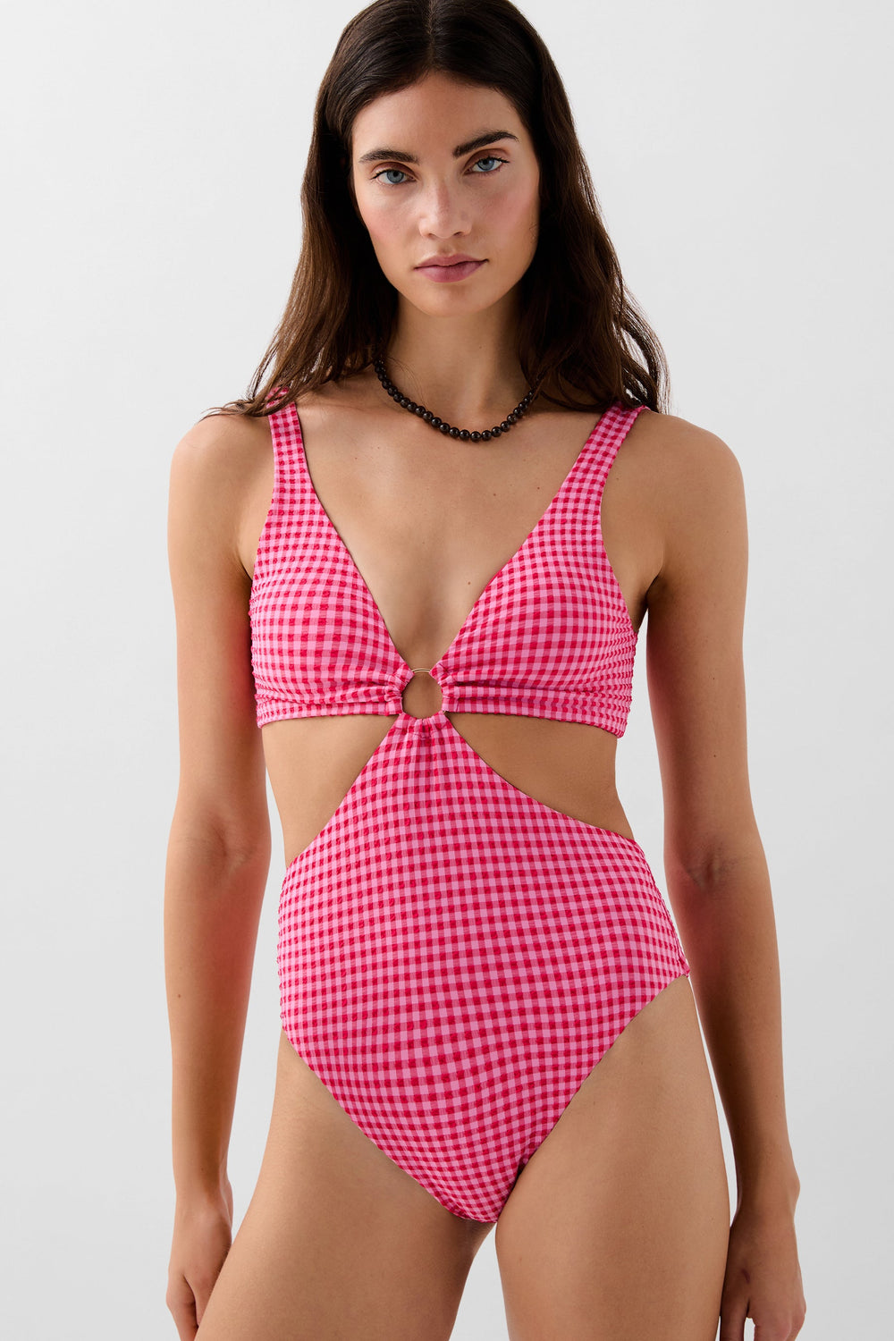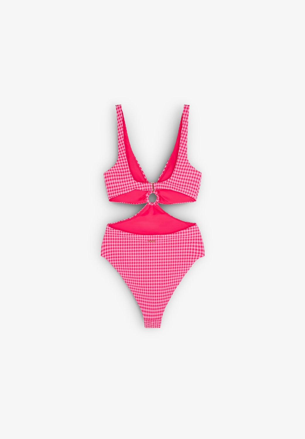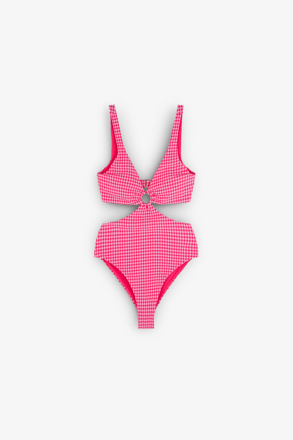 Trikini confeccionado en tejido técnico ligeramente elástico. Estampado de vichy con arandela e pecho y aberturas laterales. Cierre con enganche en espalda.