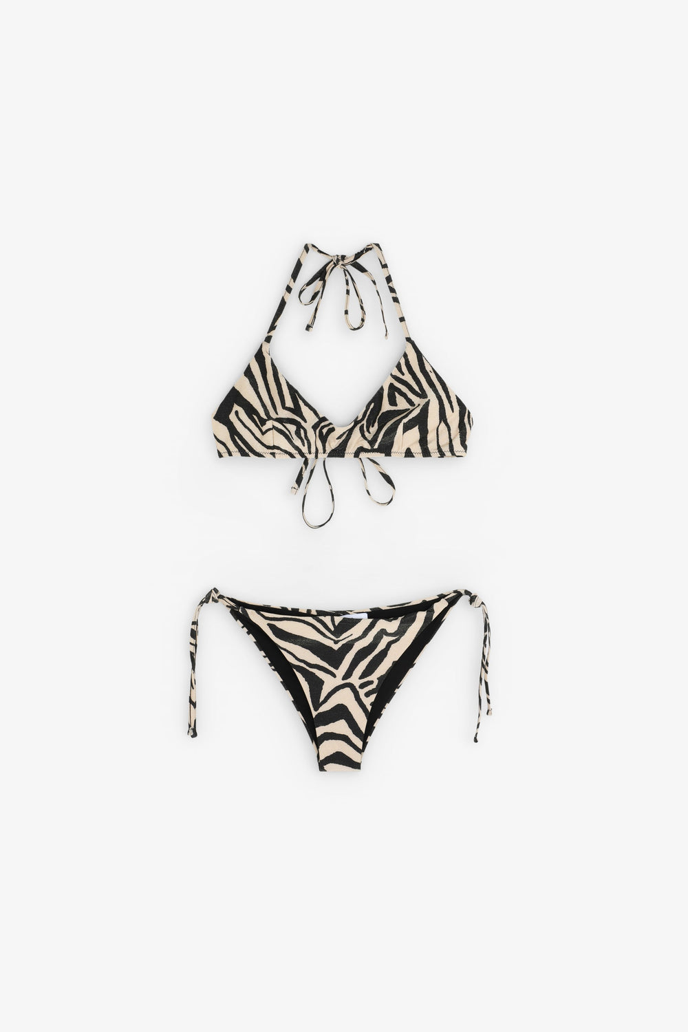 Bikini confeccionado en tejido técnico ligeramente elástico. Parte superior de triángulo con lazada al cuello y en parte trasera. Braguita clásica con lazadas laterales.