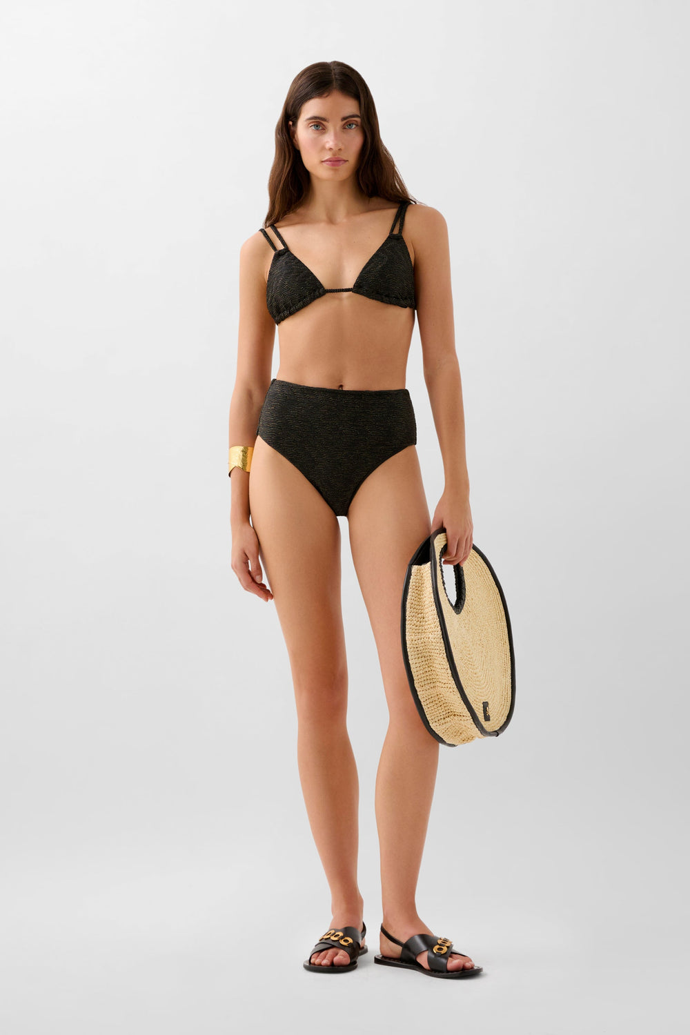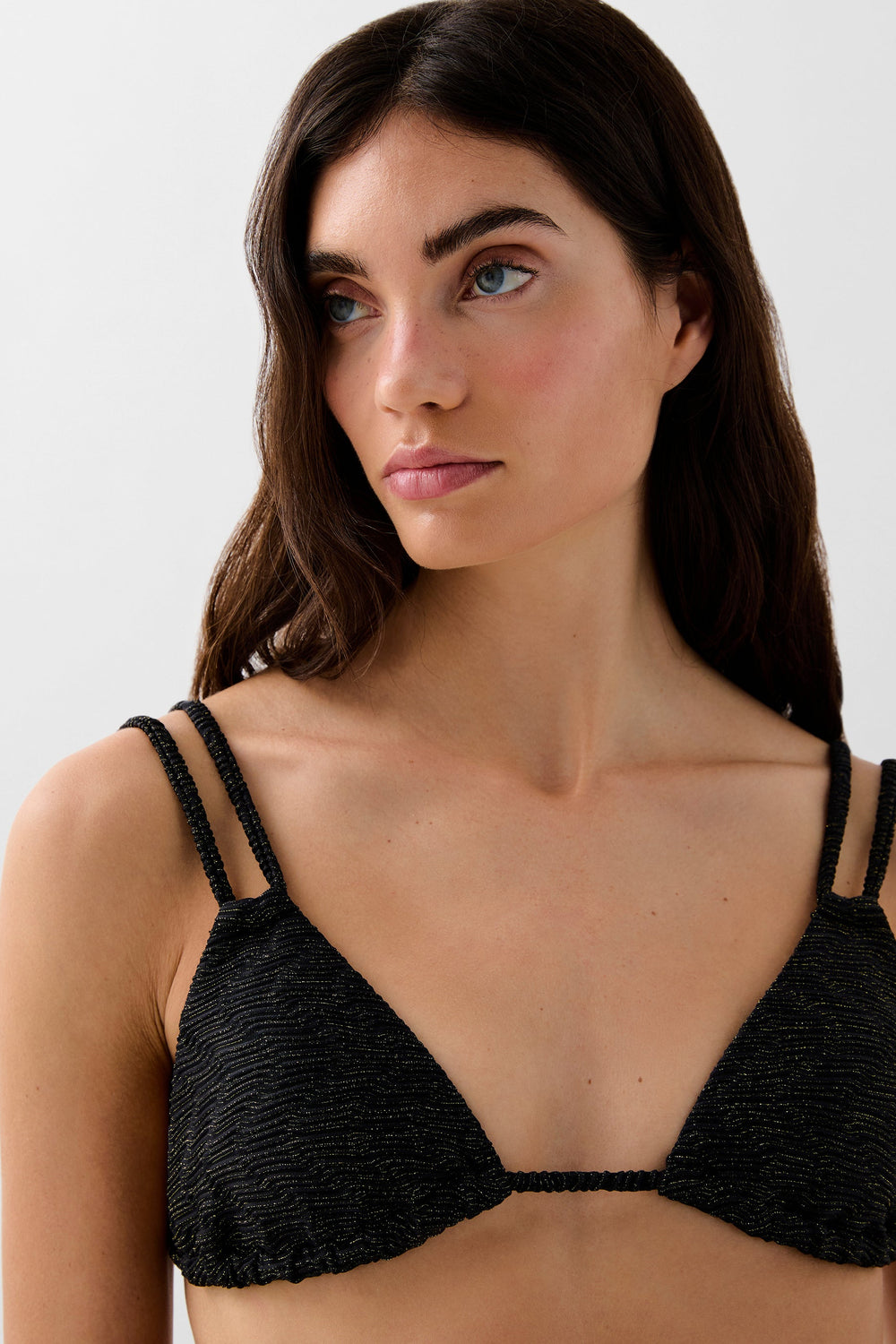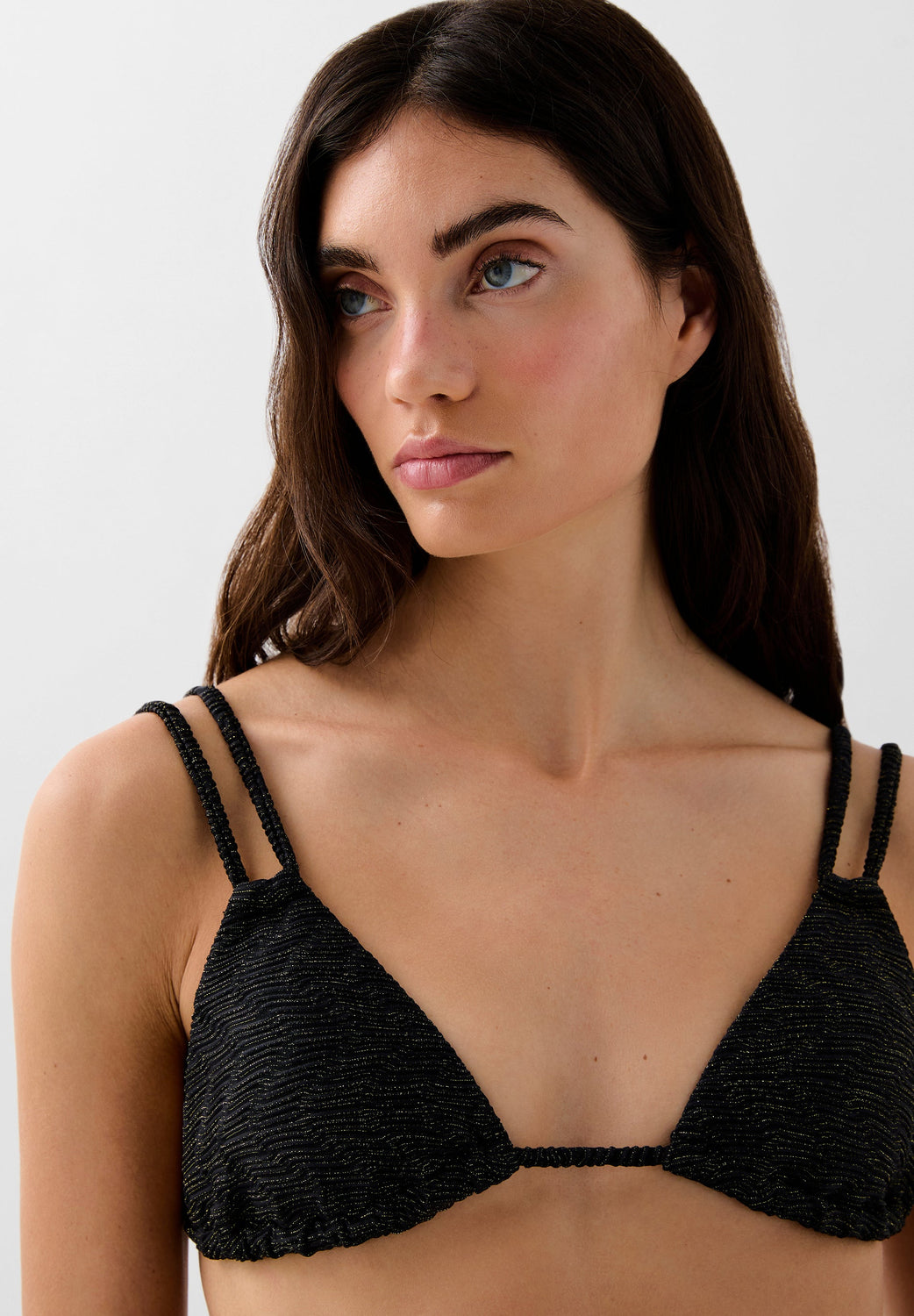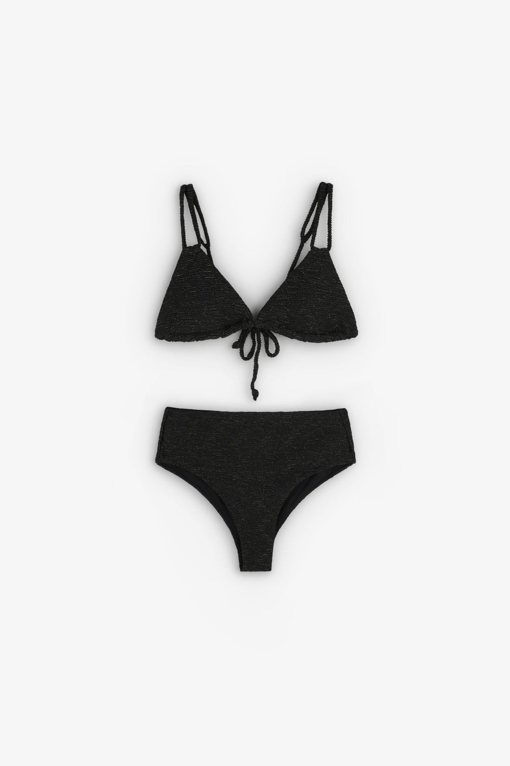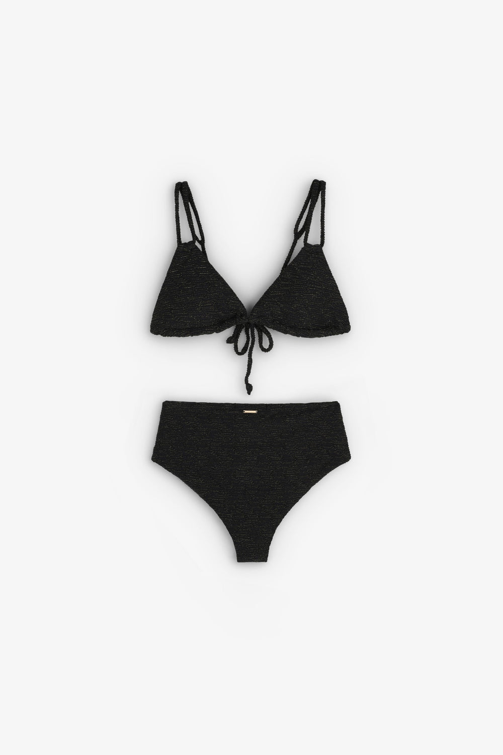 Bikini confeccionado en tejido técnico con lurex. Parte de arriba de triángulos con doble tira ajustable en espalda y cierre con lazada. Braguita corte hipster.