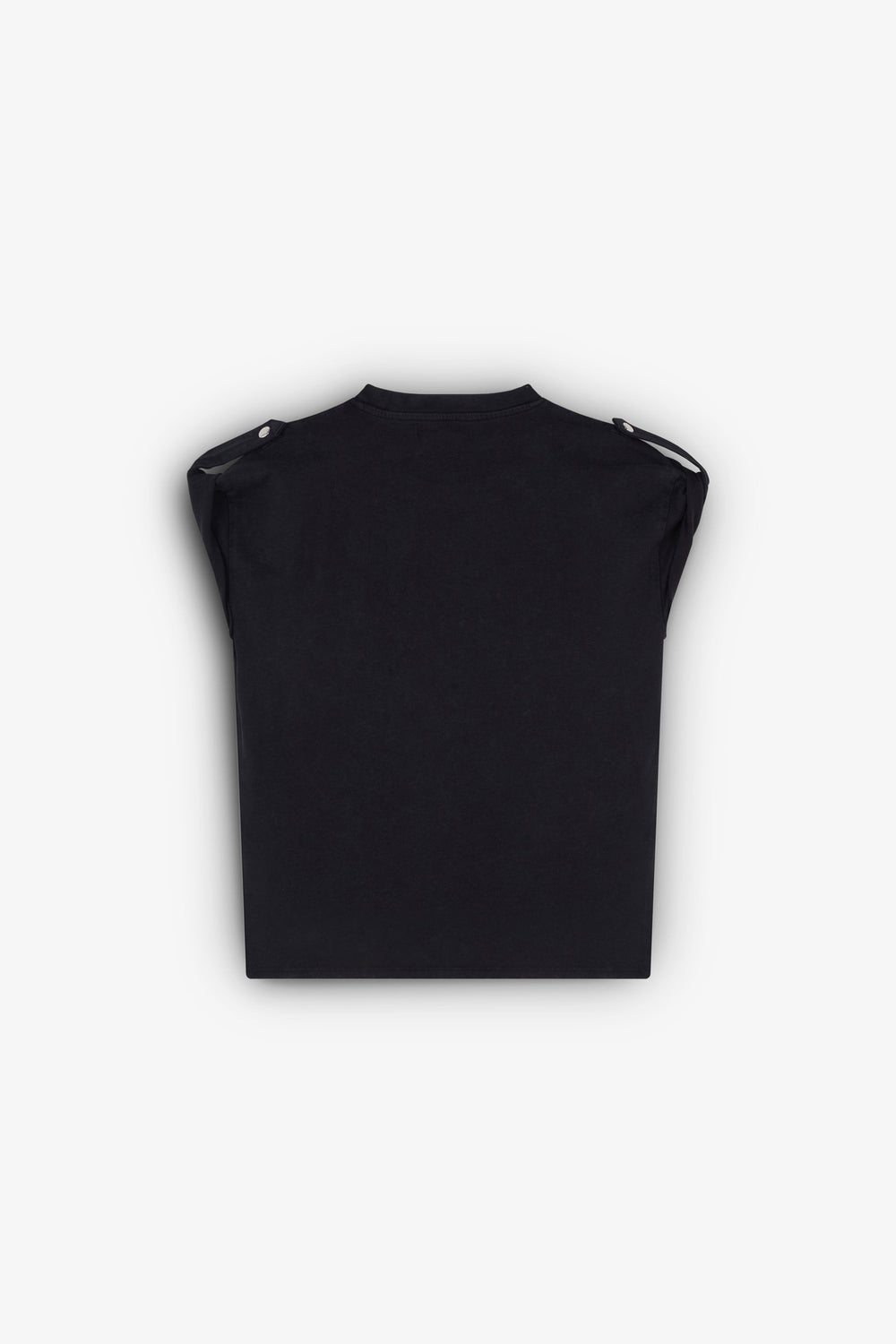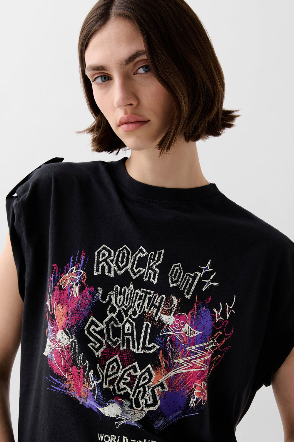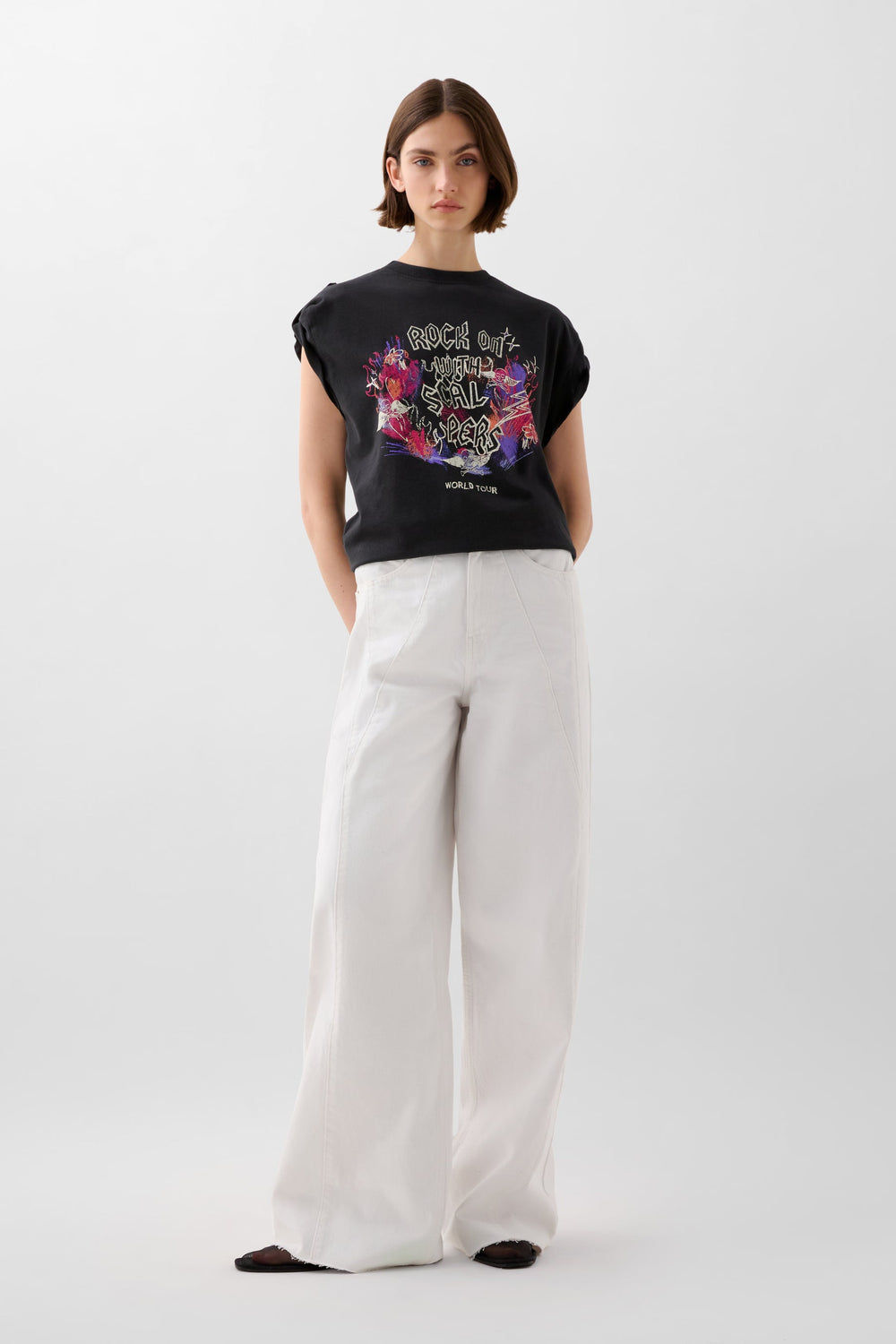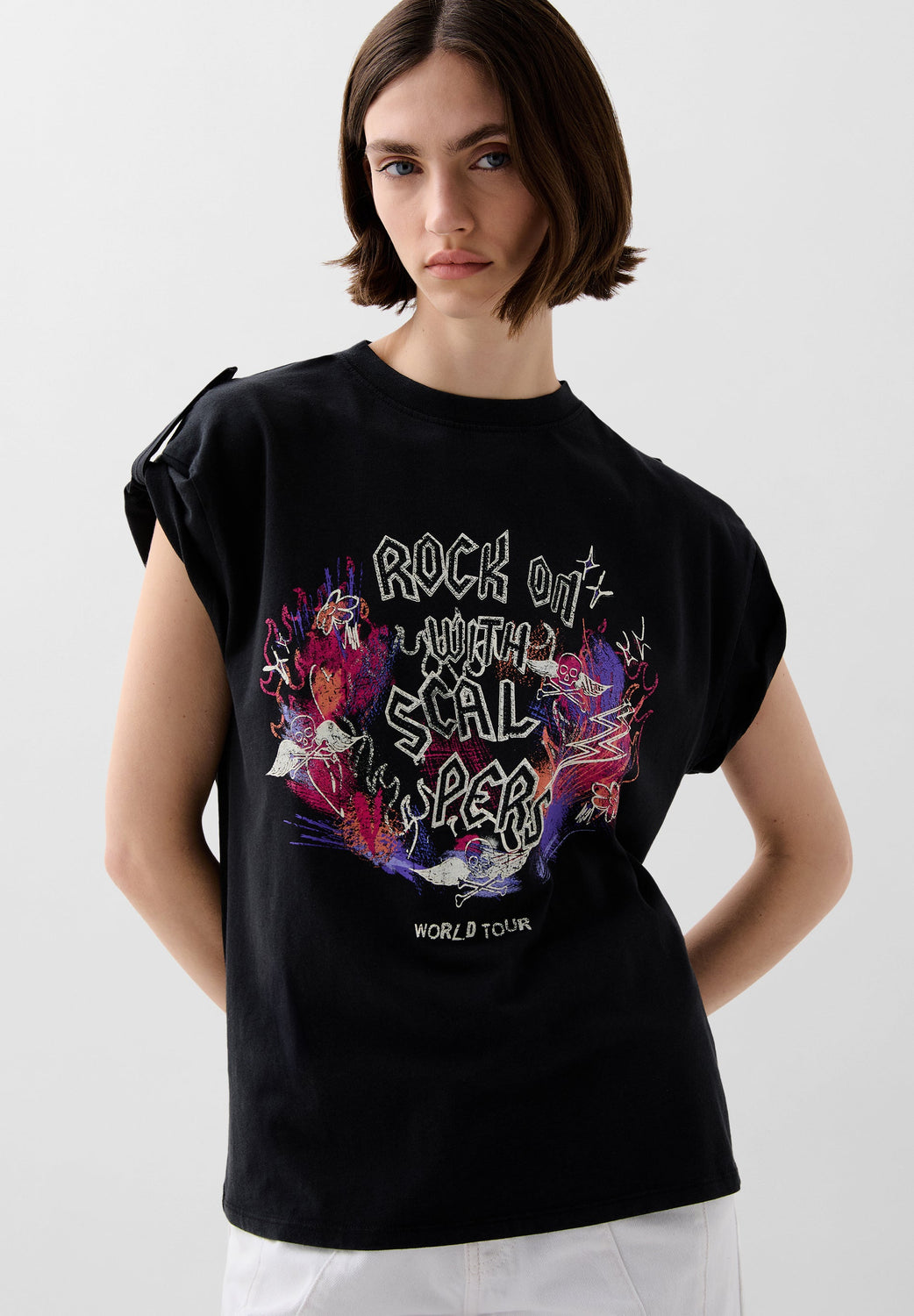 Camiseta confeccionada en algodón 100% BCI. Corte regular Fit, cuello redondo, manga corta con detalle de tirador con cierre de snap en el hombro. Print frontal en pecho con logo.