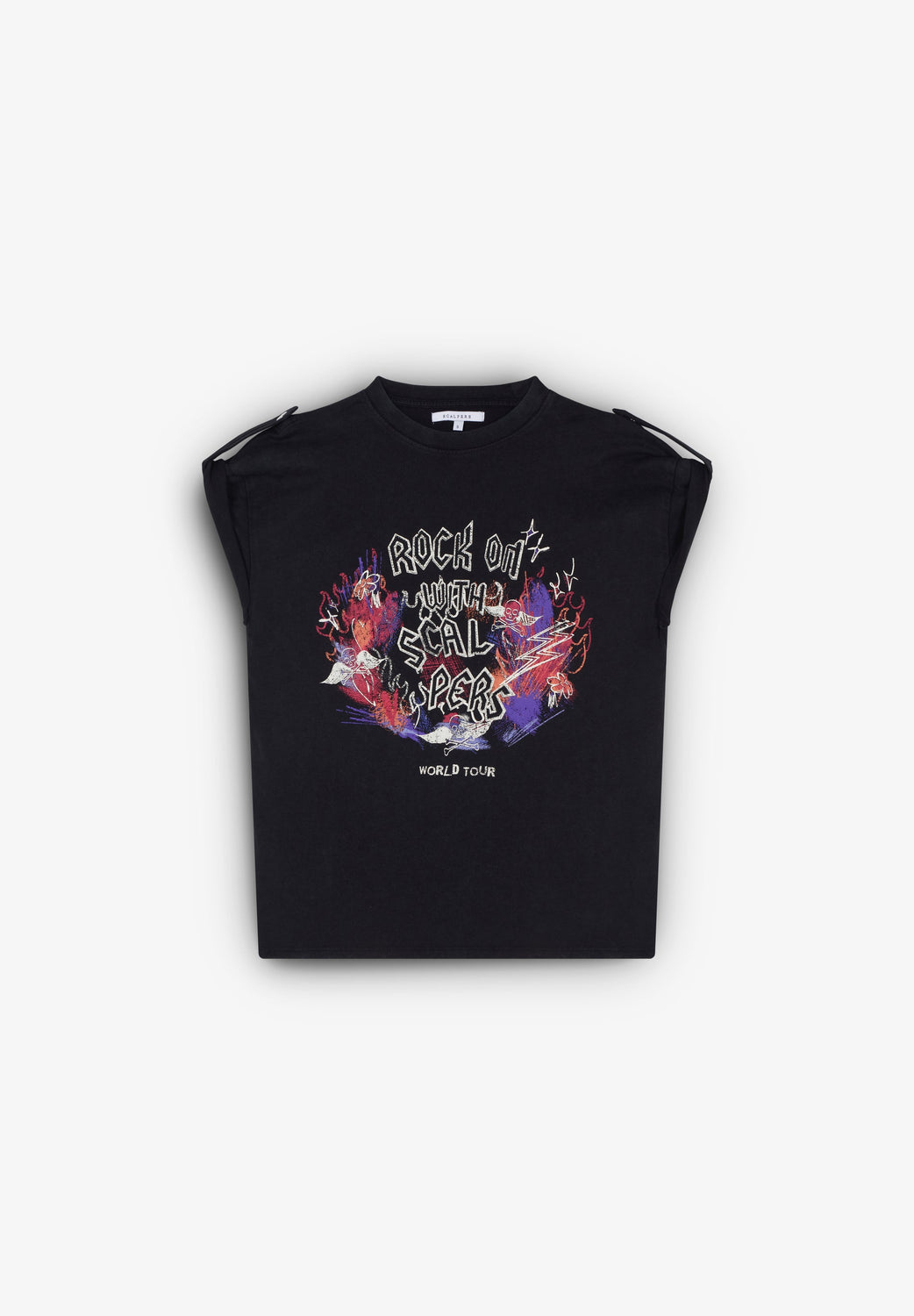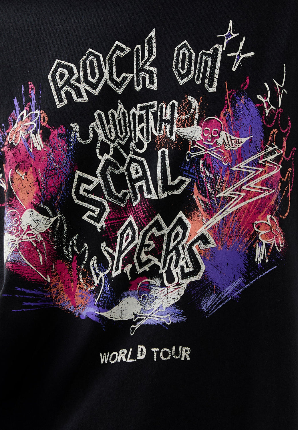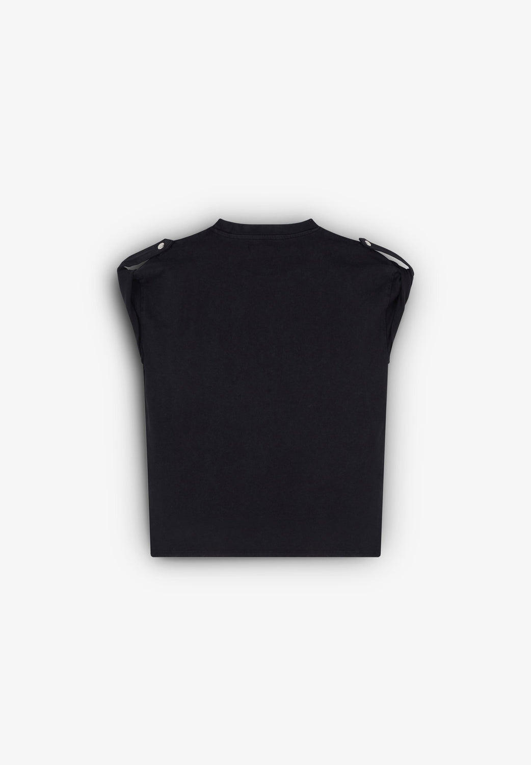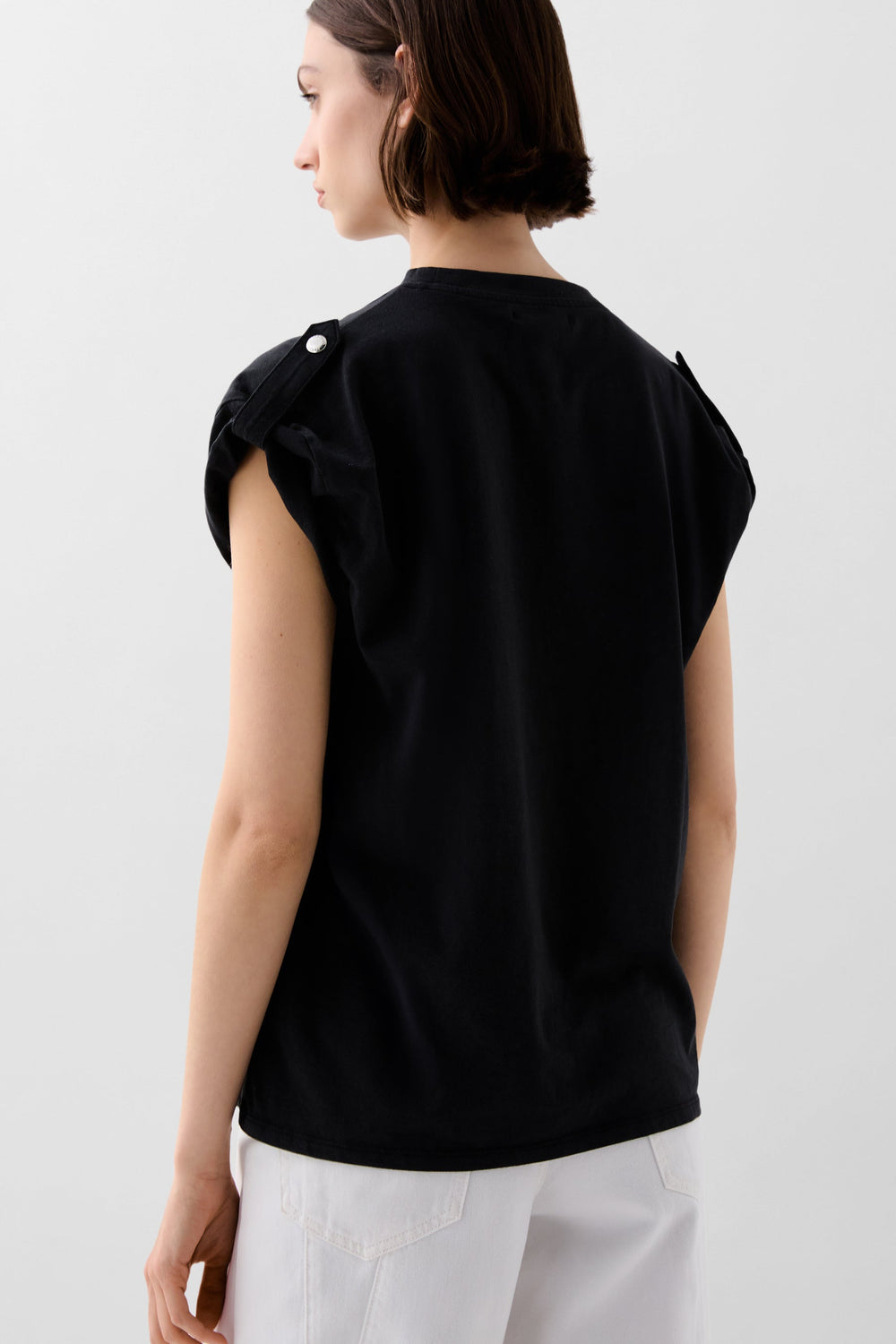 Camiseta confeccionada en algodón 100% BCI. Corte regular Fit, cuello redondo, manga corta con detalle de tirador con cierre de snap en el hombro. Print frontal en pecho con logo.