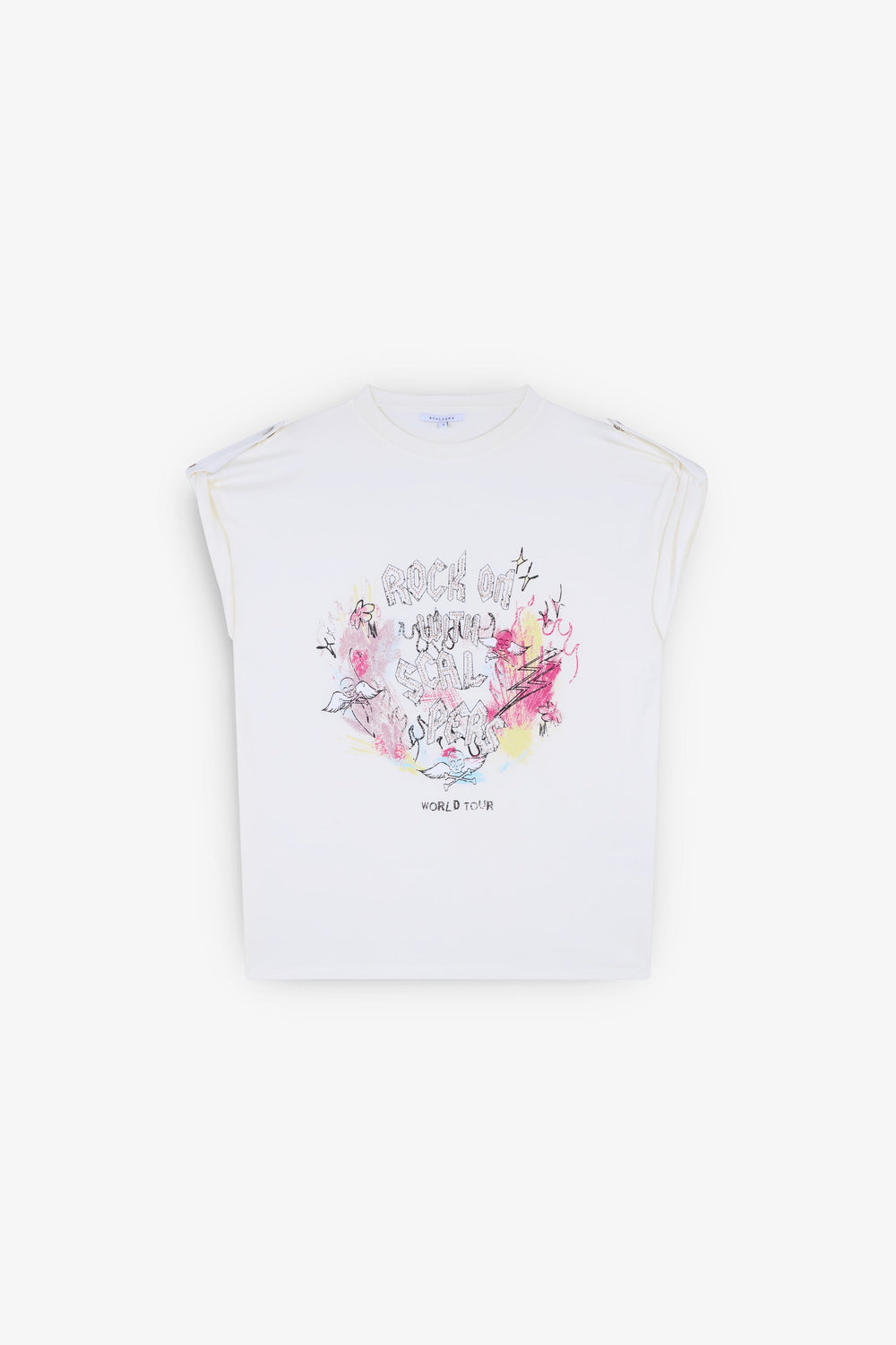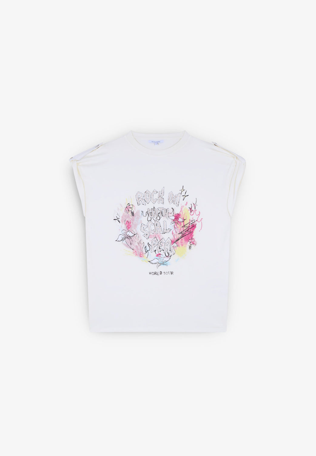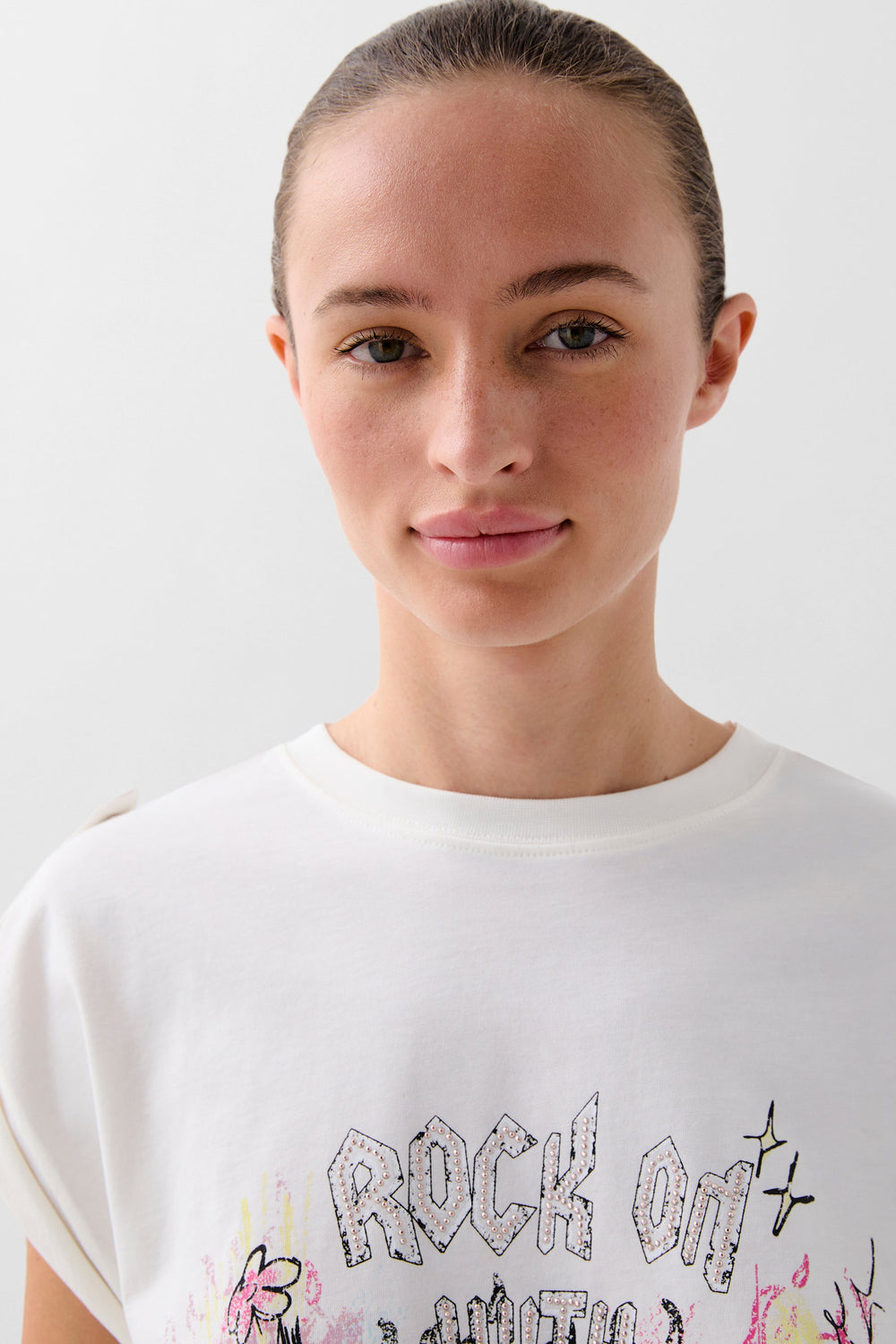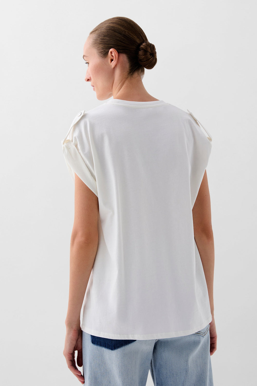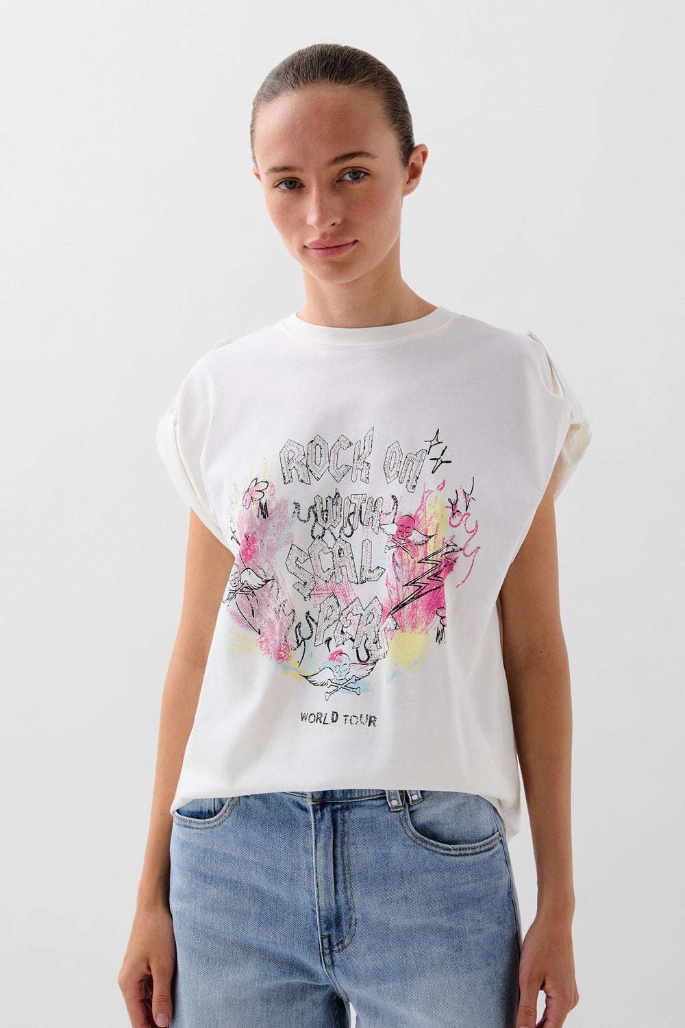 Camiseta confeccionada en algodón 100% BCI. Corte regular Fit, cuello redondo, manga corta con detalle de tirador con cierre de snap en el hombro. Print frontal en pecho con logo.