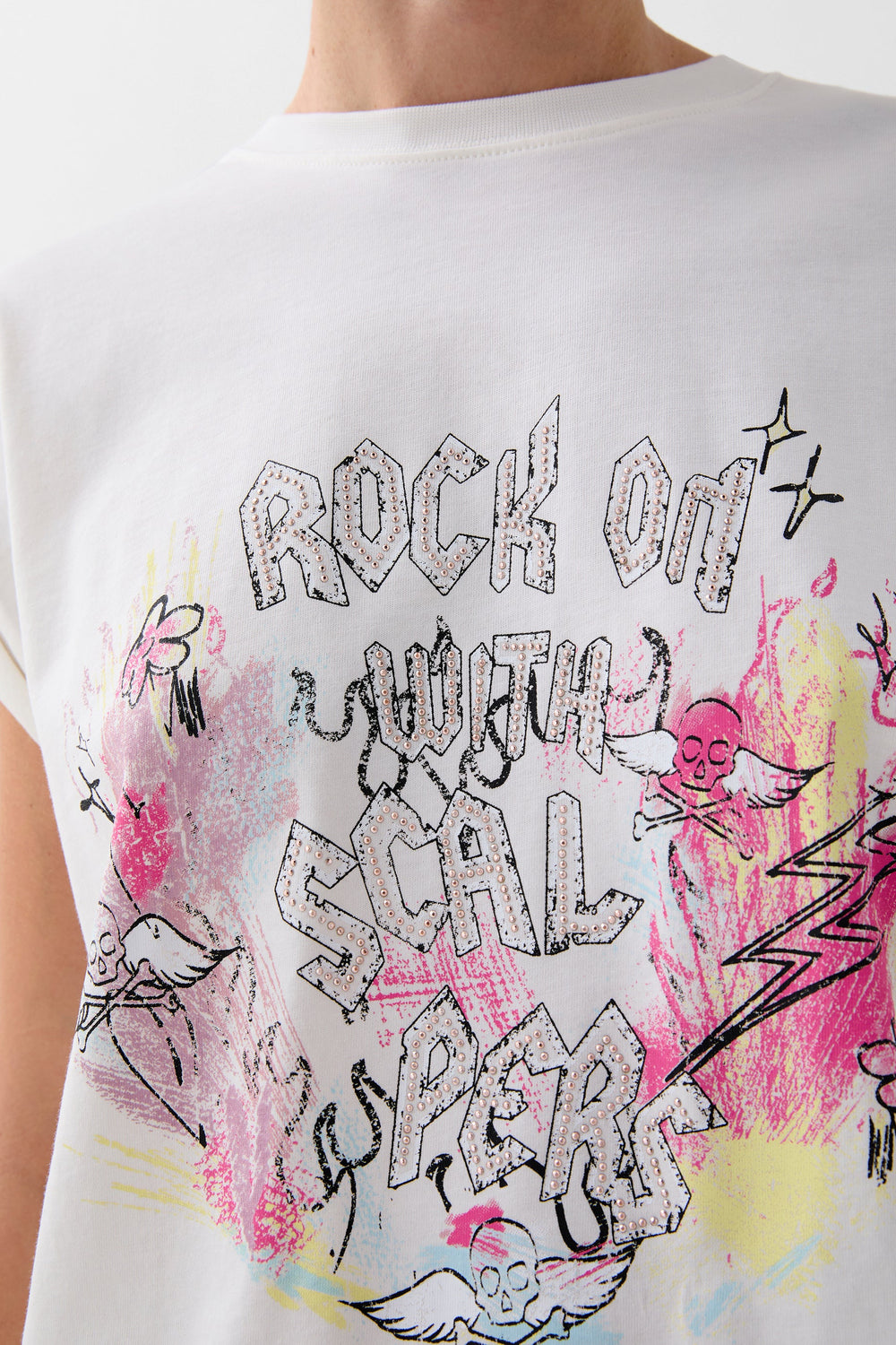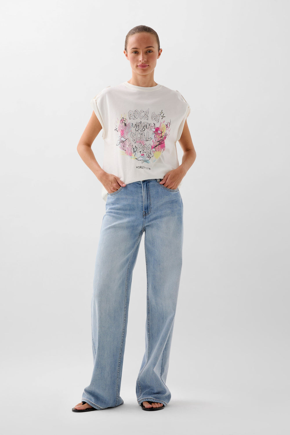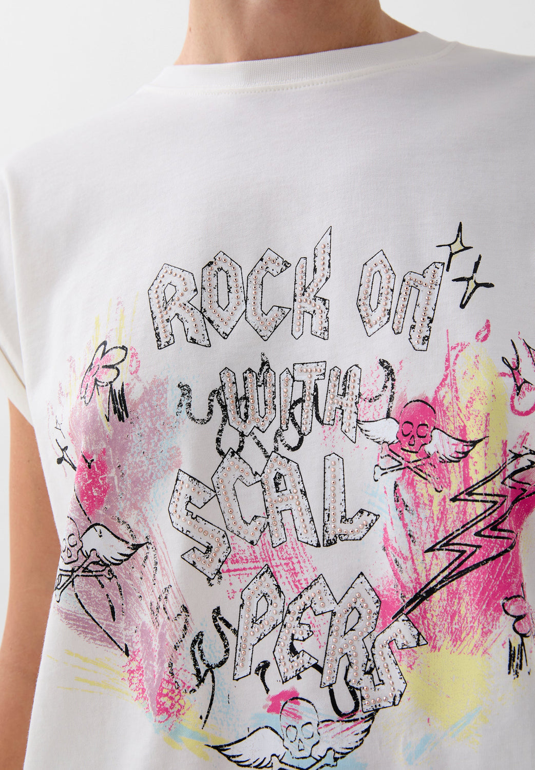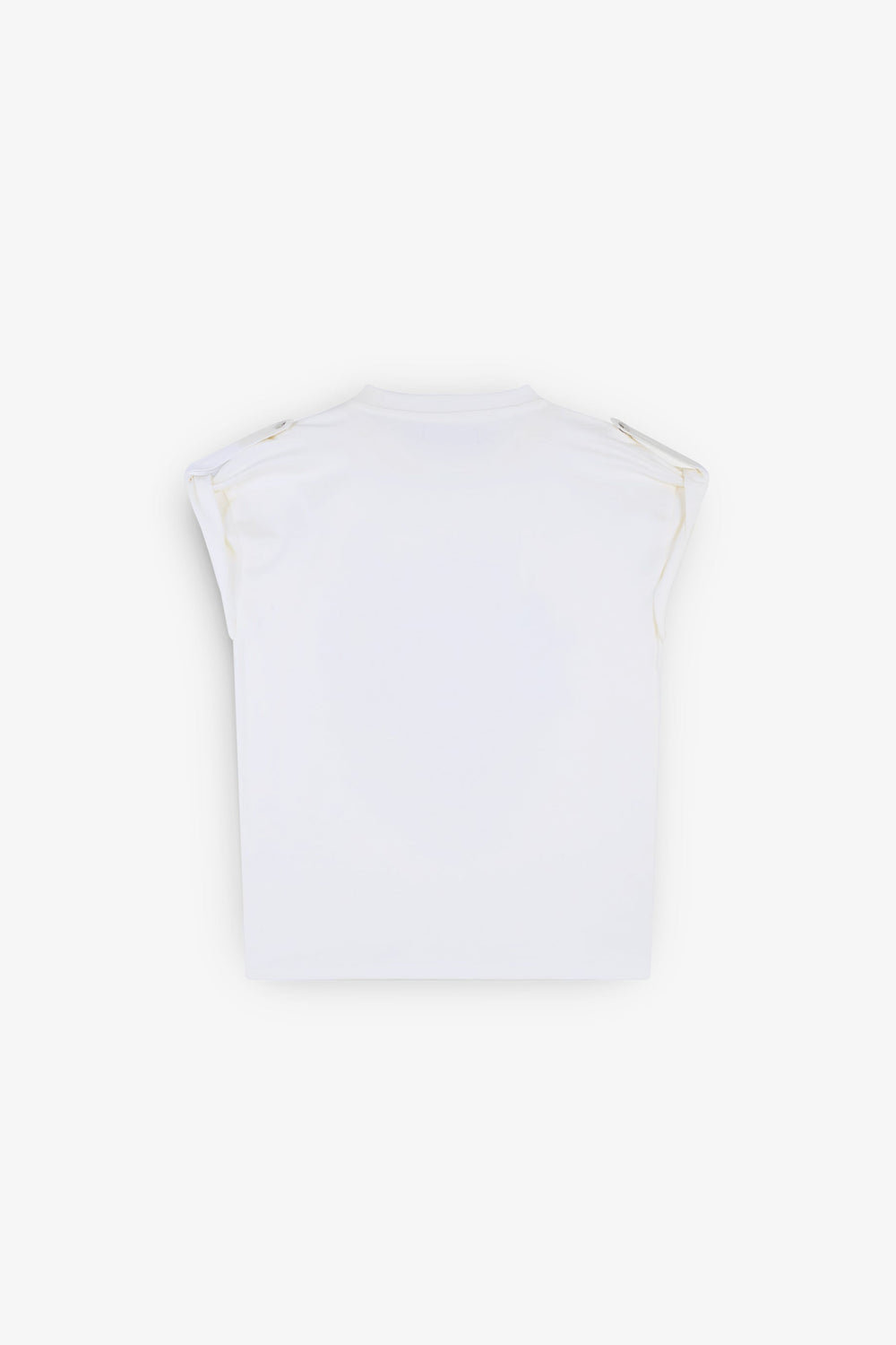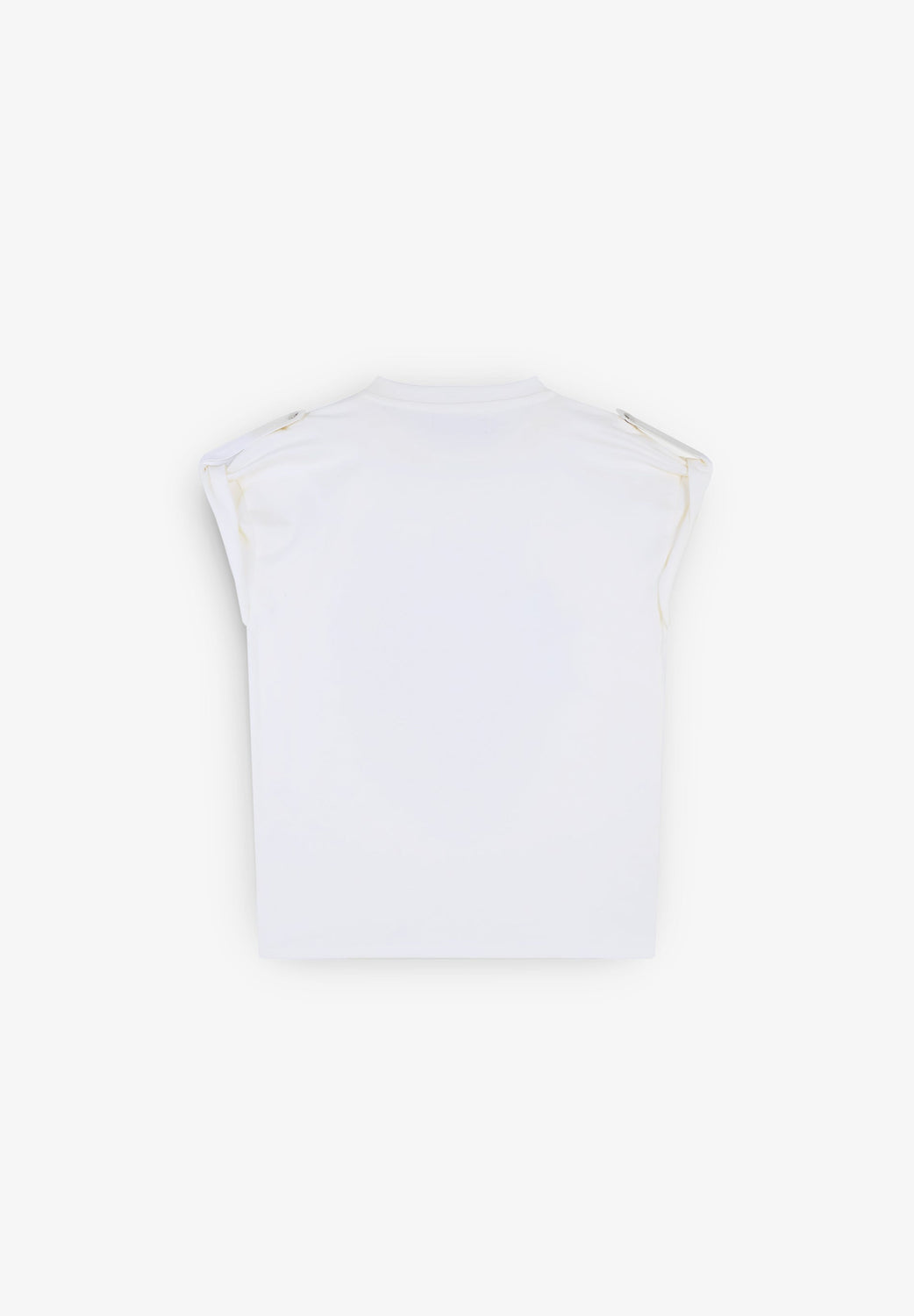 Camiseta confeccionada en algodón 100% BCI. Corte regular Fit, cuello redondo, manga corta con detalle de tirador con cierre de snap en el hombro. Print frontal en pecho con logo.