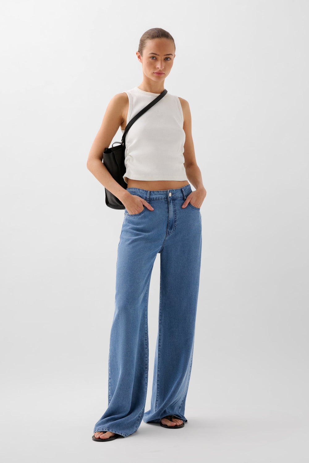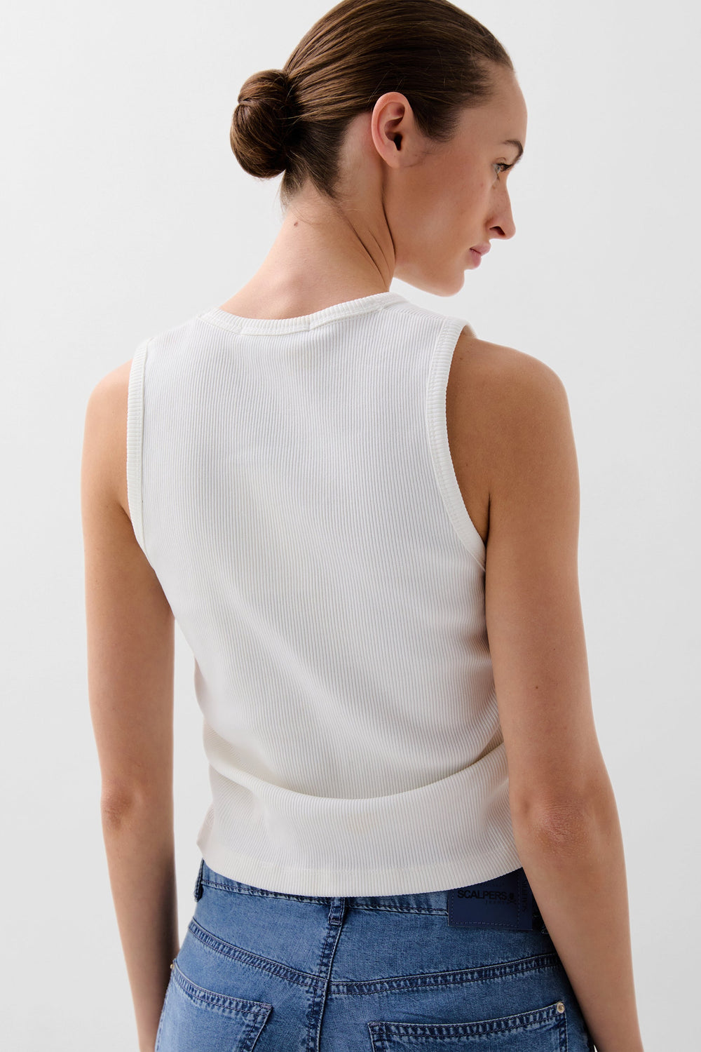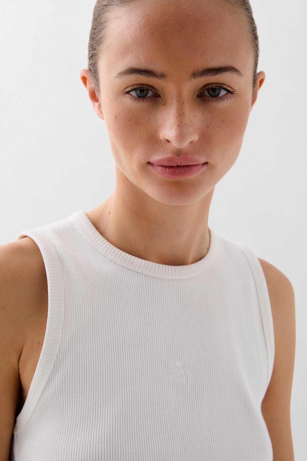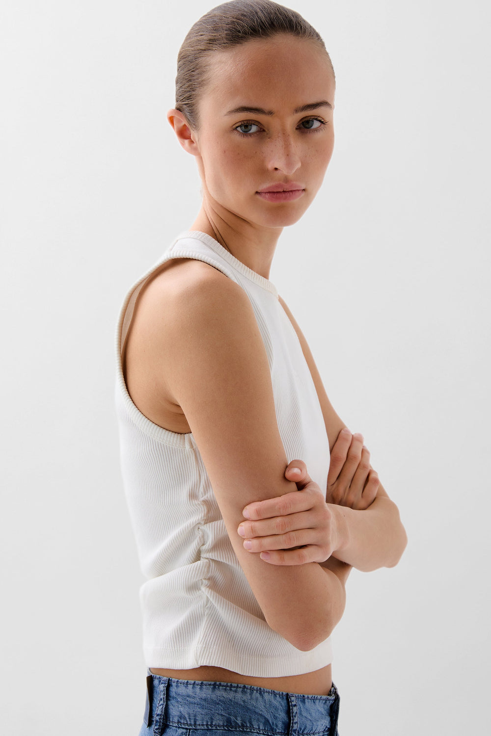 Tank top confeccionado en tejido rib en mezcla de 90% algodón BCI con elastano. Corte slim fit, cuello redondo y manga en sisa. Detalle de frunces laterales.