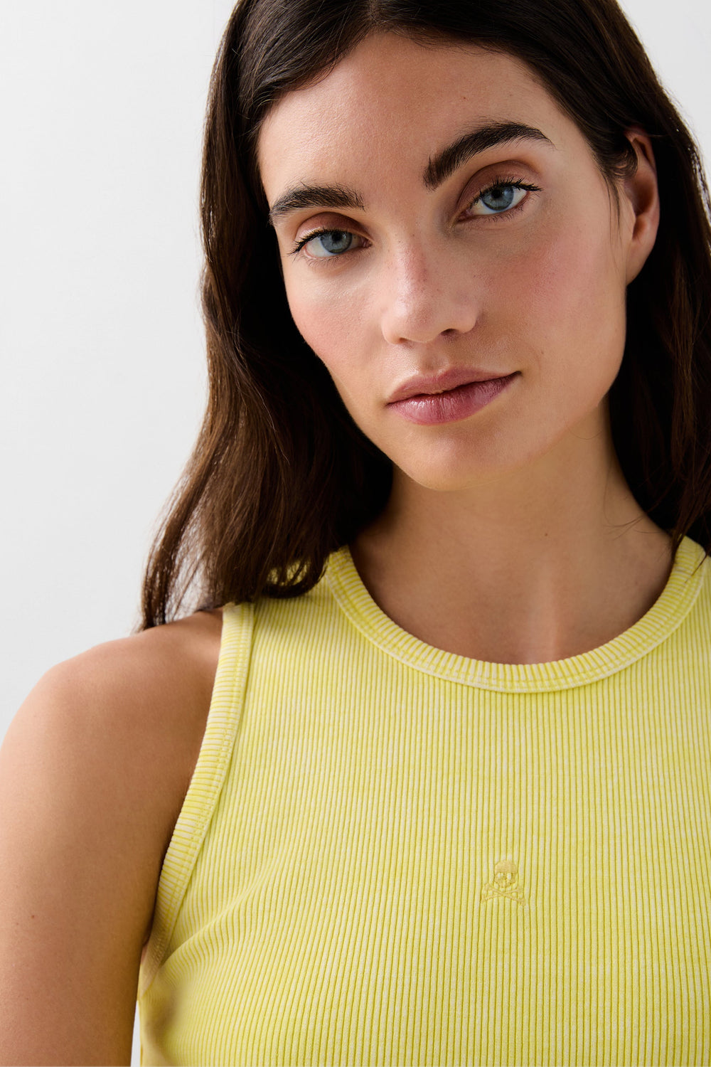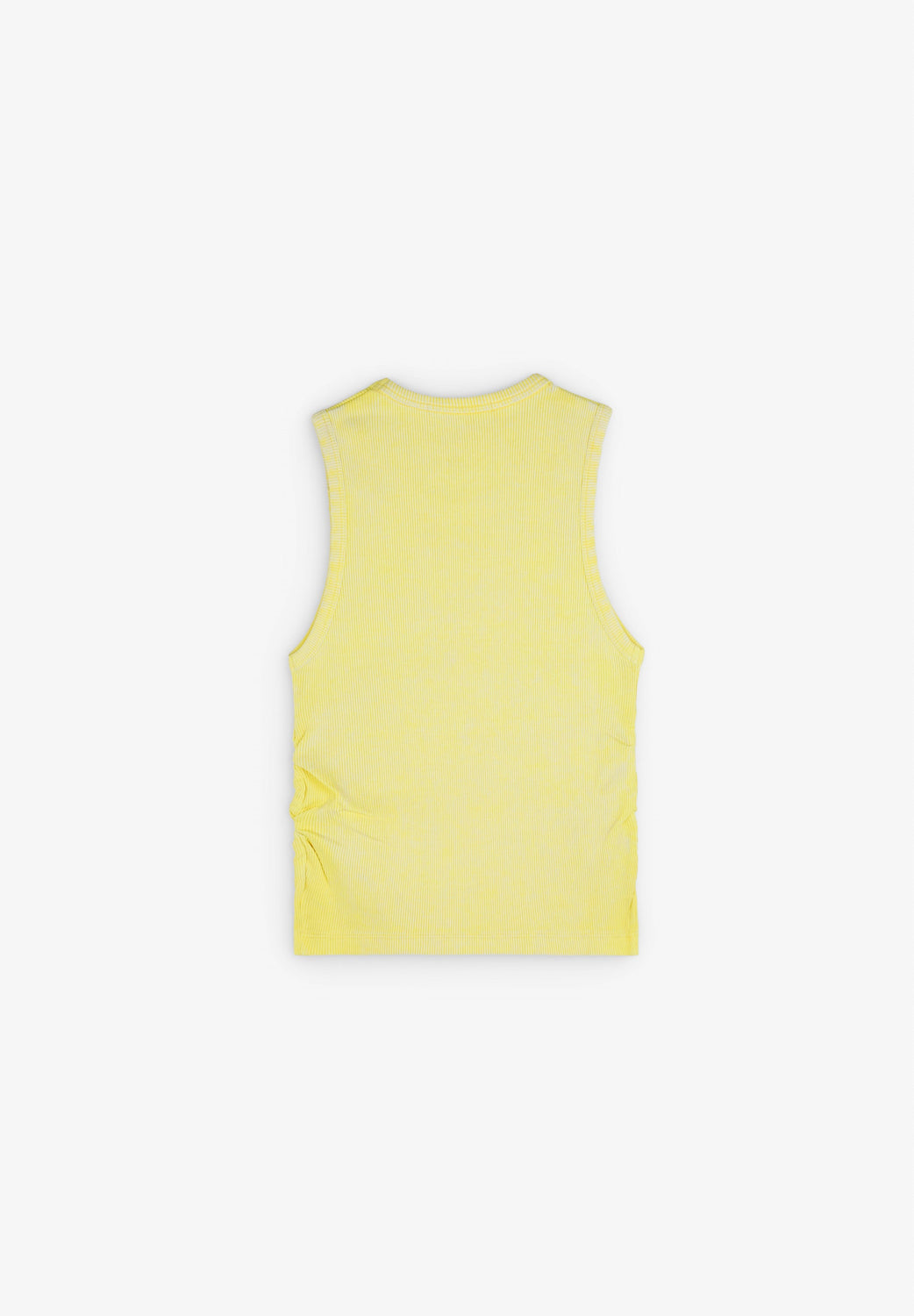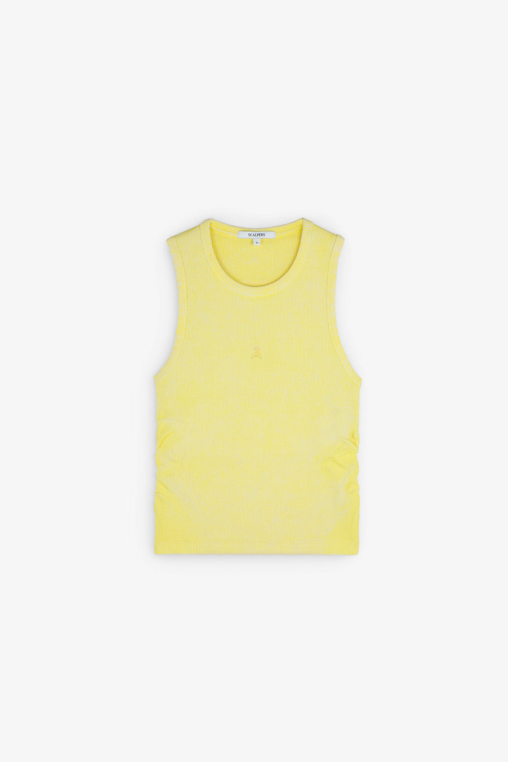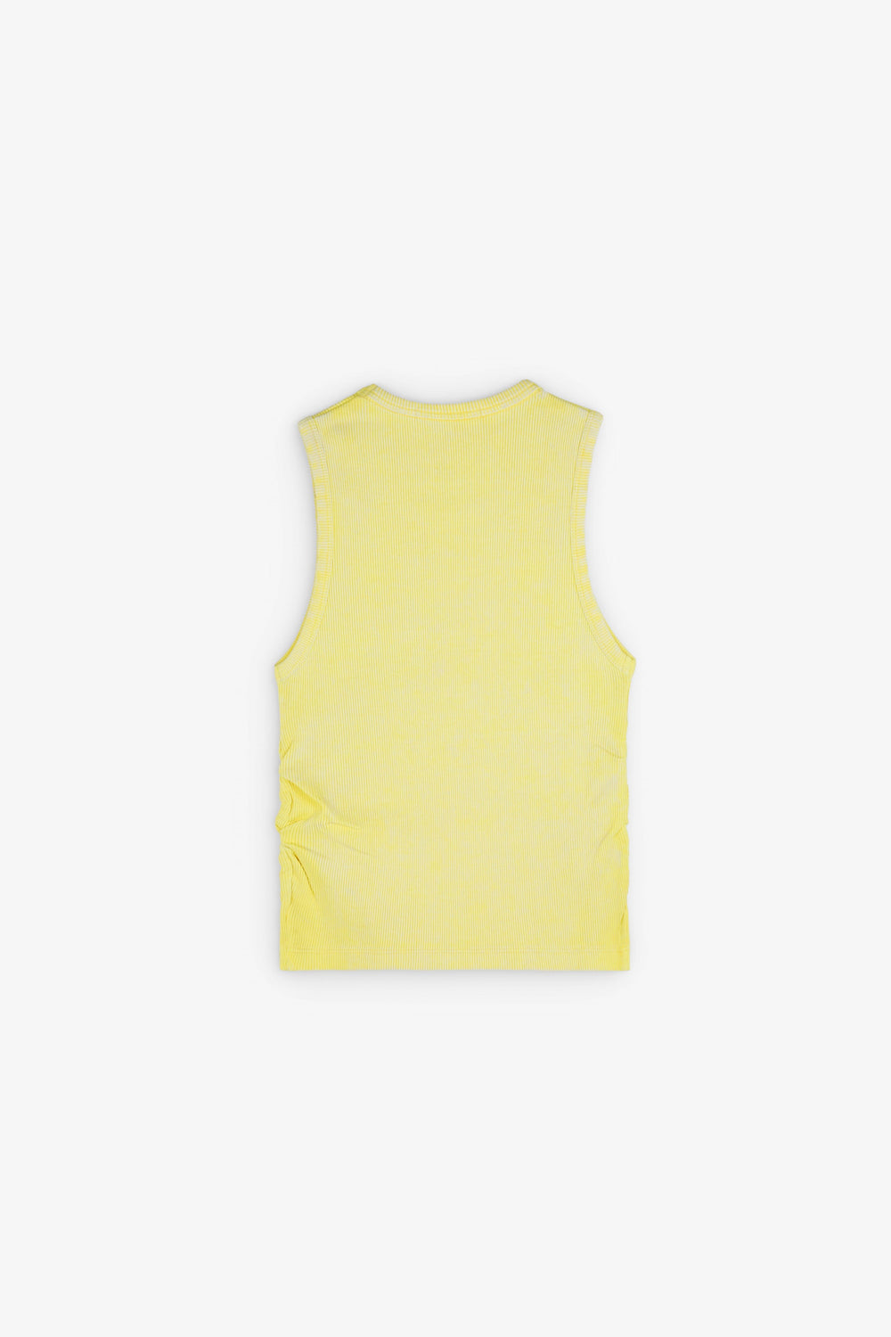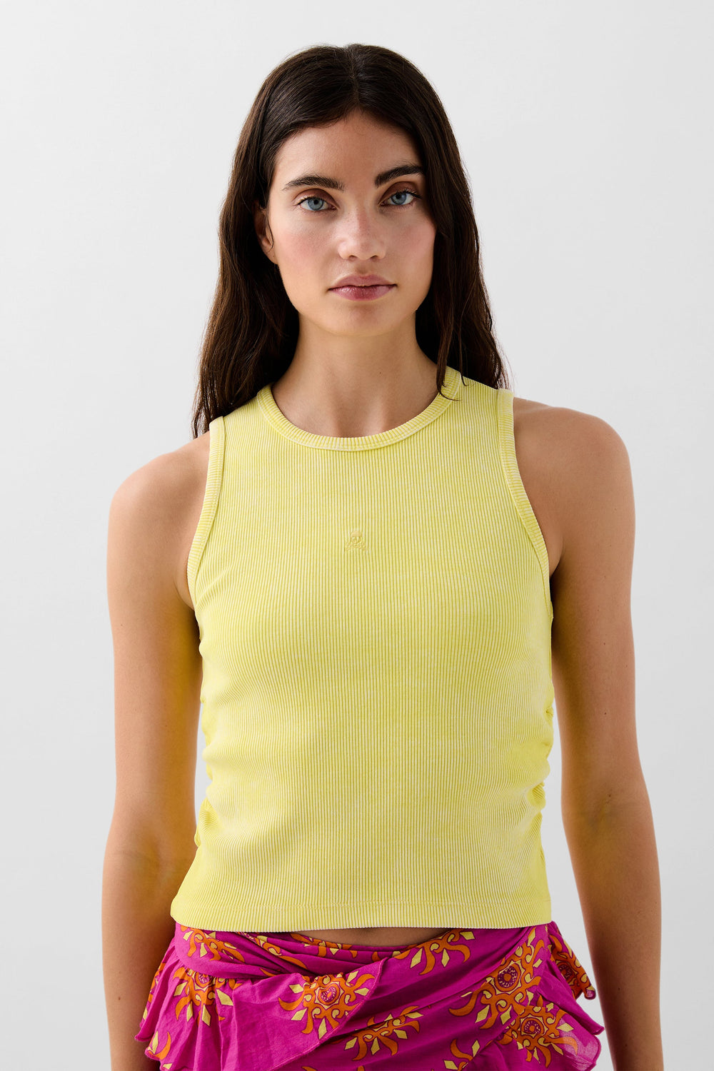 Tank top confeccionado en tejido rib en mezcla de 90% algodón BCI con elastano. Corte slim fit, cuello redondo y manga en sisa. Detalle de frunces laterales.