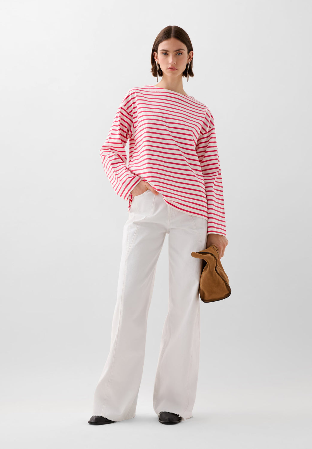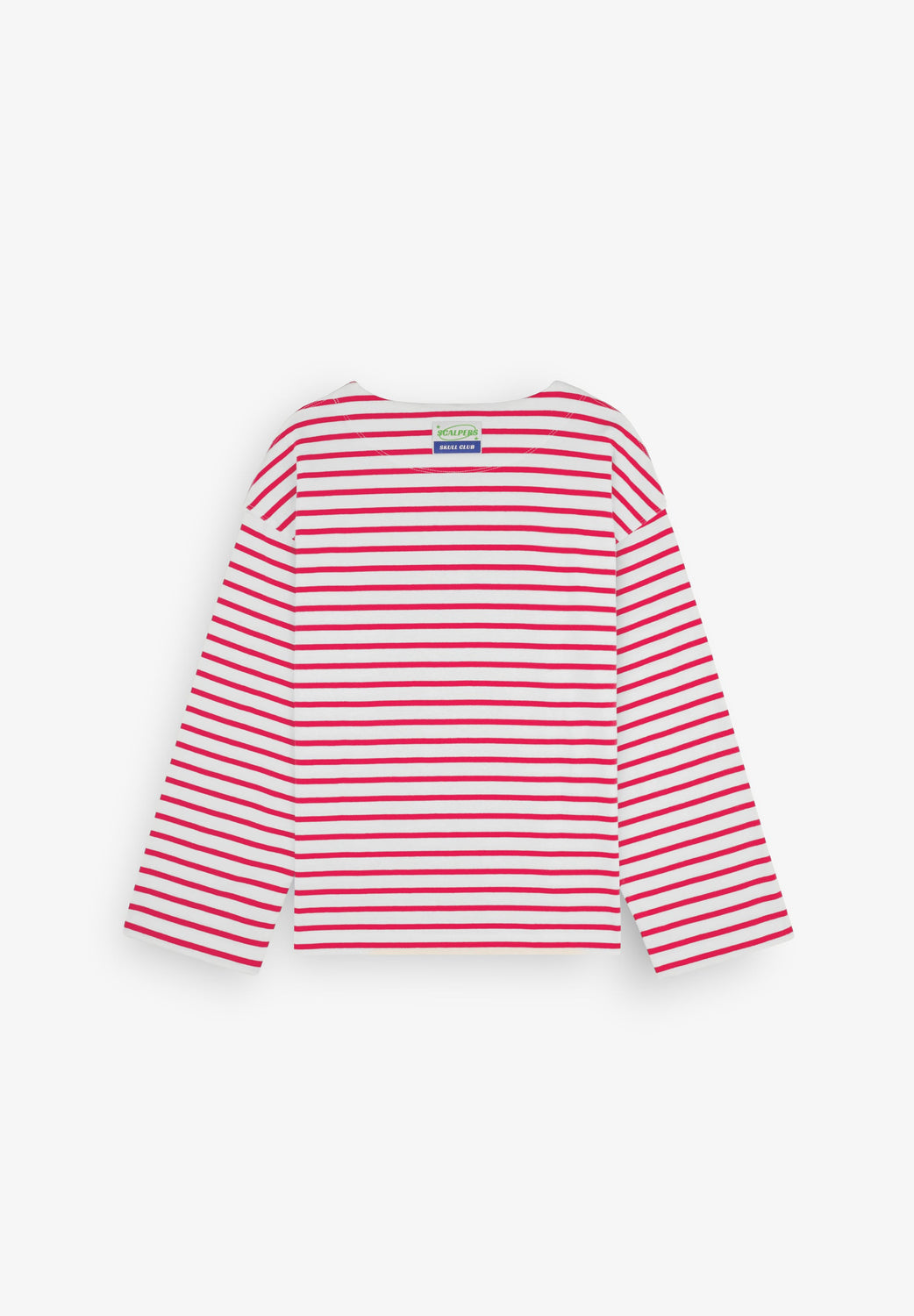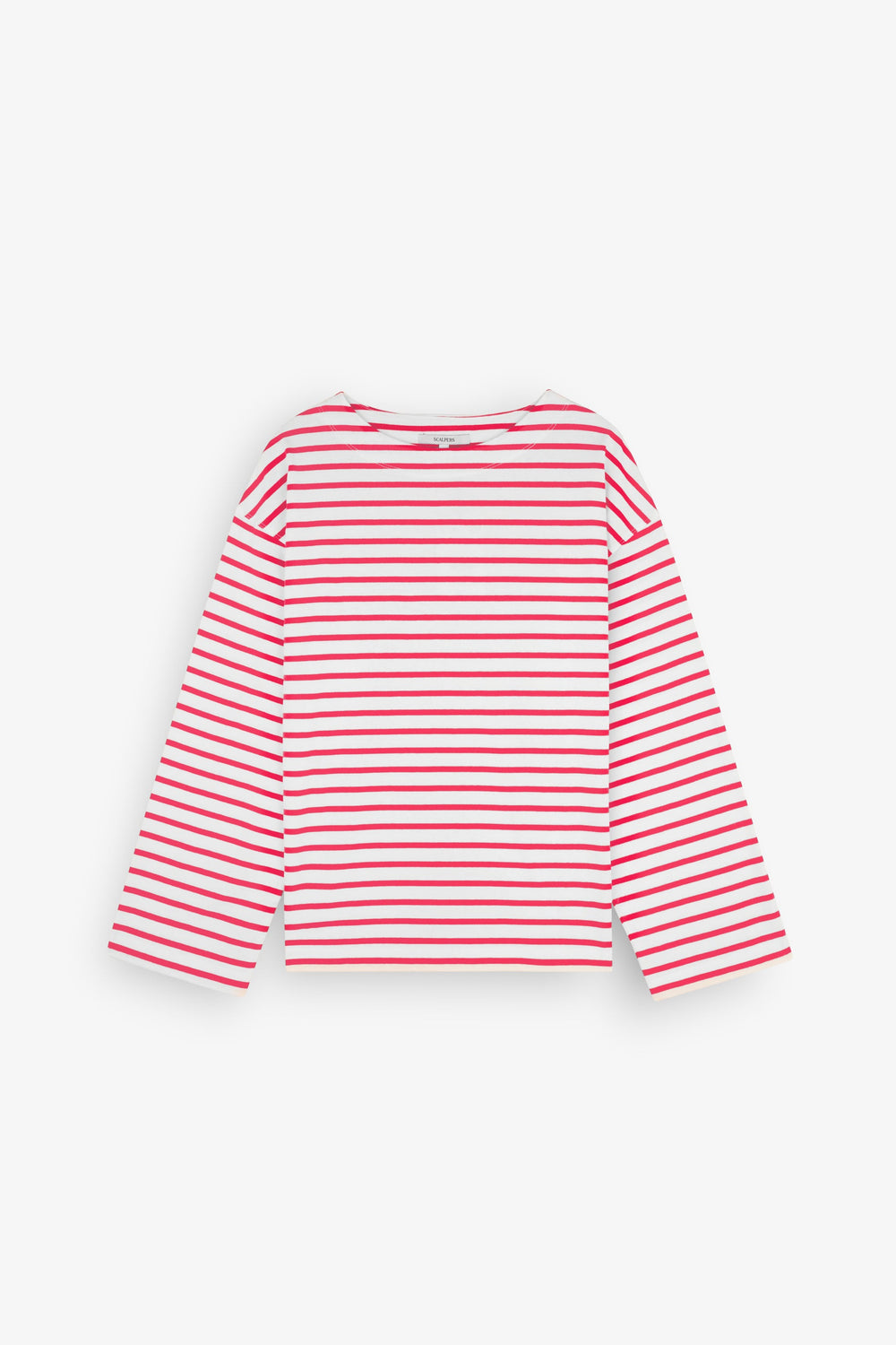 Camiseta de rayas confeccionada en 100% algodón. Relaxed fit, cuello redondo y manga larga. Detalle de etiqueta de logo trasera.