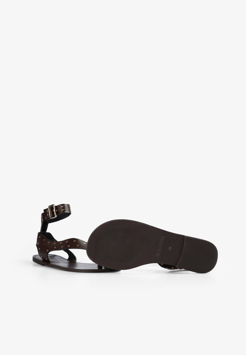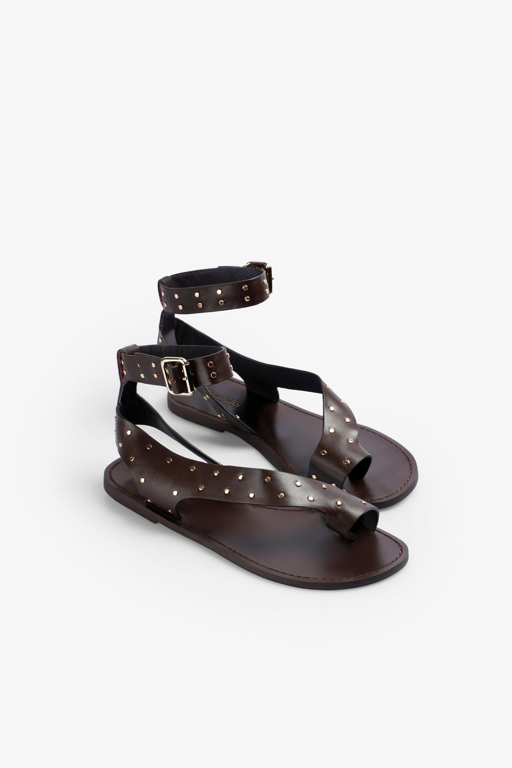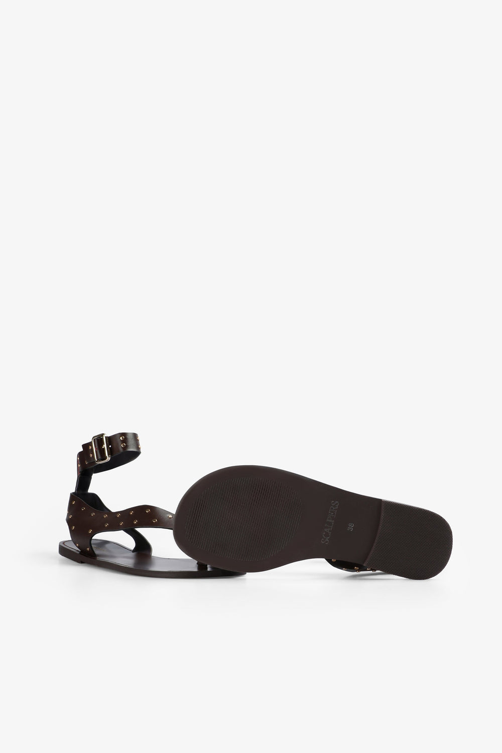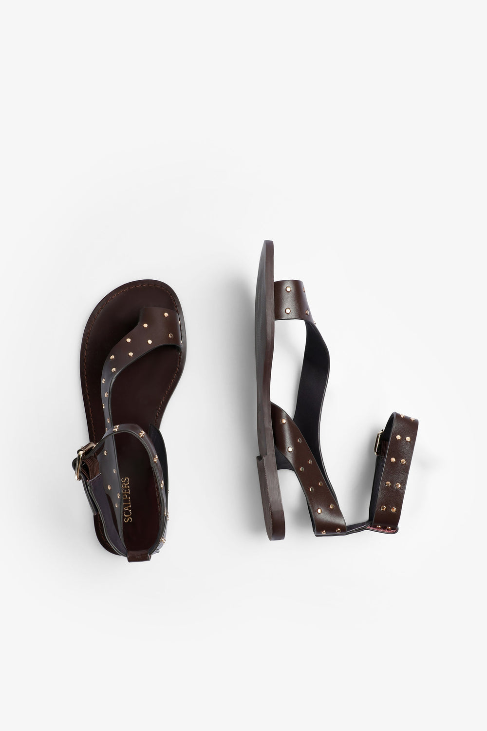 Sandalia confeccionada en 100% Piel. Plana con tira gruesa y adornos metálicos. Cierre mediante hebilla en tobillo.