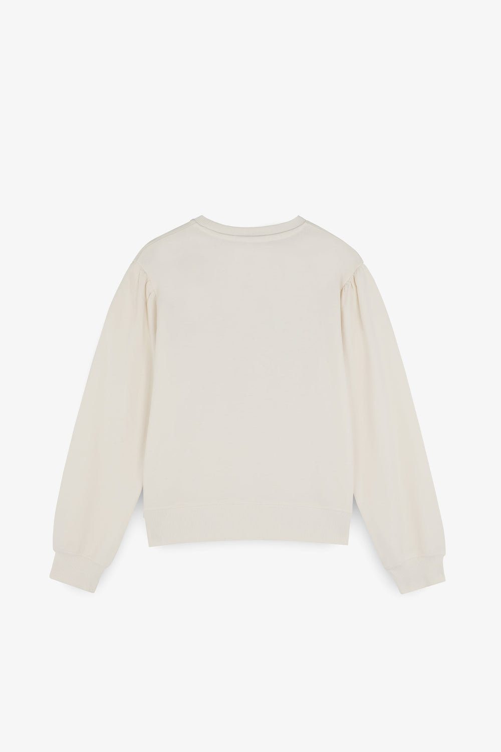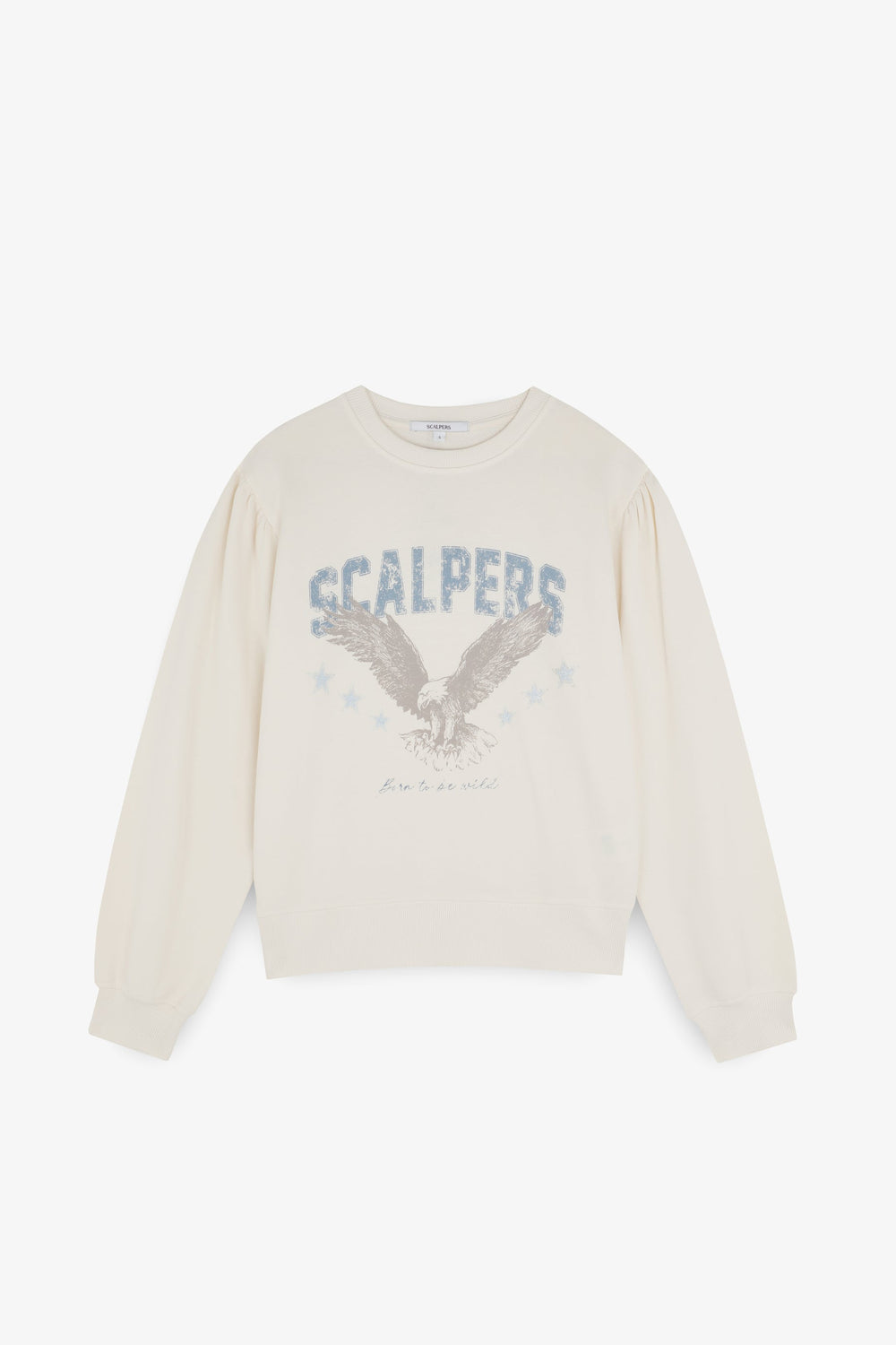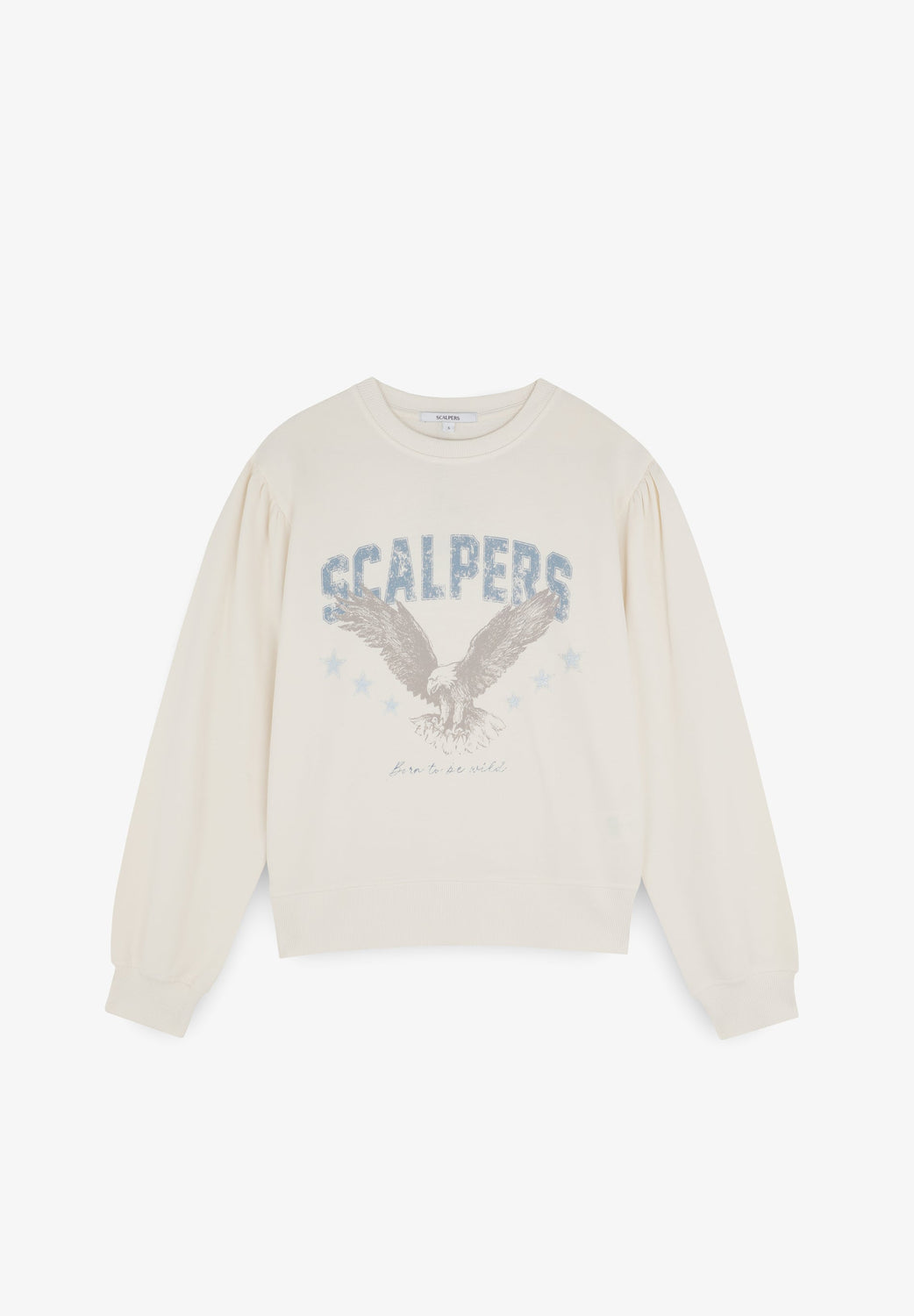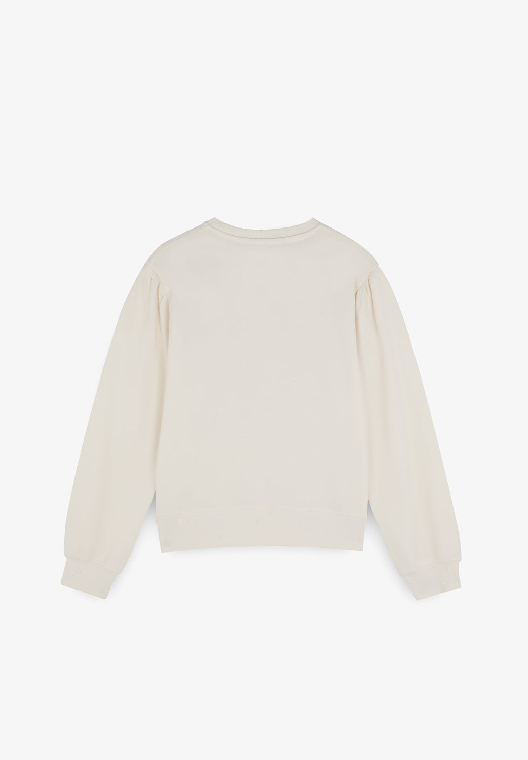 Sudadera confeccionada en 100% Algodón Orgánico BCI. Cuello redondo. Manga larga. Acabado en RIB en puños, cuello y cintura. Estampado efecto lavado en frontal.