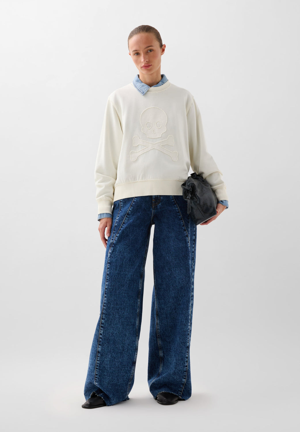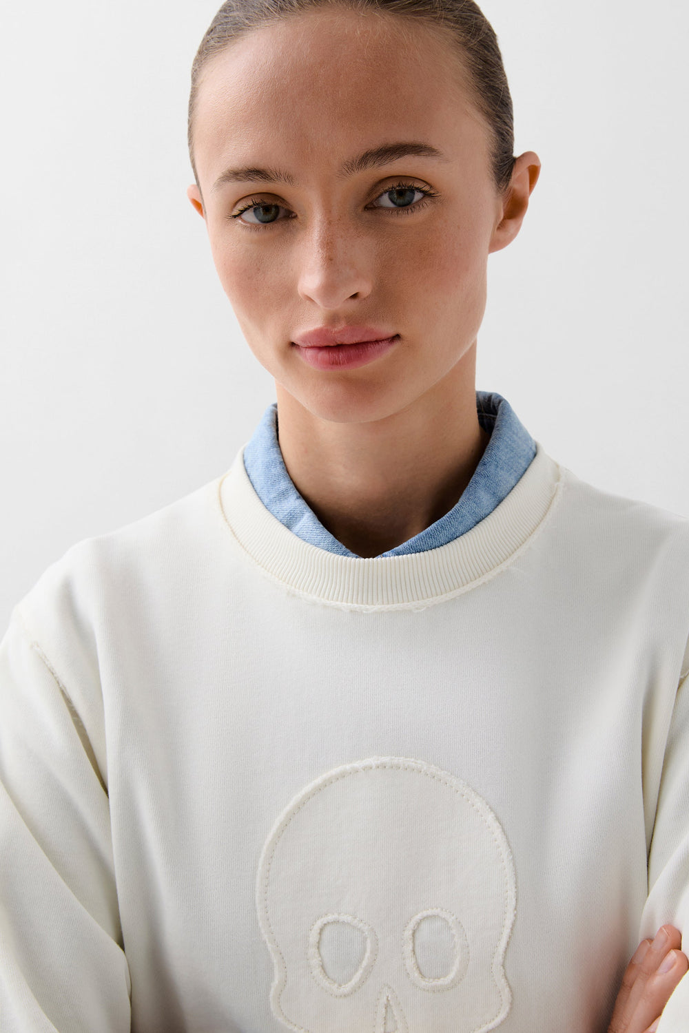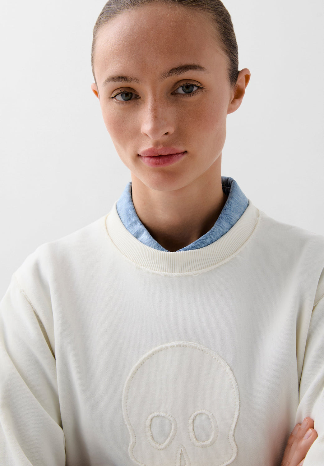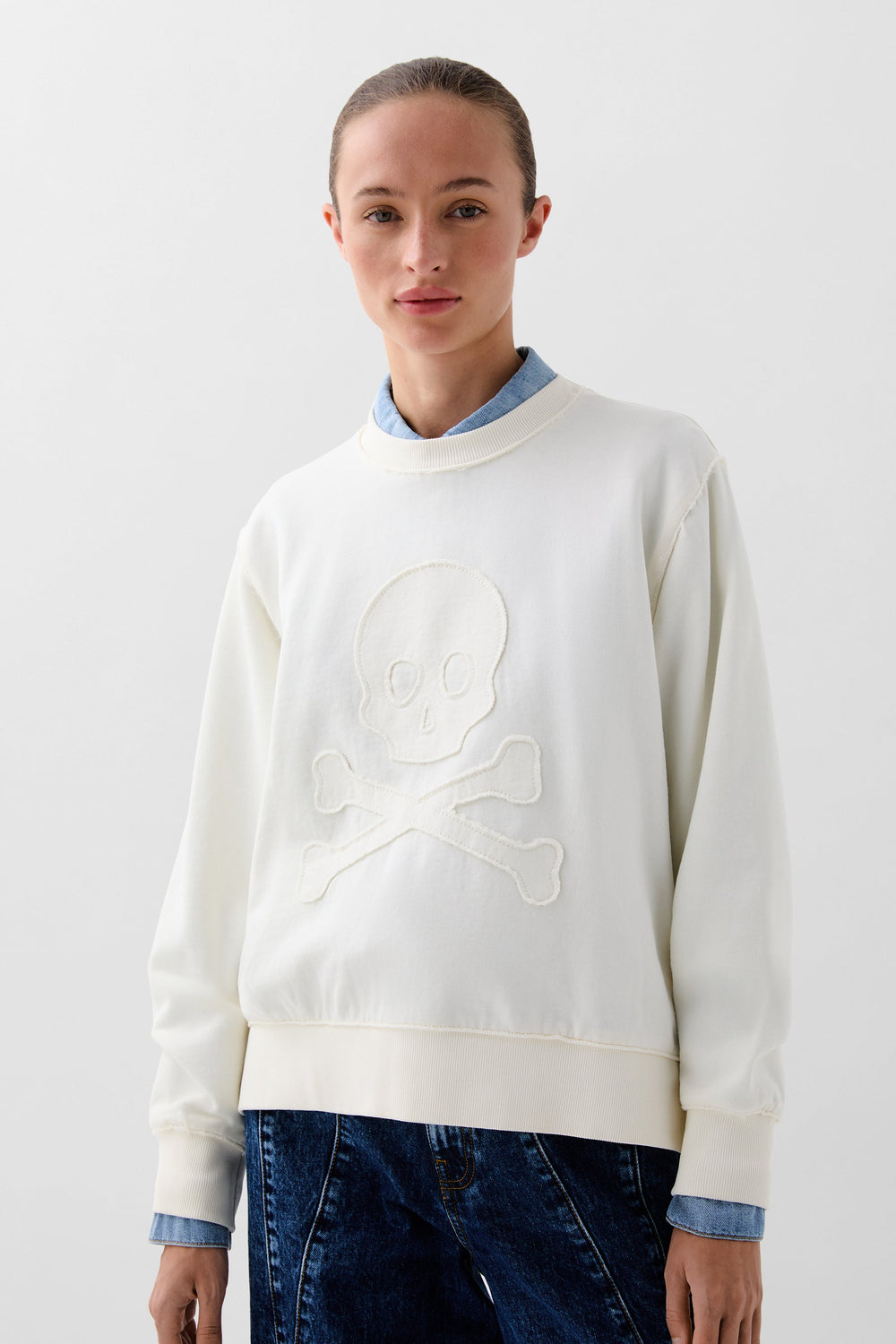 Sudadera confeccionada en algodón ligeramente elástico. Regular fit, cuello redondo y manga largo con puños acabados en rib. Detalle de calavera frontal en relieve.