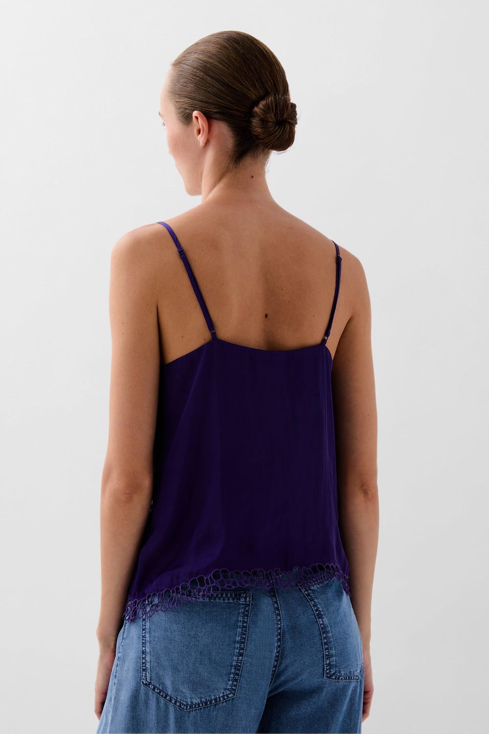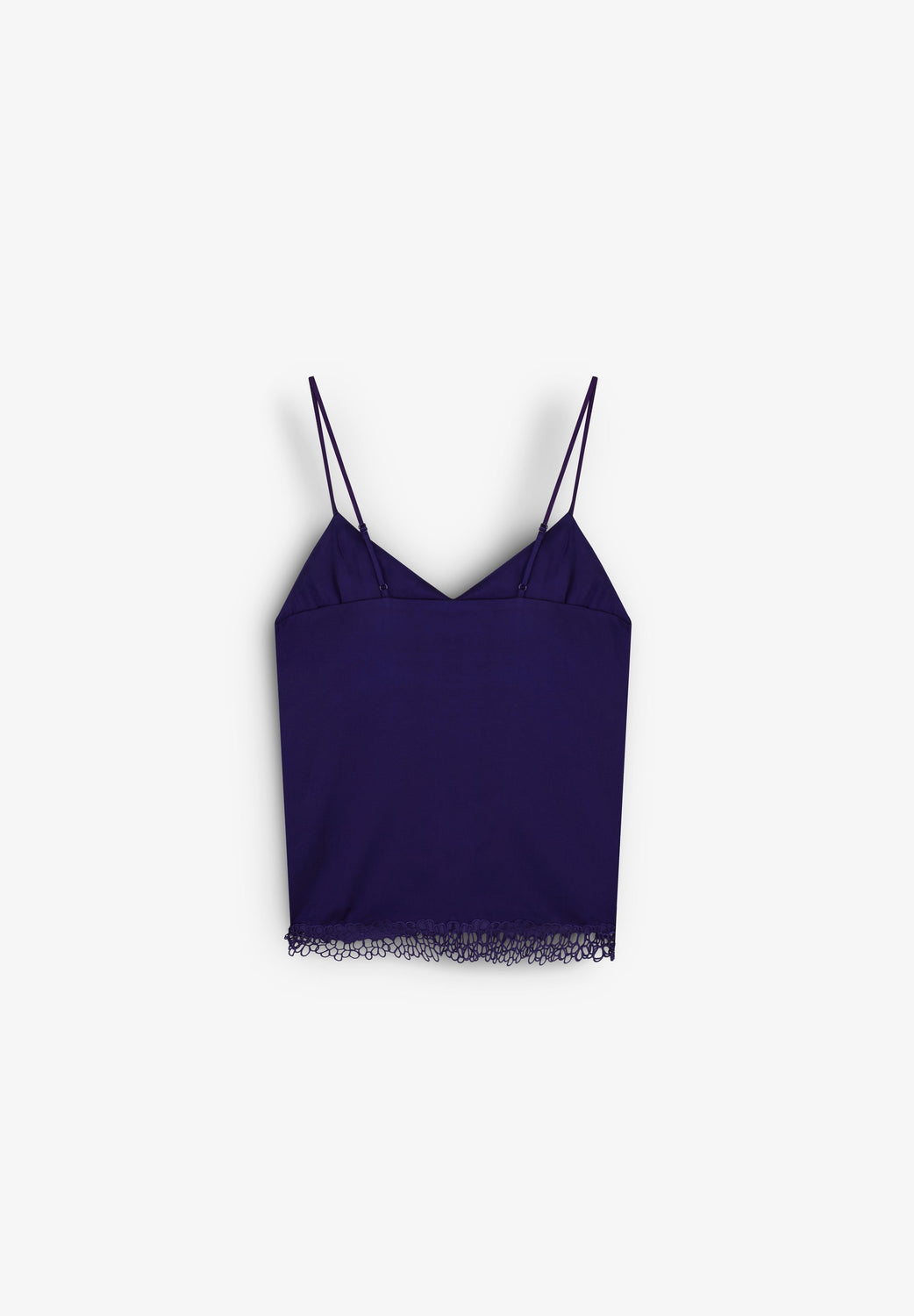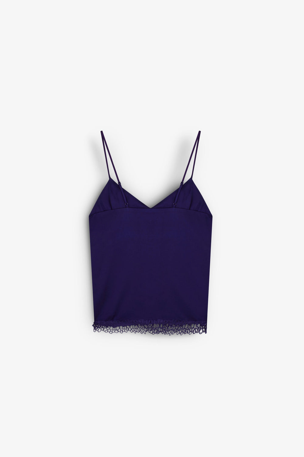Top de tirantes fluidos. Cuello en pico. Detalle de bordados en escote y cintura.