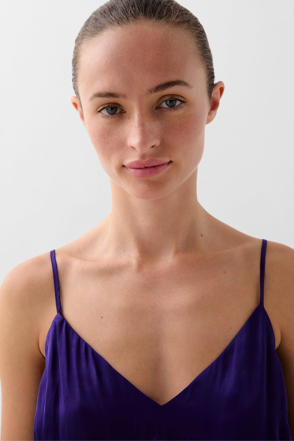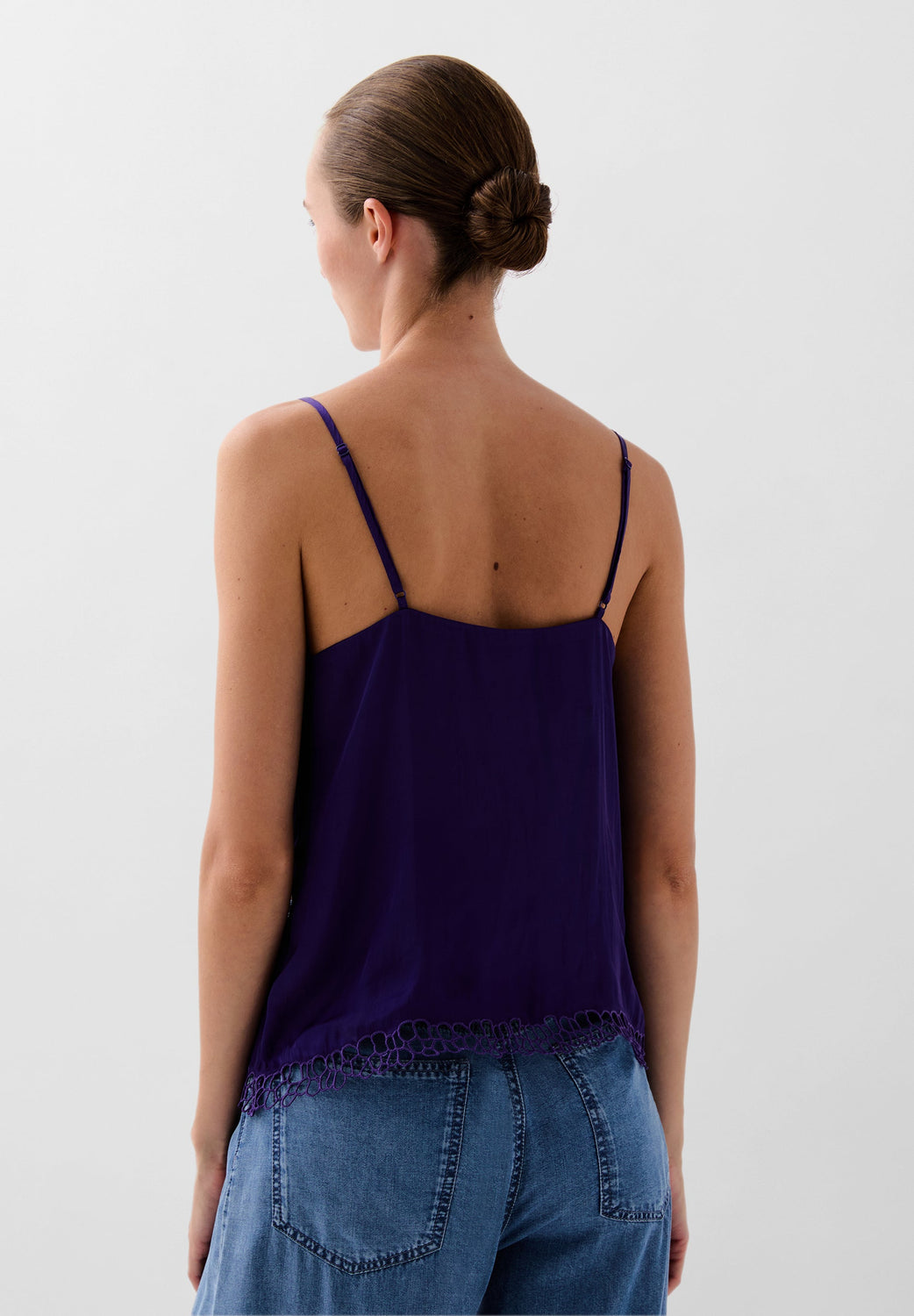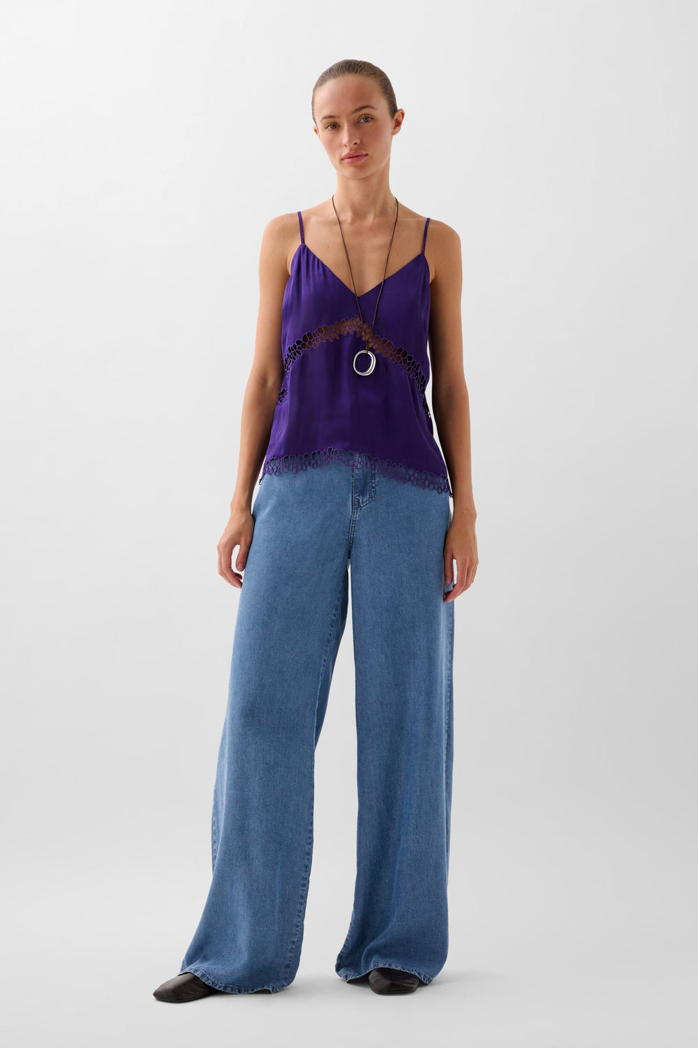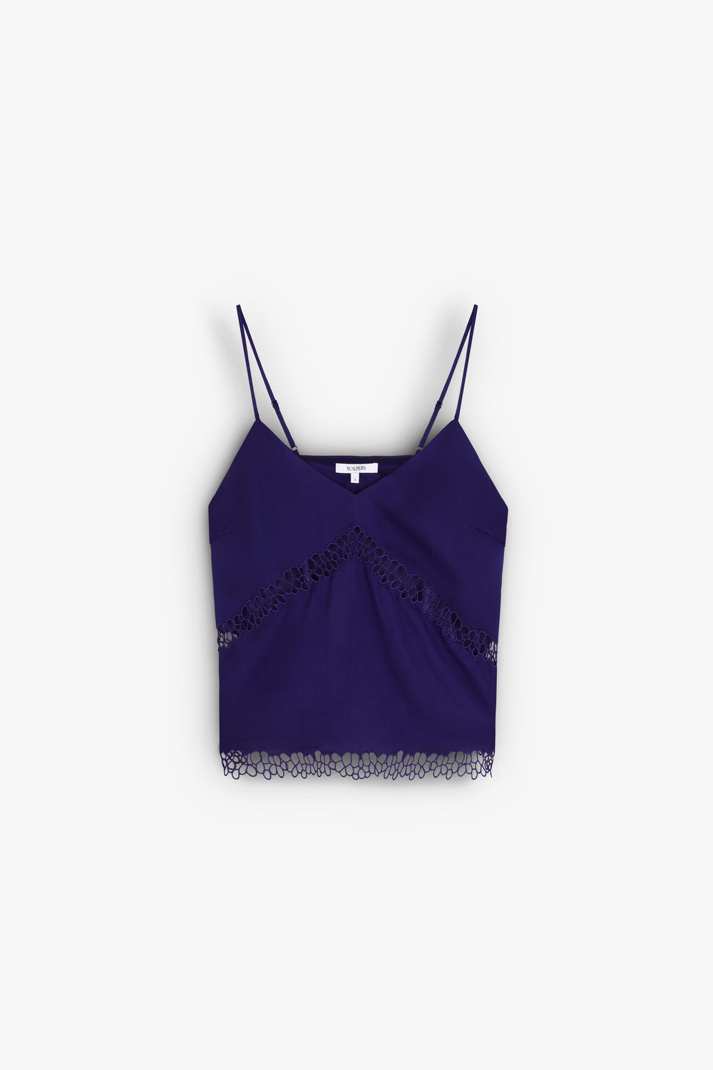 Top de tirantes fluidos. Cuello en pico. Detalle de bordados en escote y cintura.