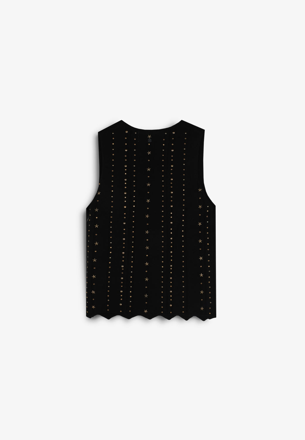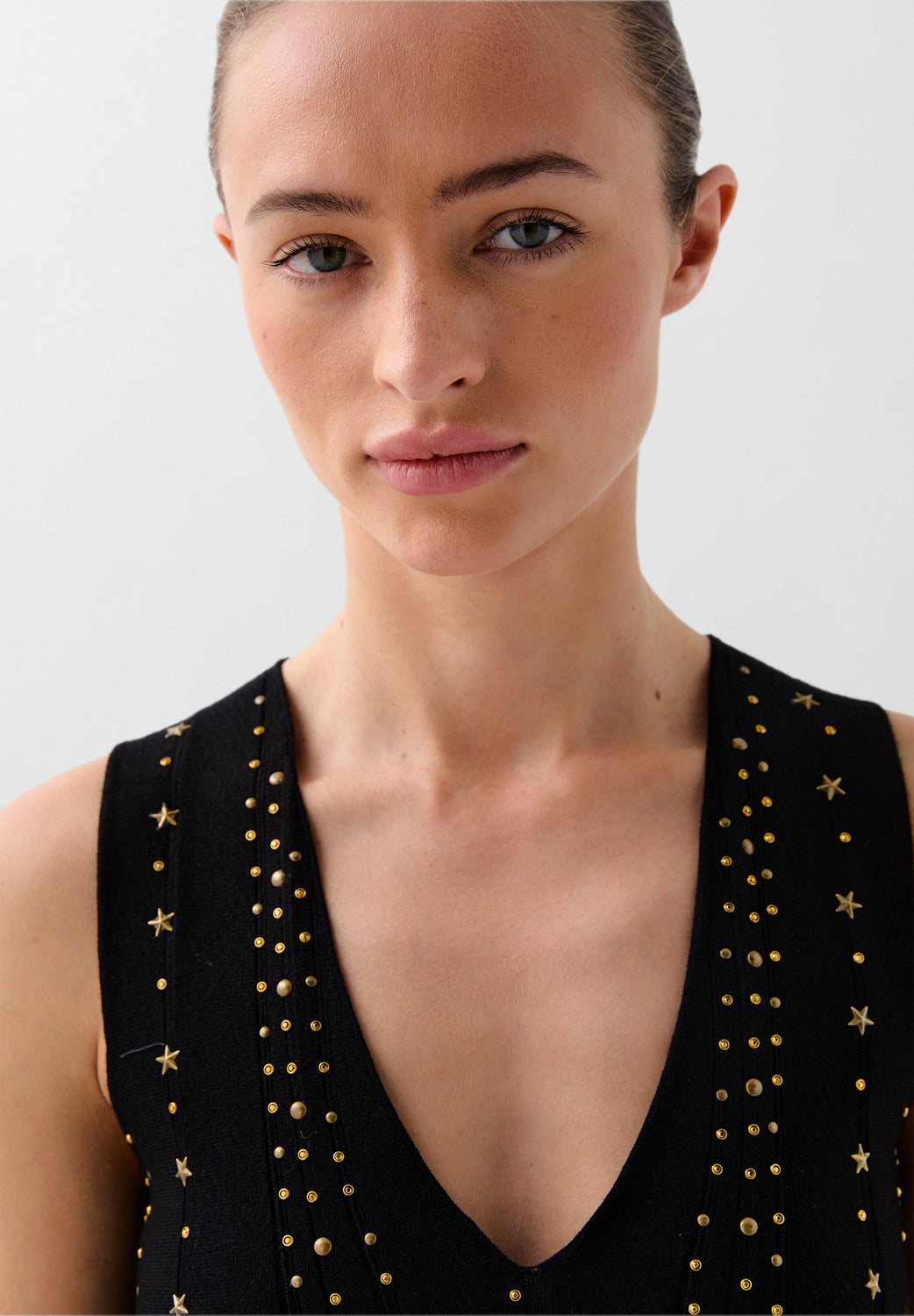Top de punto con detalle de tachuelas. Confeccionado en mezcla de nylon. Corte Regular fit. Escote de pico. Manga en sisa.