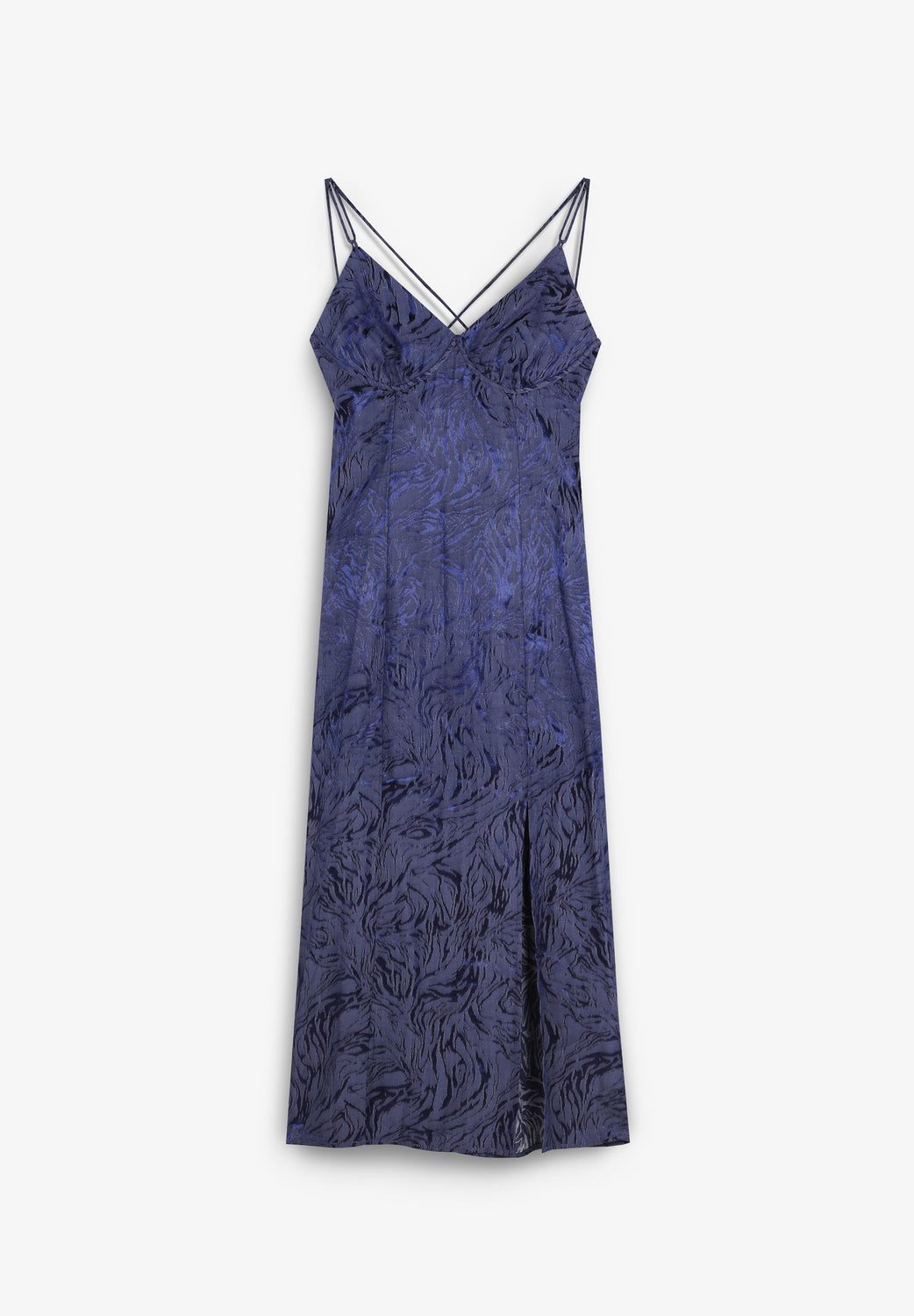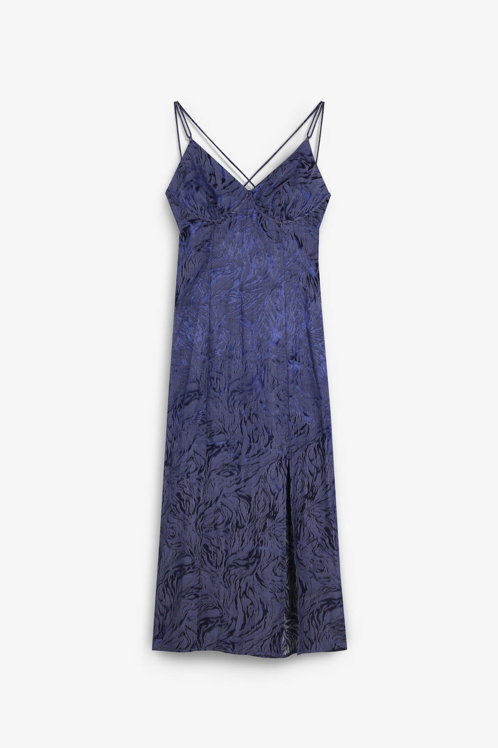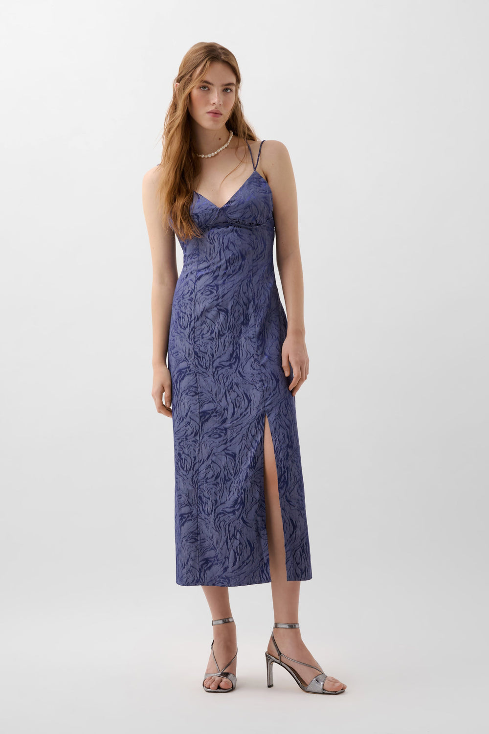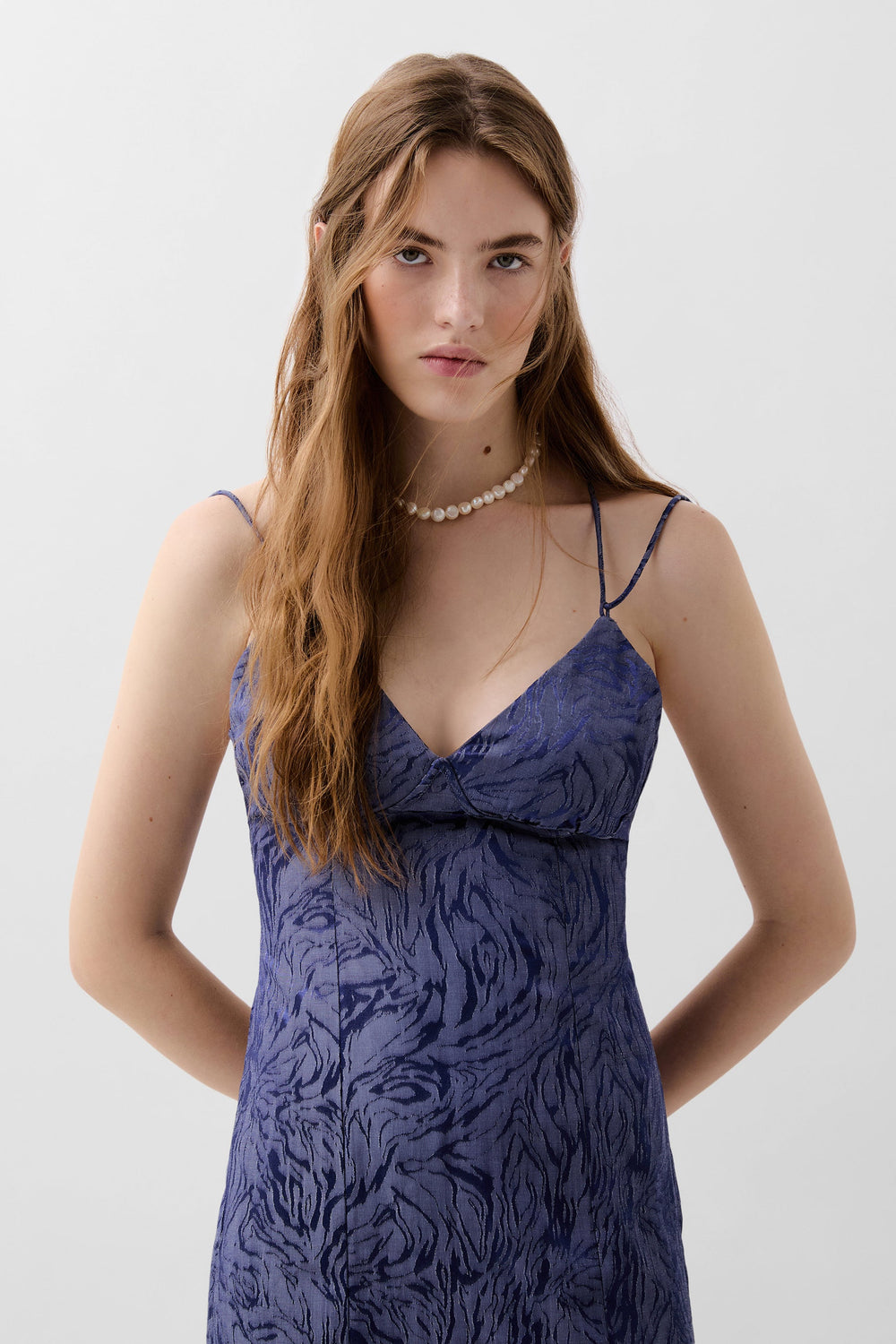 Vestido confeccionado en tejido de jacquard. Slim fit, escote de pico y cierre con cremallera. Tirantes finos que terminan en lazada. Abertura frontal lateral.