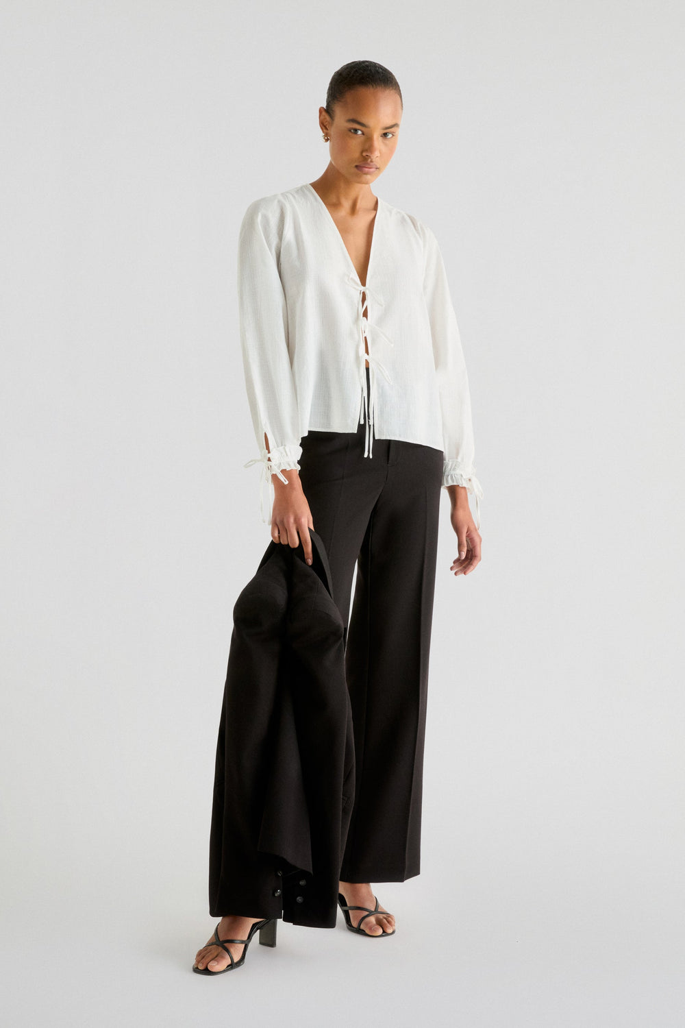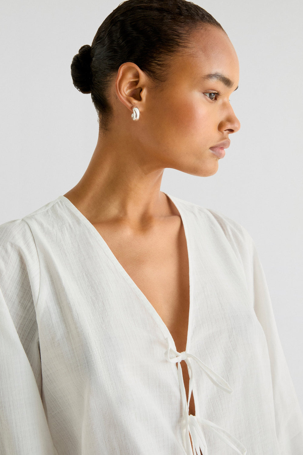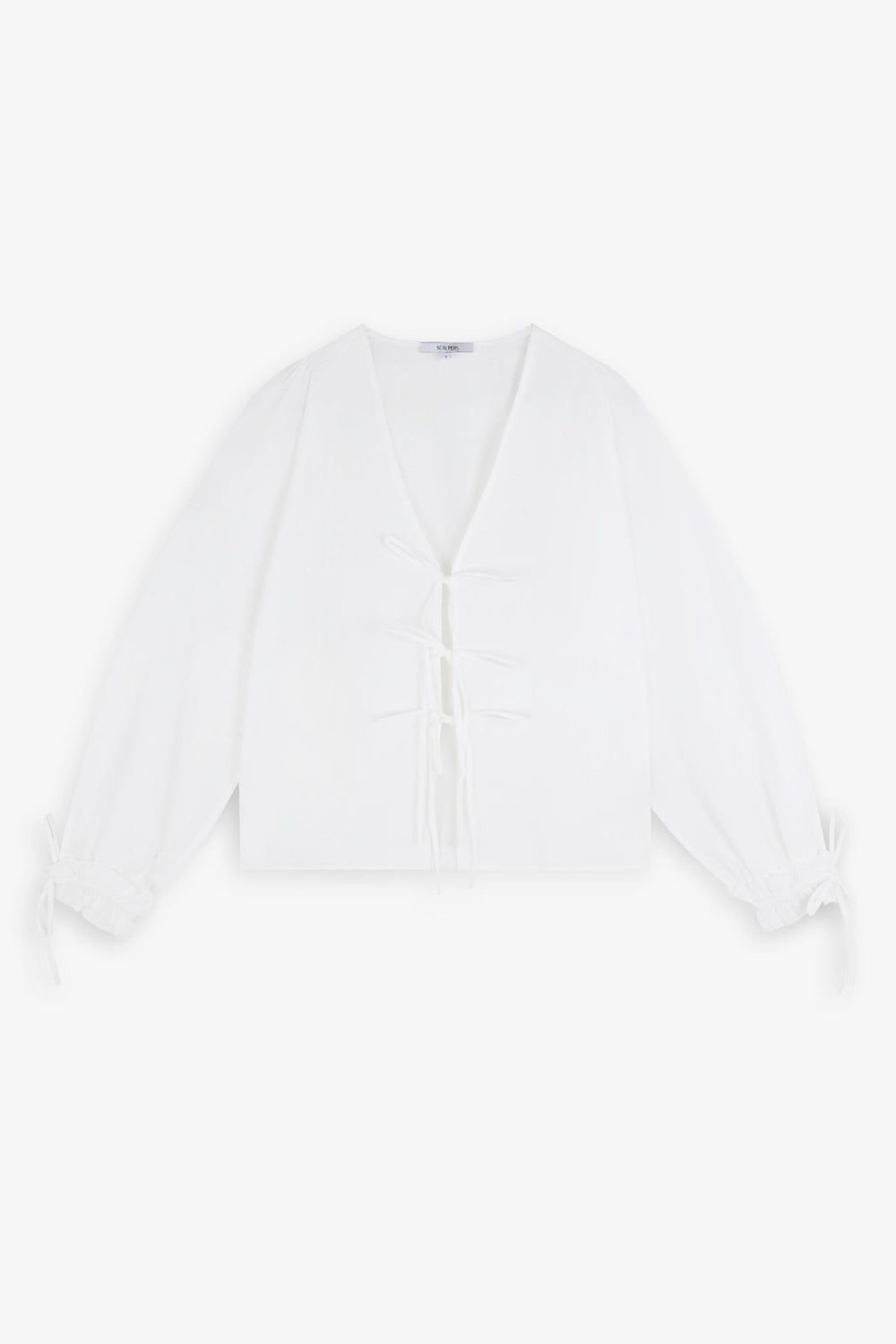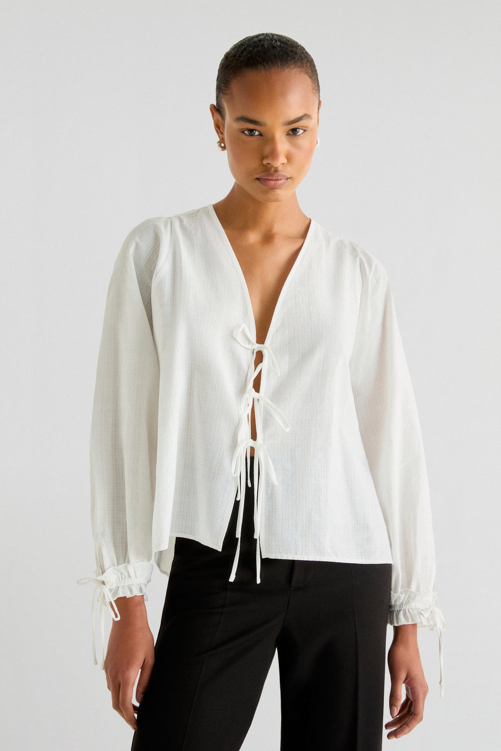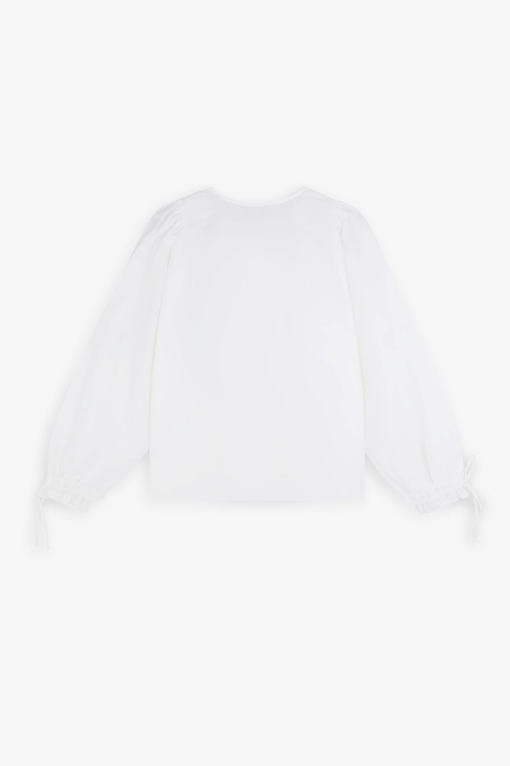 Blusa confeccionada en 100% algodón. Regular fit, escote de pico y cierre con lazadas. Manga larga terminada en frunce y lazo.