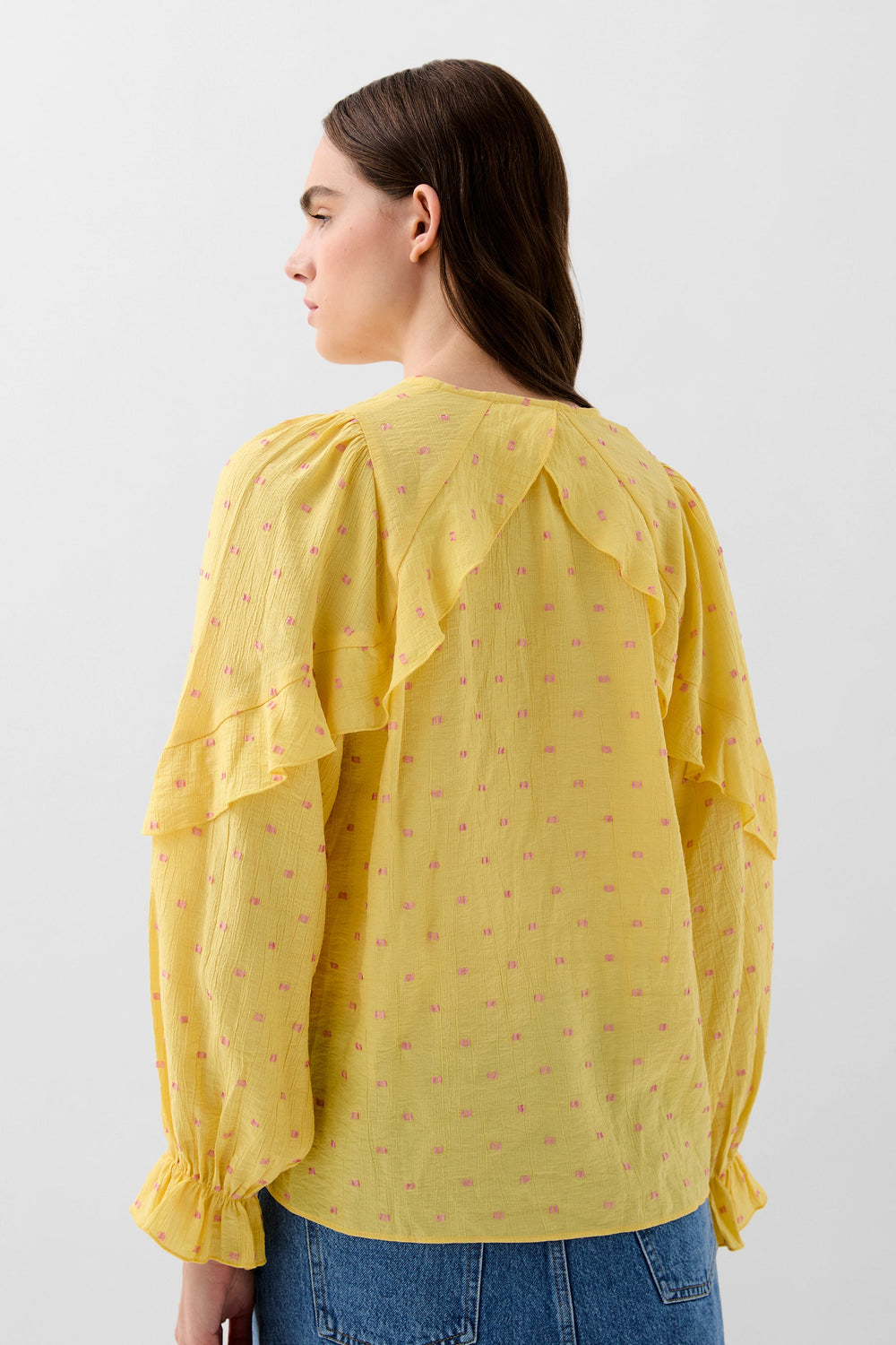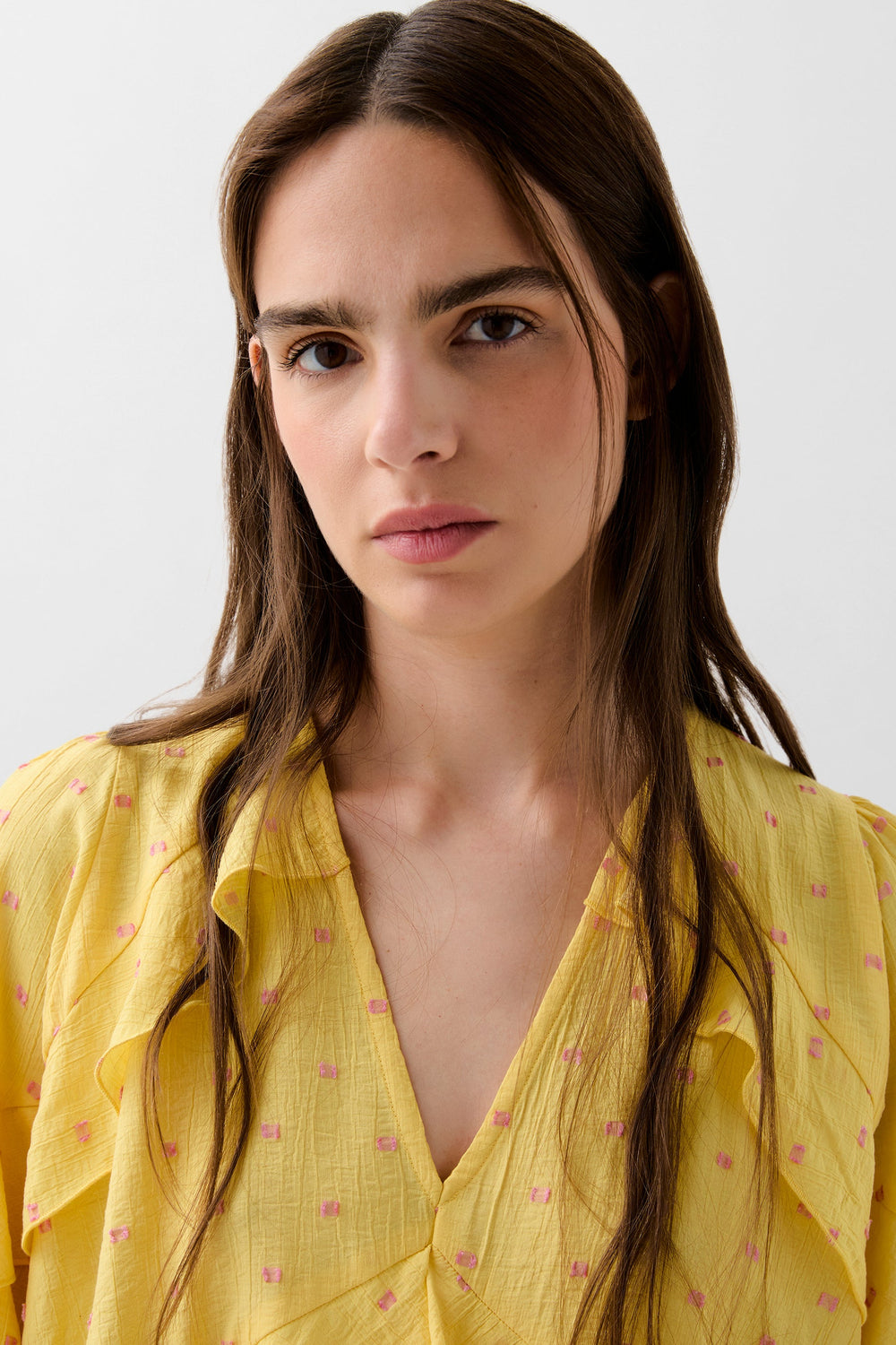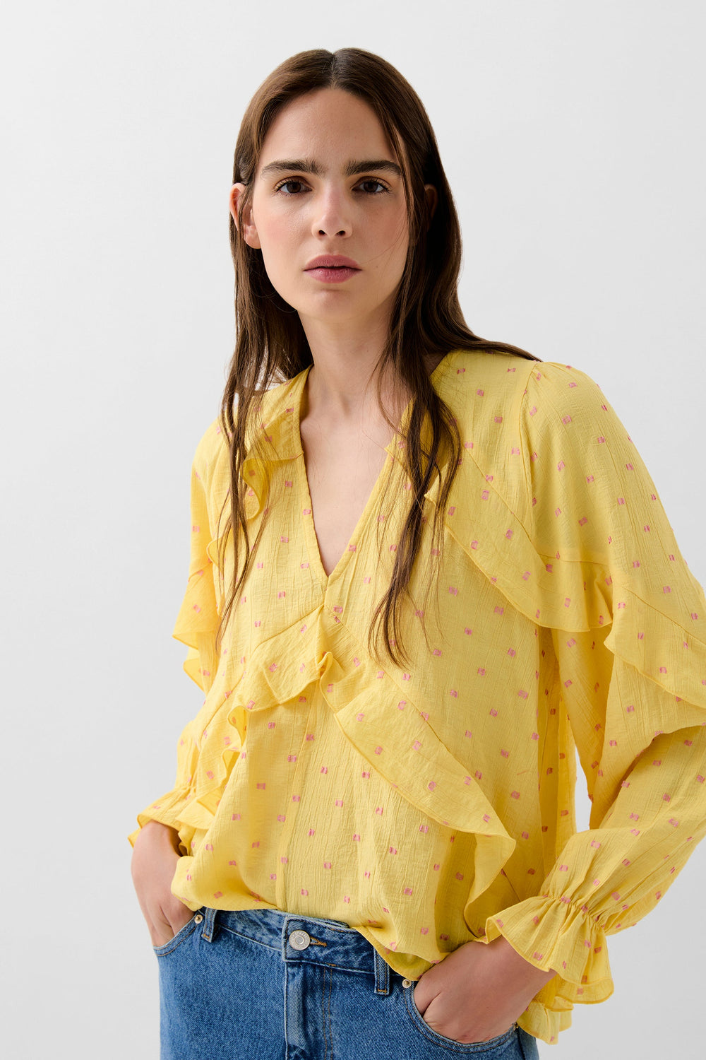 Blusa confeccionada en mezcla de viscosa con detalles de volantes e hilo metalizado. Corte regular fit, escote en V con manga larga terminada en puño con ligero volante.