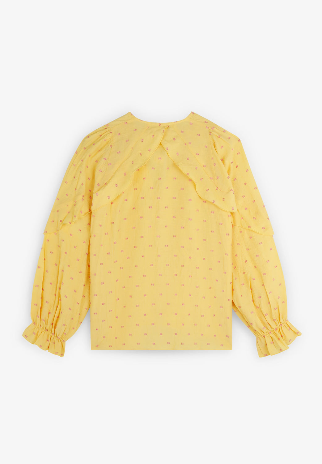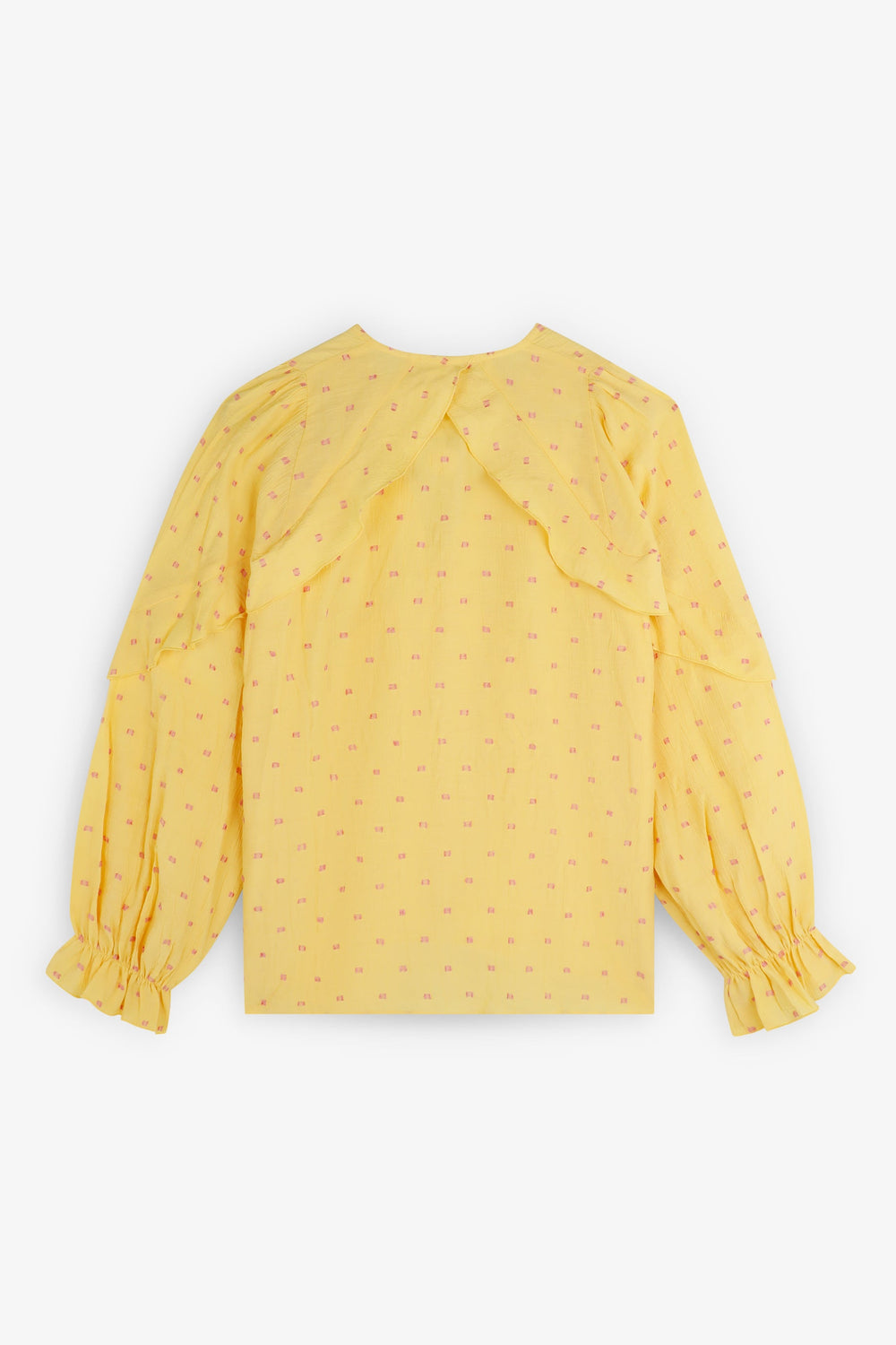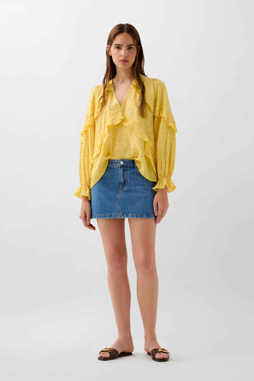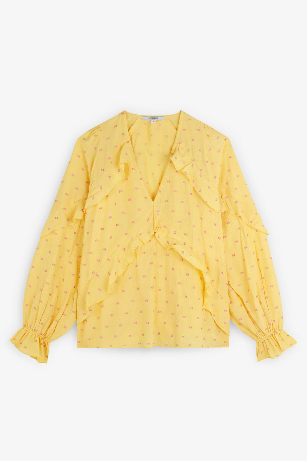 Blusa confeccionada en mezcla de viscosa con detalles de volantes e hilo metalizado. Corte regular fit, escote en V con manga larga terminada en puño con ligero volante.