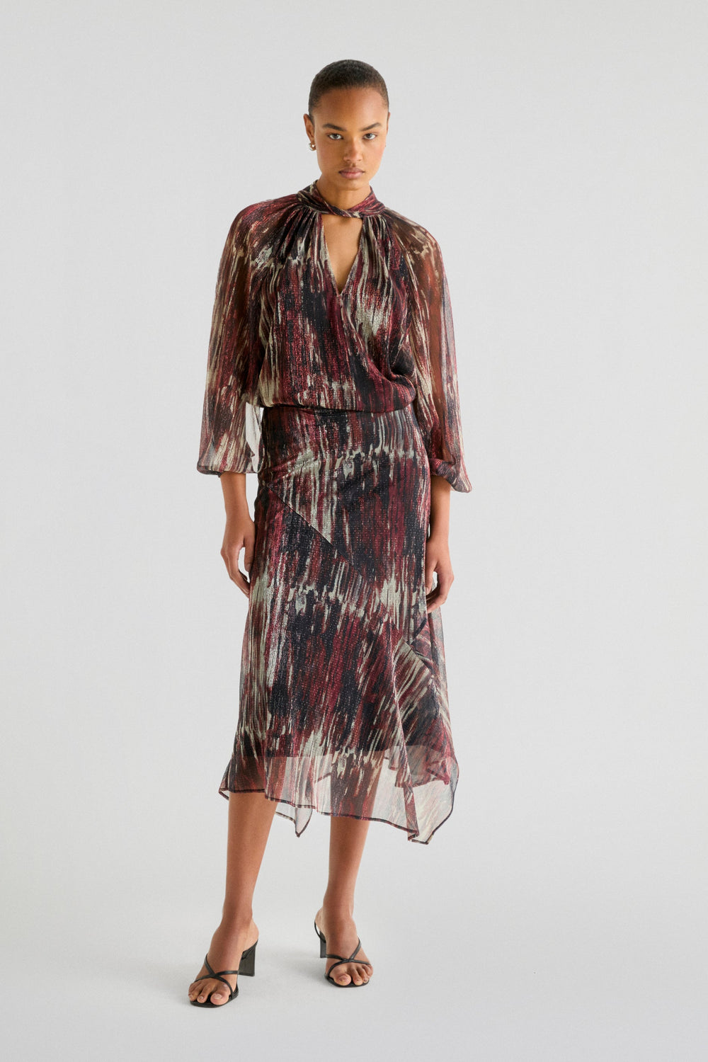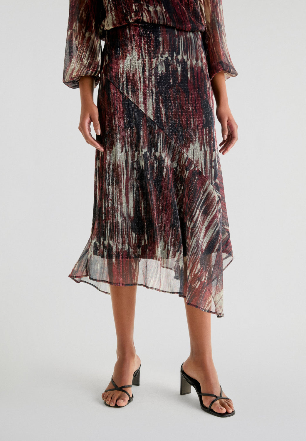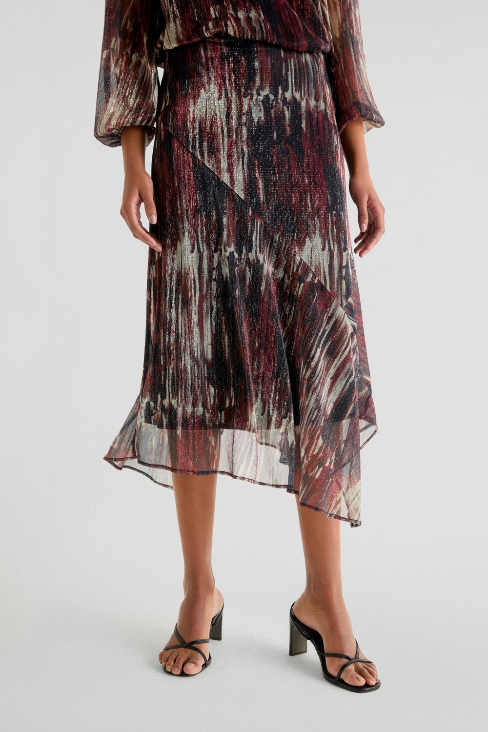 Falda midi confeccionada en tejido fluido con lurex. Regular fit, cierre con cremallera y detalle de cortes.