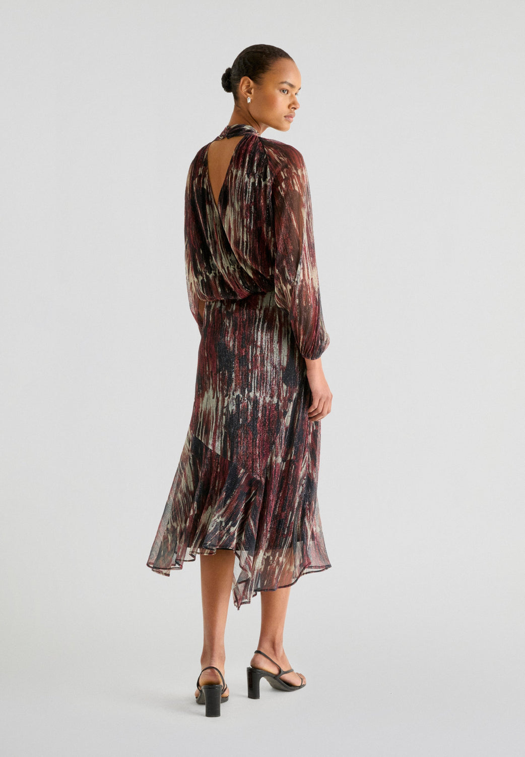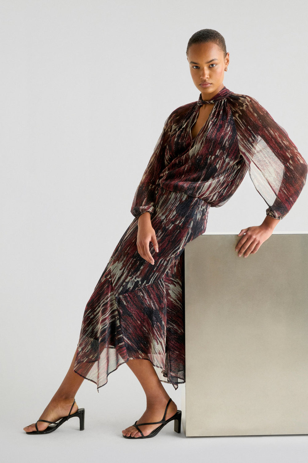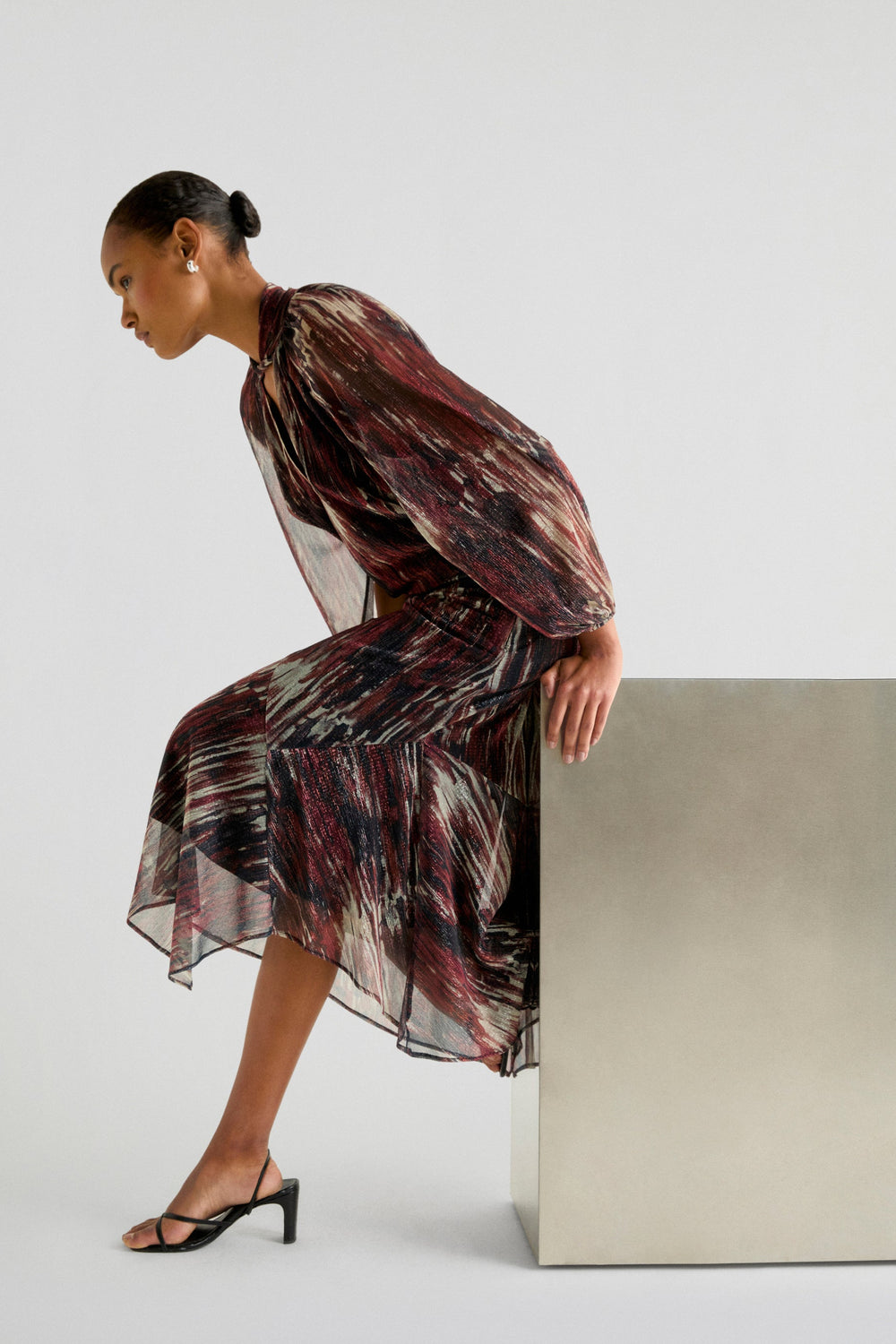 Falda midi confeccionada en tejido fluido con lurex. Regular fit, cierre con cremallera y detalle de cortes.
