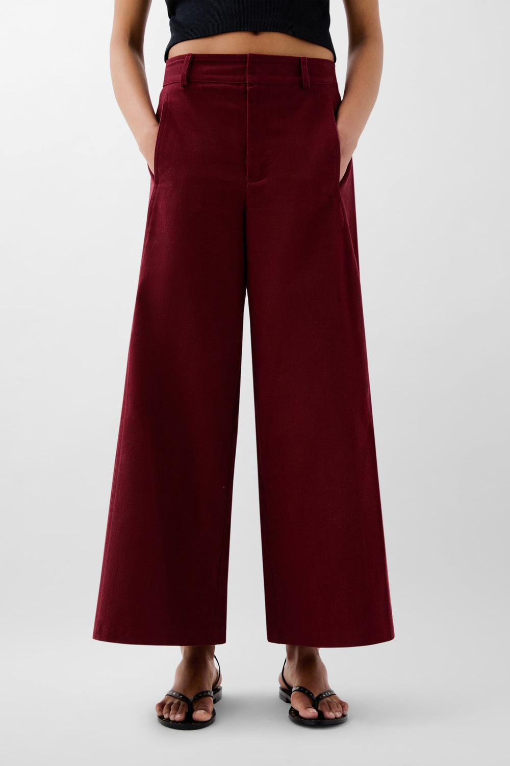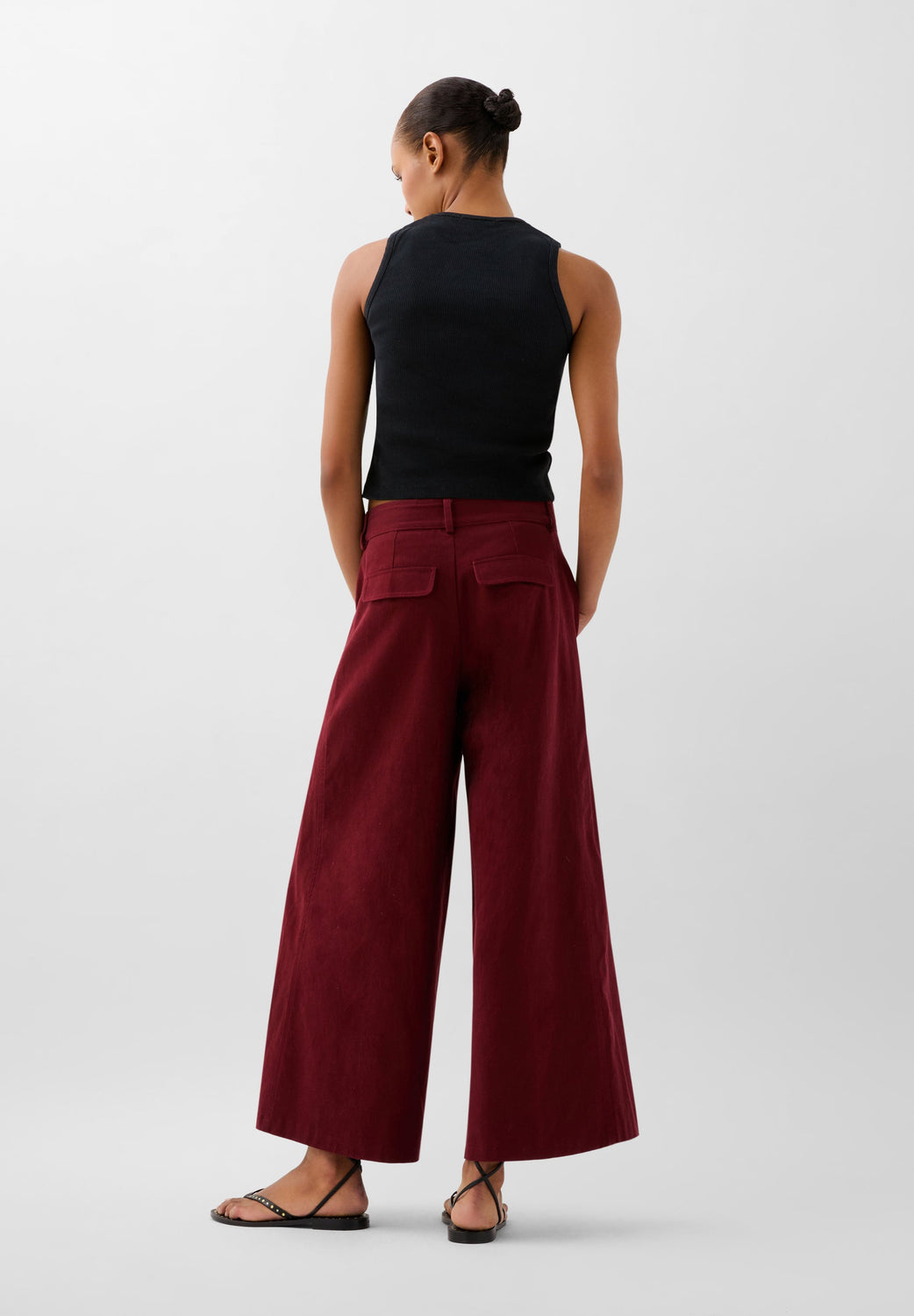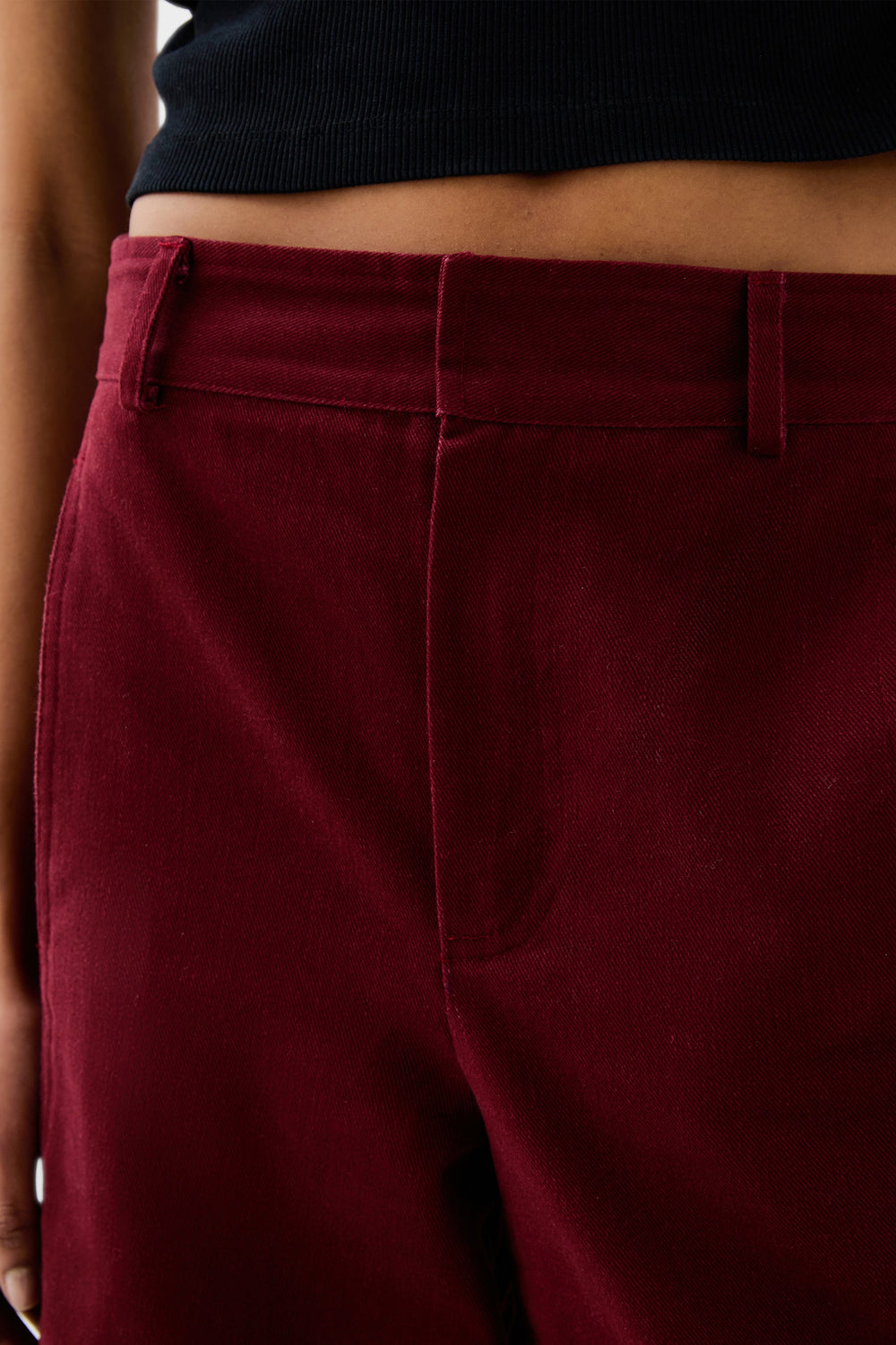 Pantalón confeccionado en 100% algodón. Corte regular fit, culotte, con cierre de cremallera y enganche oculto. Bolsillos delanteros inclinado y traseros de parche. Trabillas en cintura.