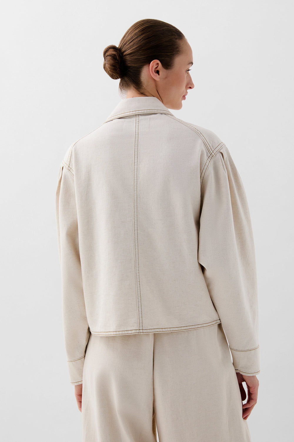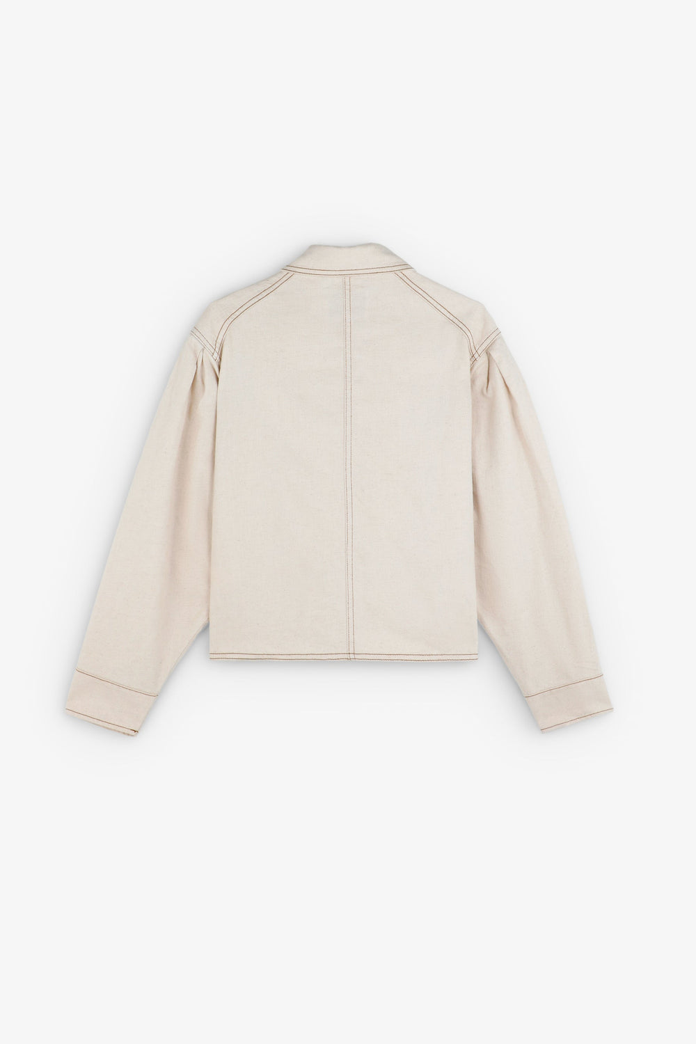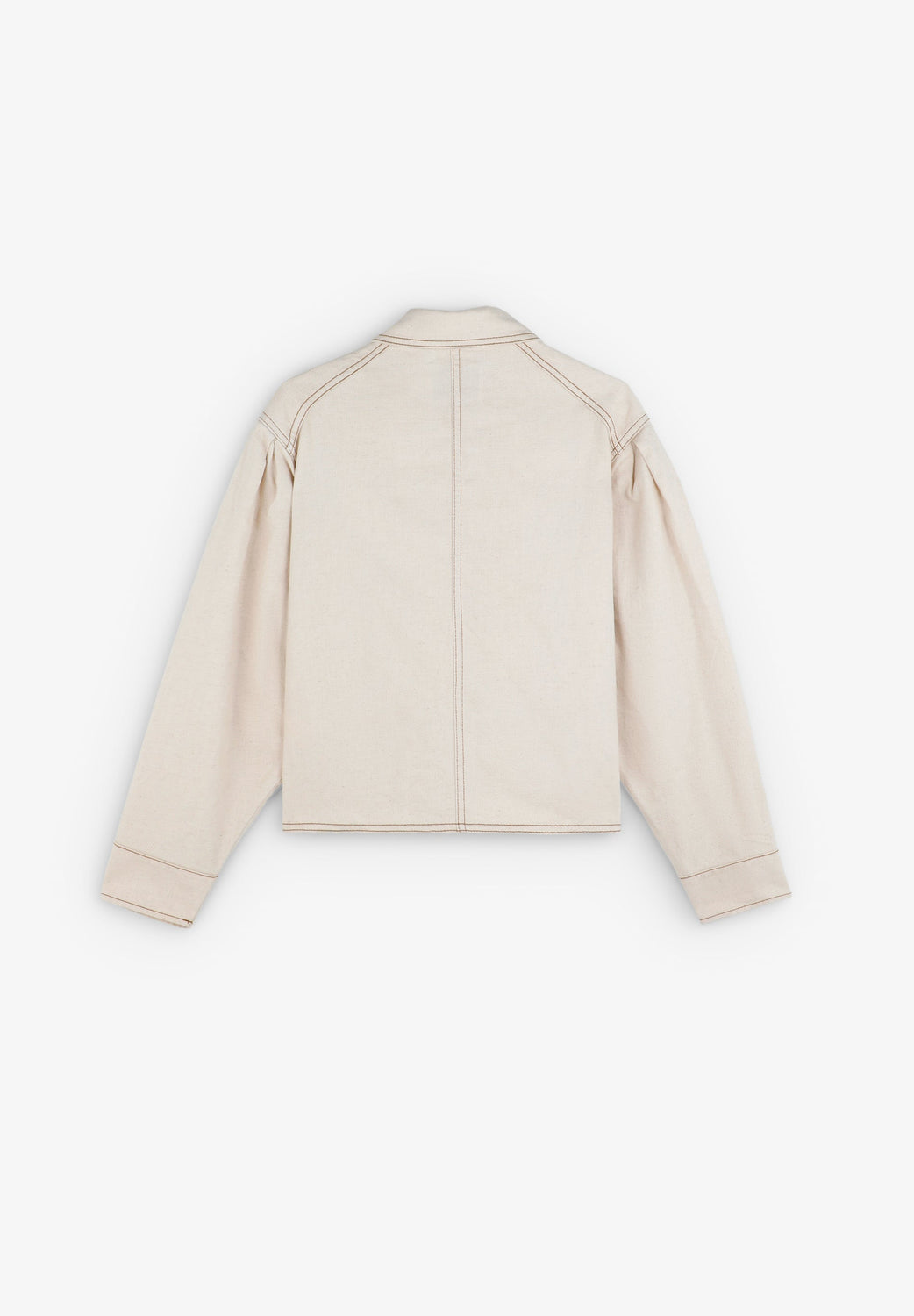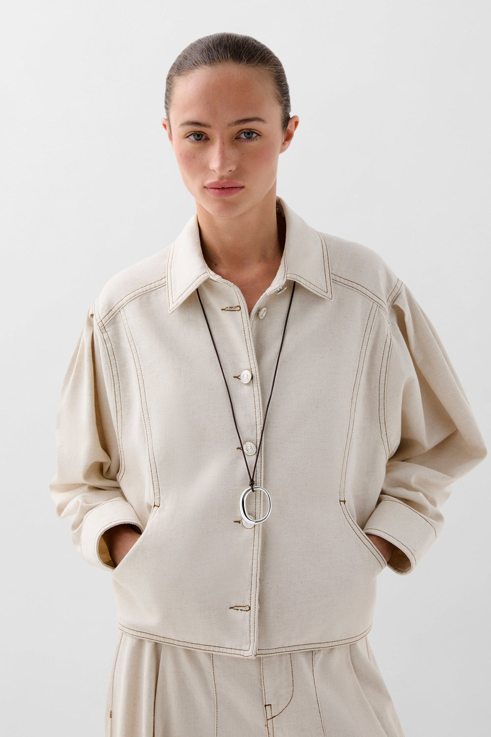 Chaqueta tipo bomber confeccionada con tejido en mezcla de algodón. Consta de cierre por botón en parte delantera. Dos bolsillos laterales. Detalle de costuras a contraste.