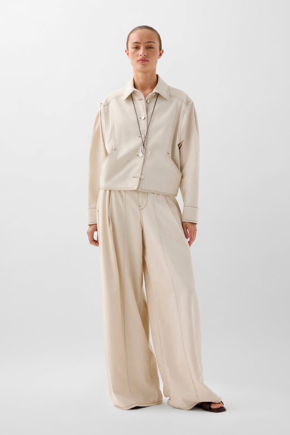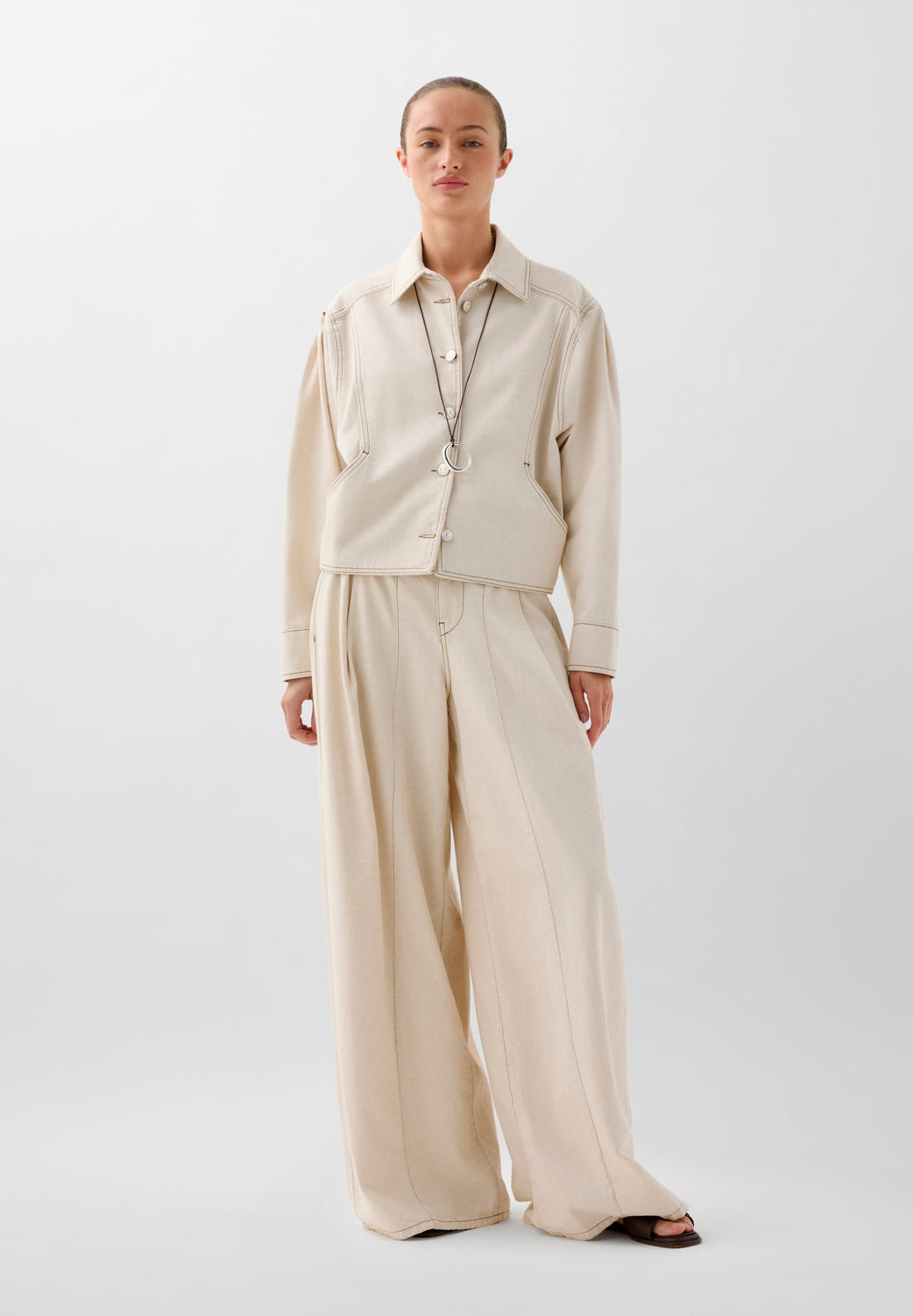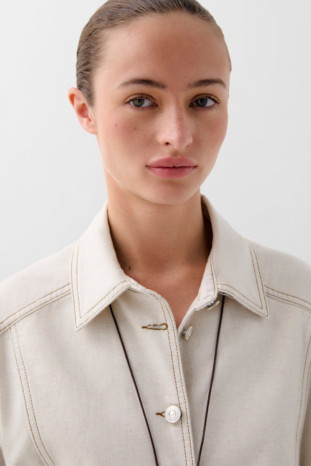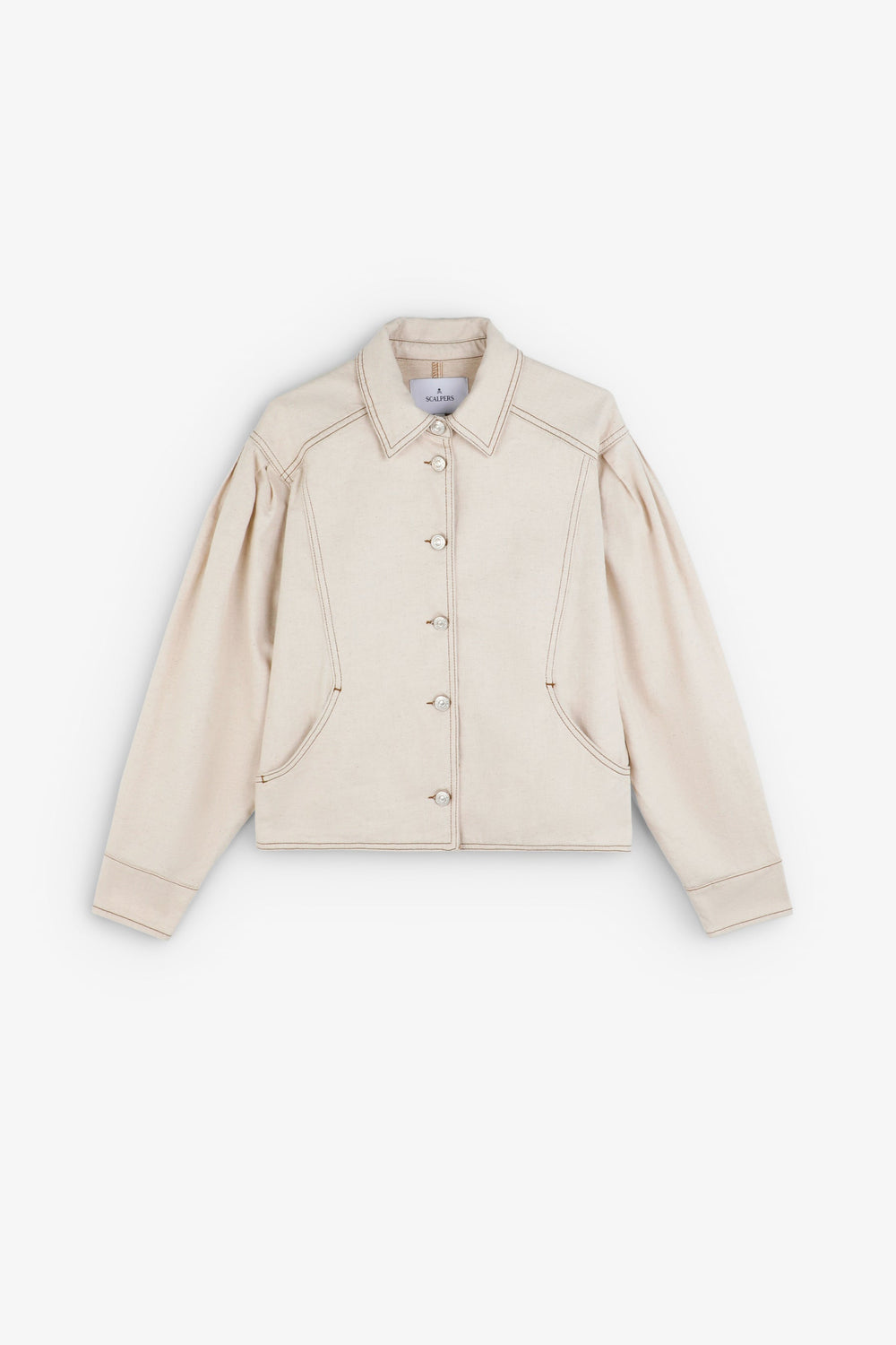 Chaqueta tipo bomber confeccionada con tejido en mezcla de algodón. Consta de cierre por botón en parte delantera. Dos bolsillos laterales. Detalle de costuras a contraste.
