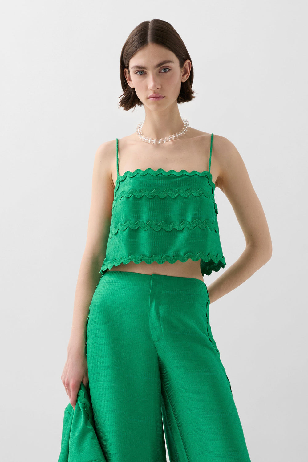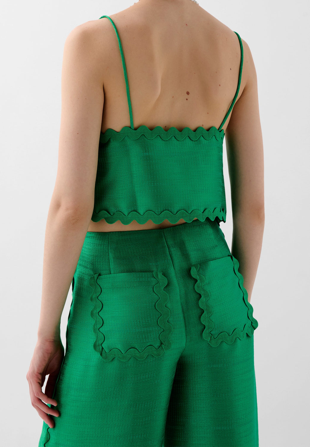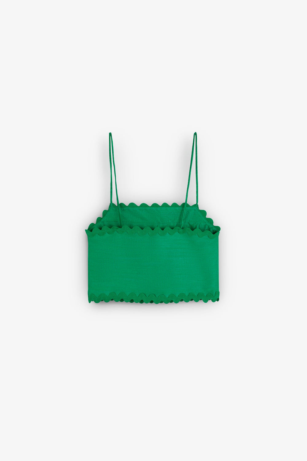 Top confeccionado en tejido satinado con detalle de ondas. Corte Cropped, con tirantes finos.