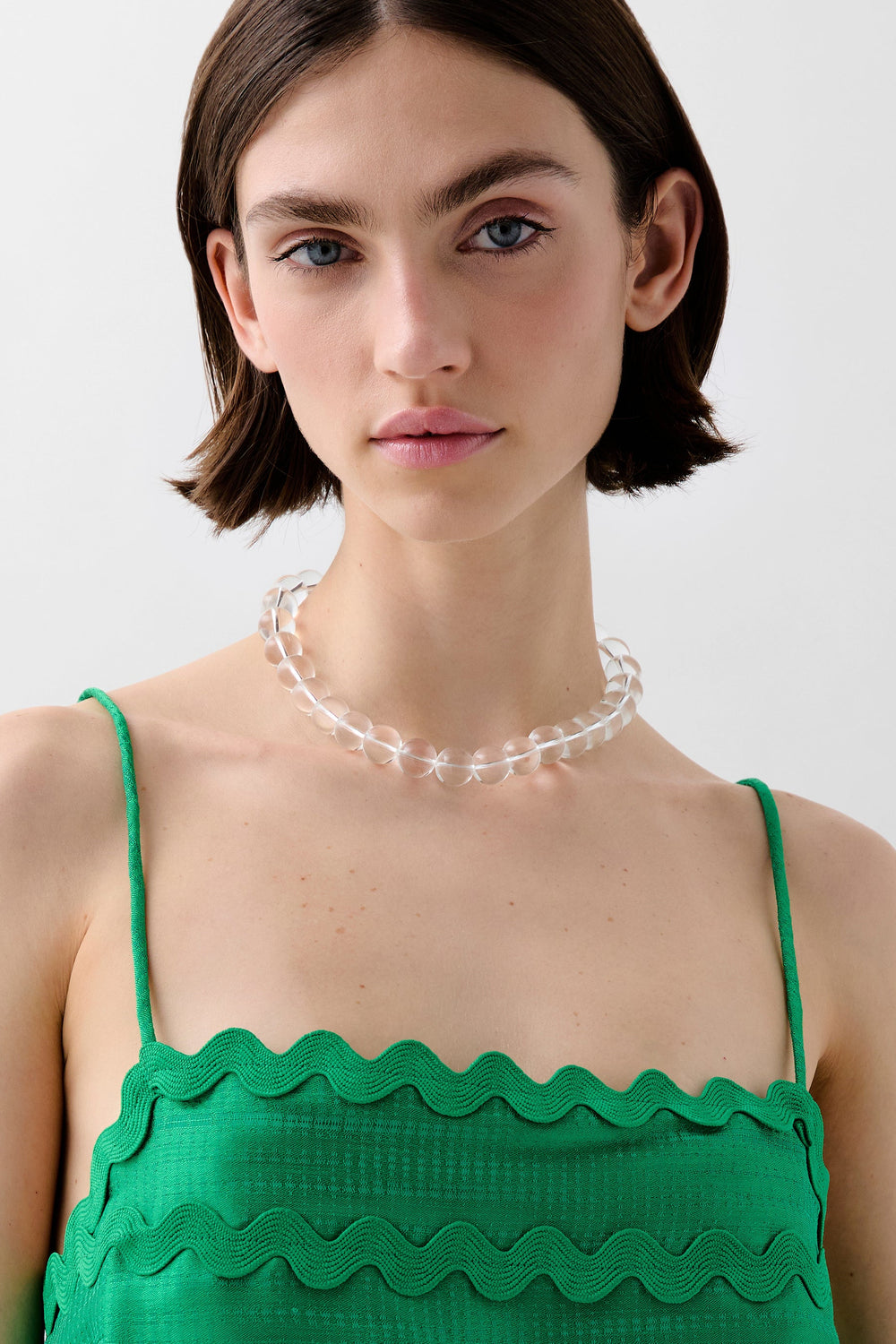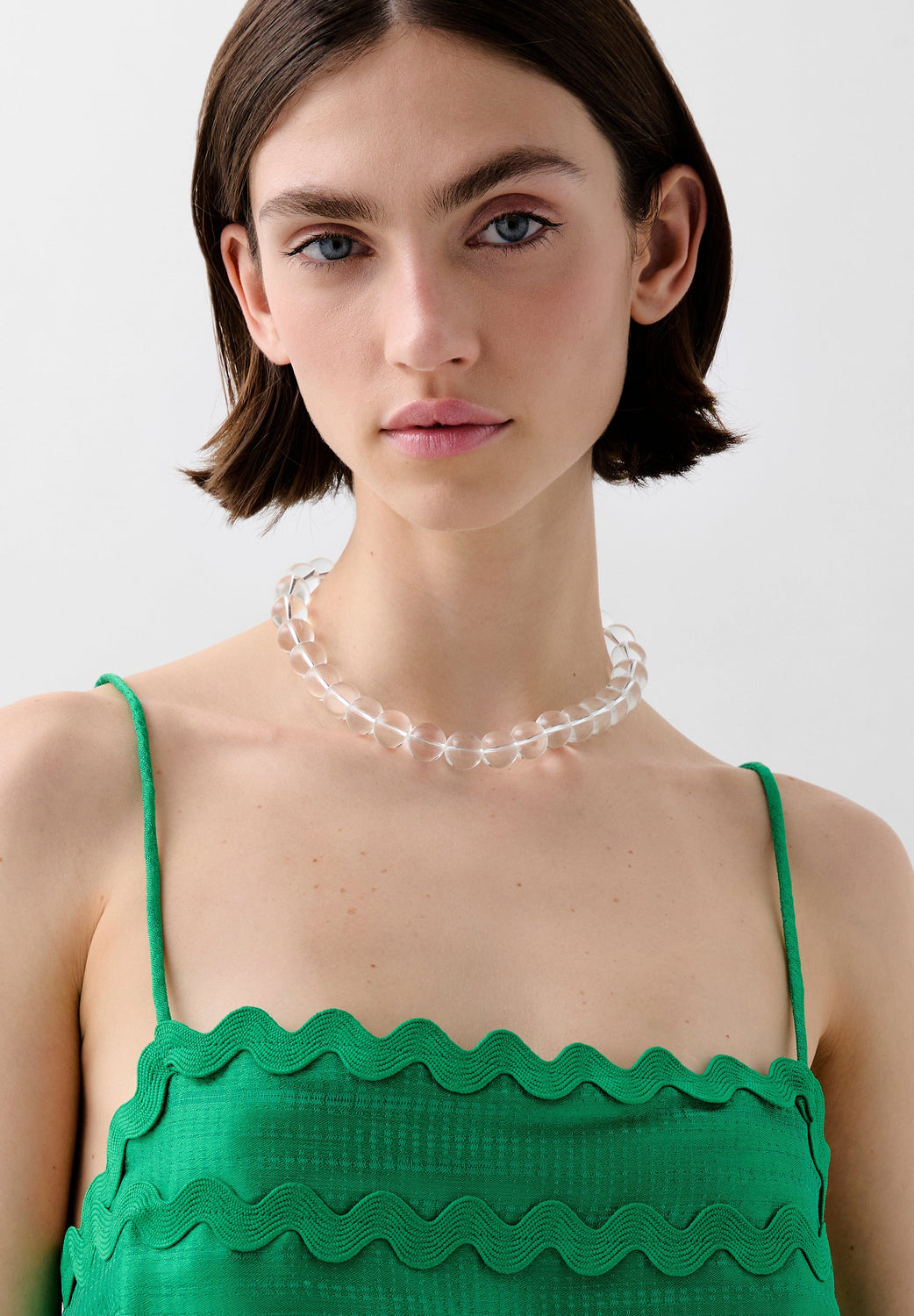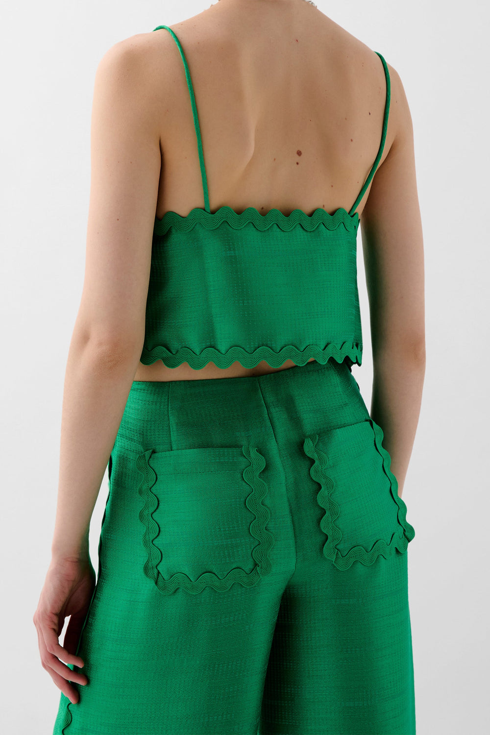 Top confeccionado en tejido satinado con detalle de ondas. Corte Cropped, con tirantes finos.