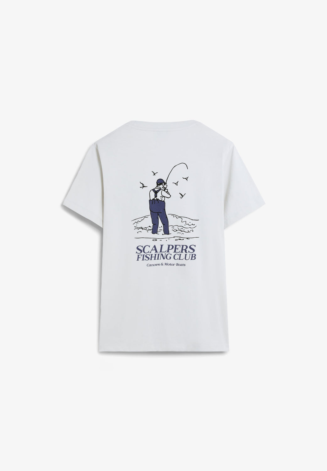 Polera Print Pescador de Scalpers para hombre. Pertenece a la categoría Poleras Manga Corta / Cuello Redondo. Temporada AW26. Color: LIGHT GREY. Camiseta confeccionada en 100% algodón BCI. Manga corta. Regular Fit. Cuello redondo. Print frontal y espalda con logo.