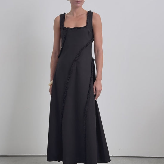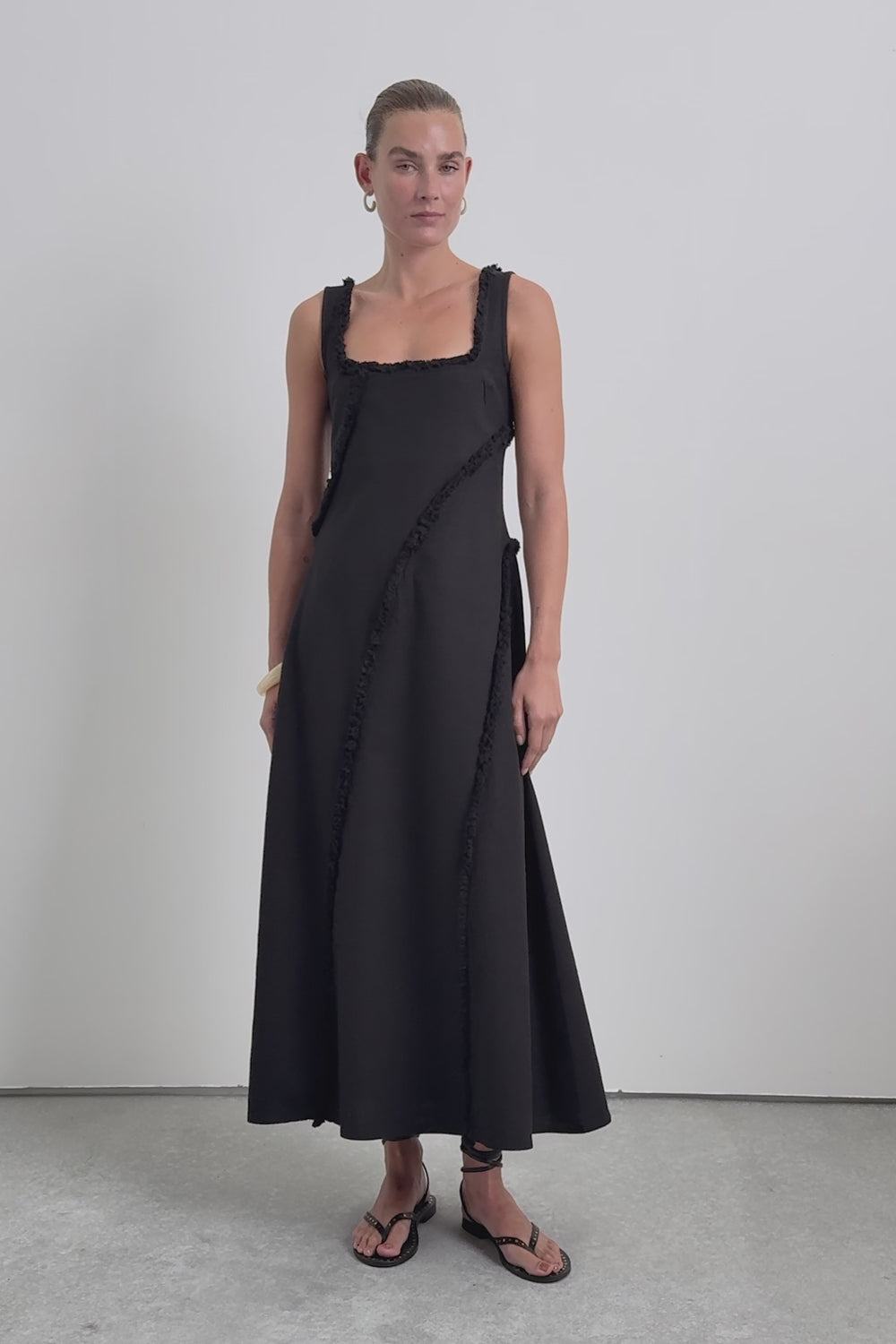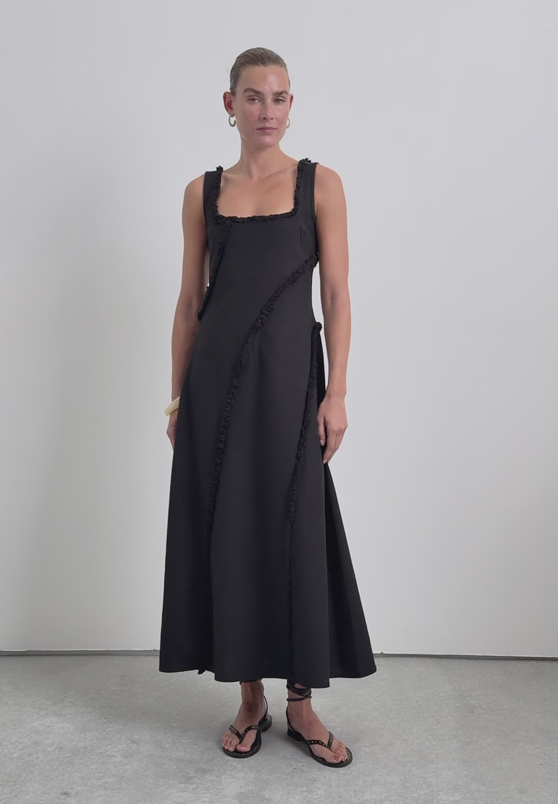 Vestido Flecos Despuntados de Scalpers para mujer. Pertenece a la categoría Vestidos / Vestidos Largos. Temporada AW26. Color: BLACK. Vestido midi confeccionado en 100% Algodón Orgánico BCI. Tirantes. Escote cuadrado. Detalle de flecos despuntados.